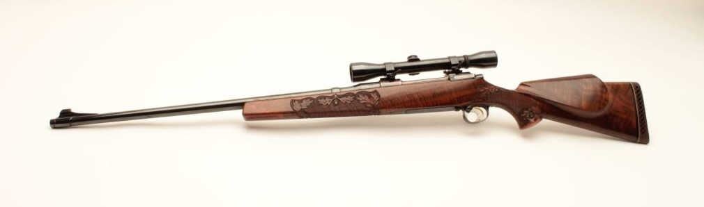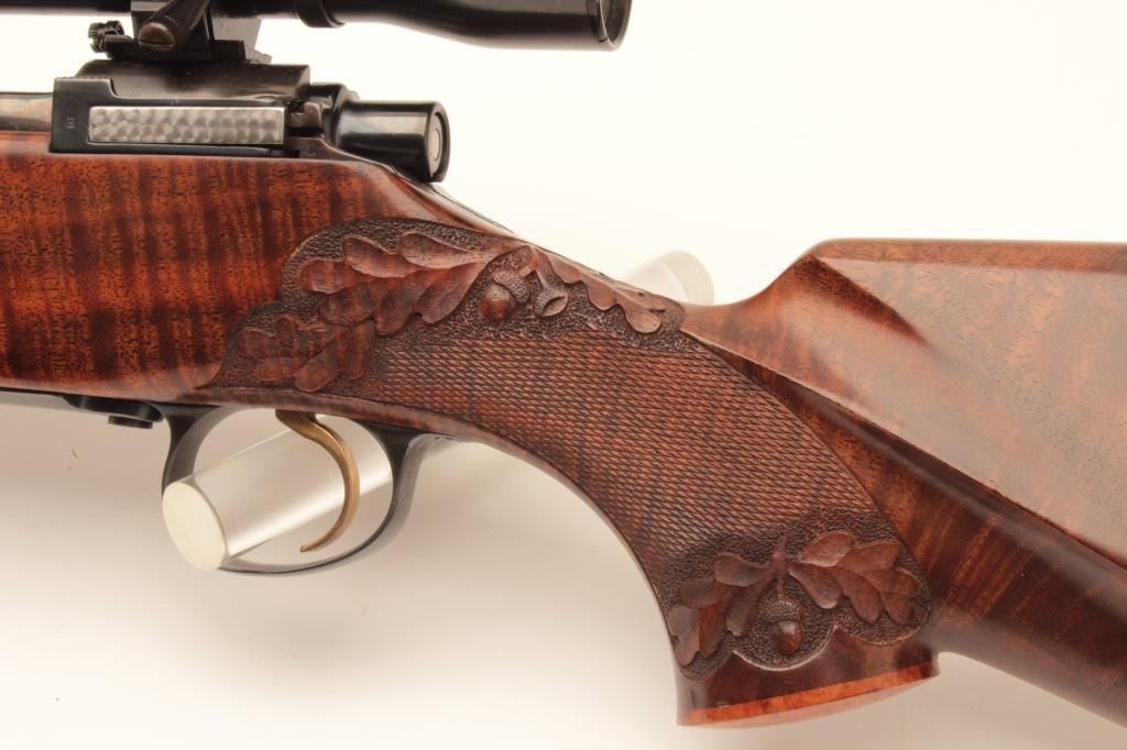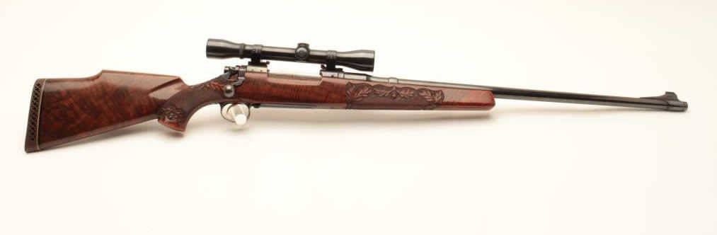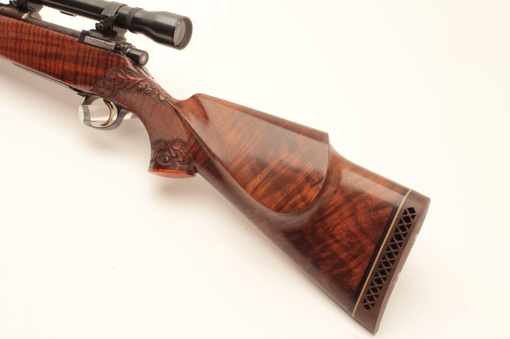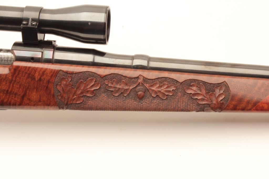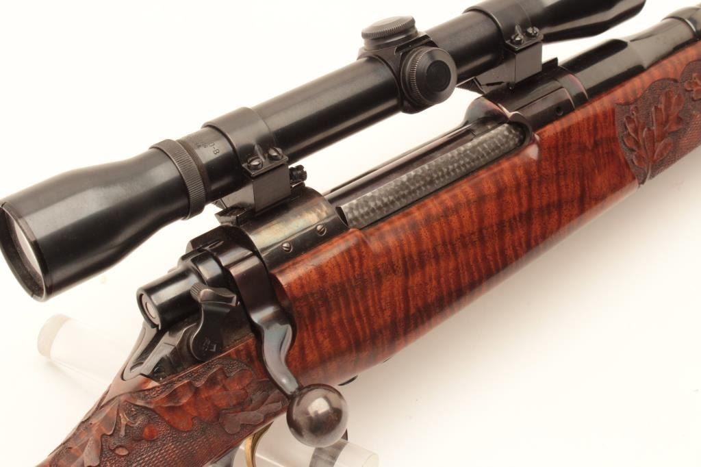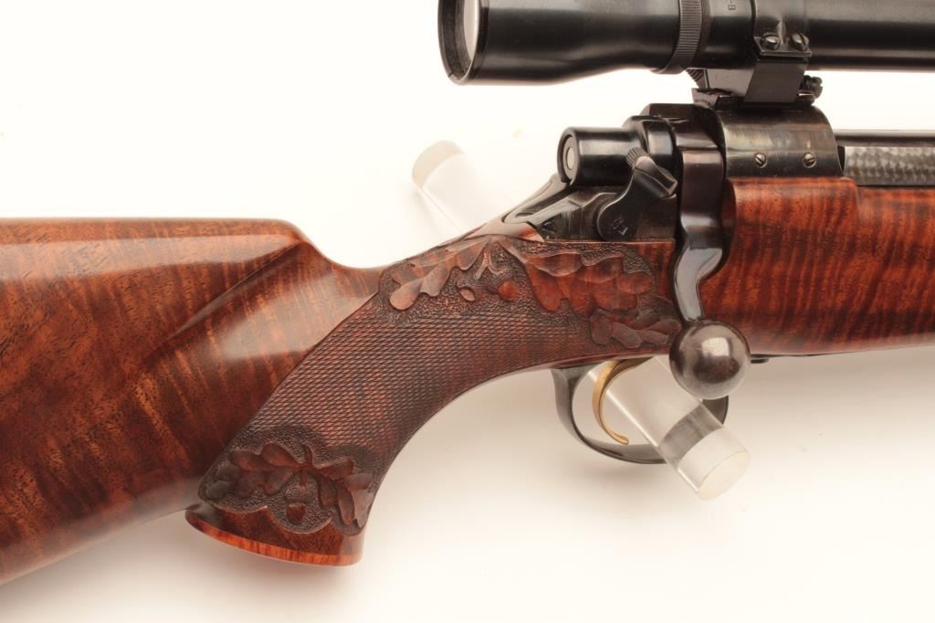 Classic custom Sporting rifle on a P-17 Enfield action in .375 H&H mag. caliber, no visible S/N, Germanic carved burl stock, Leupold detached mounts and Weaver 4X scope; near fine condition overall; ca. 1950’s-60’s Lot Title styling; thousands of dollars to replace. (C&R). Est.: $800-$1,600.