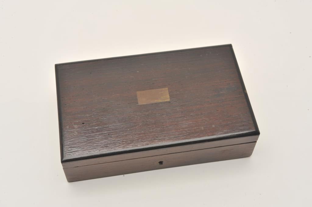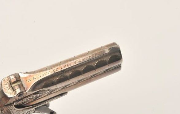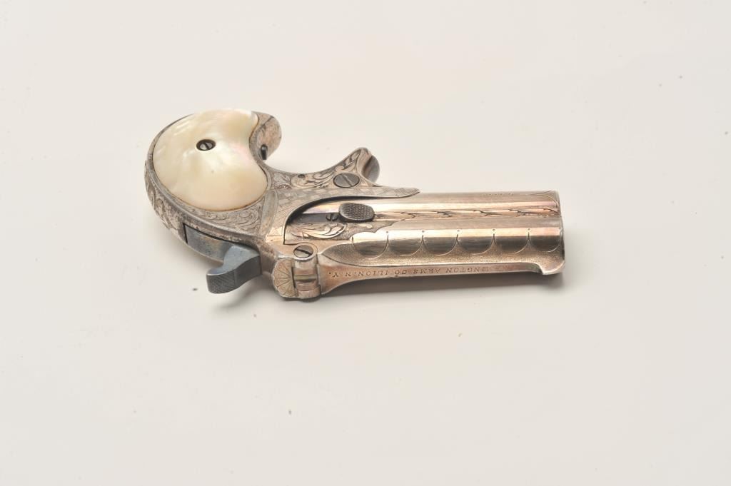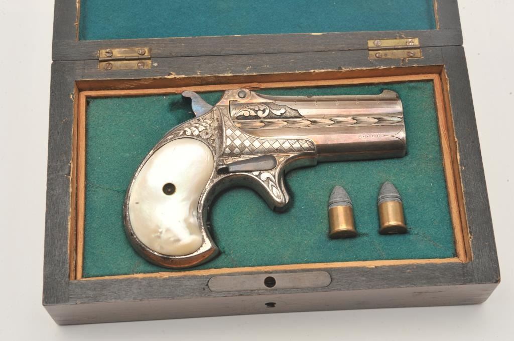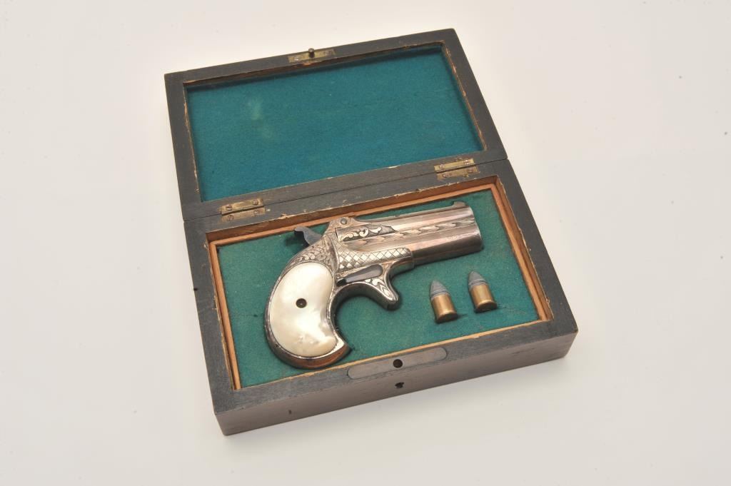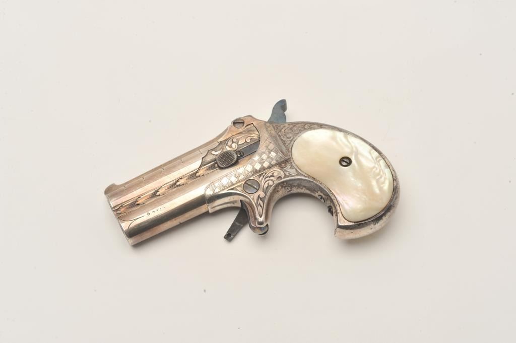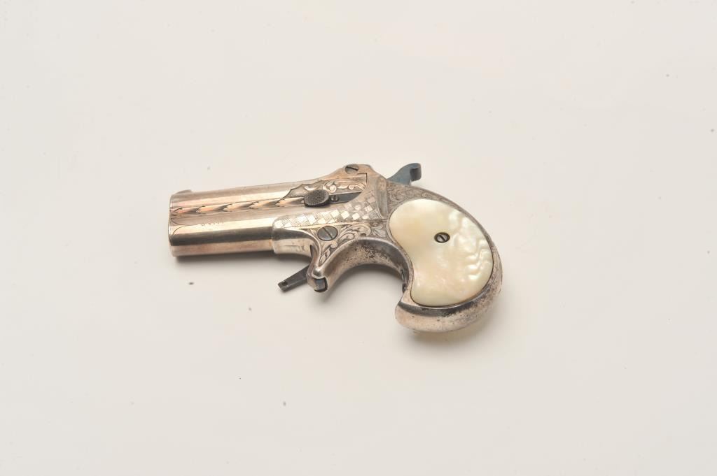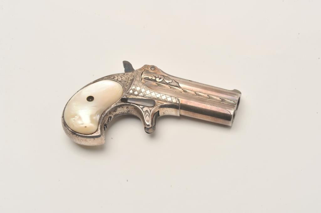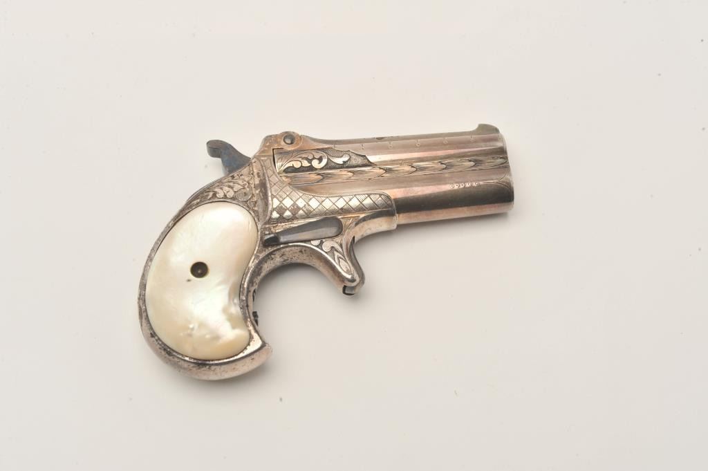 Remington Double Derringer with 1 line slant address, S/N 197. Very finely acid etched and engraved possibly by Tiffany and featured on the cover of Drummond’s book. The derringer shows 90%-95% original silver with minor loss Lot Title on the straps. Bright blue on the hammer and small parts. Excellent original pearls with rainbow hues. Extremely fine engraving. Contained within a rosewood case with felt lining in good condition with 2 dummy Lot Title cartridges. The collection of Doug Drummond with a copy of his book. (Antique) Est.: $5000-$8000
