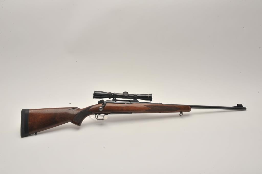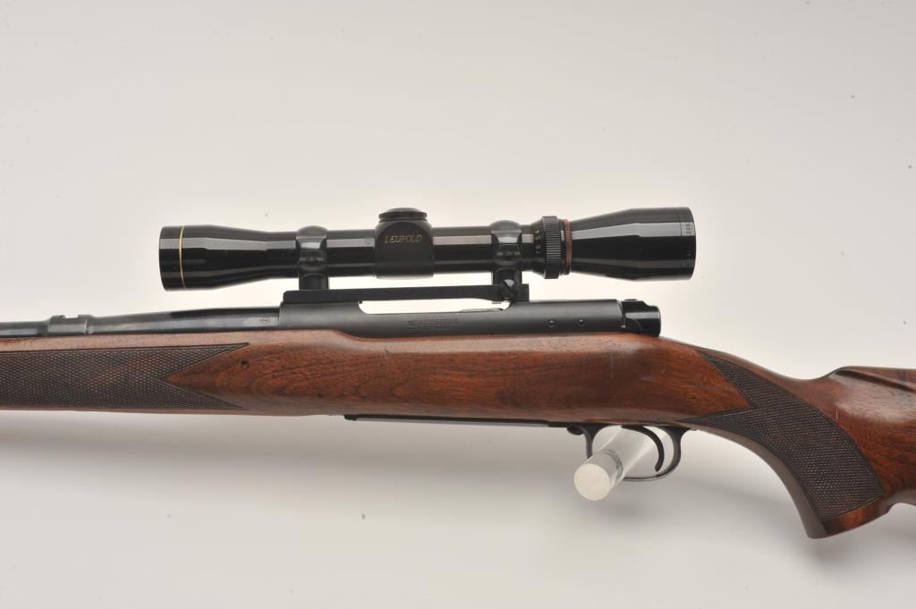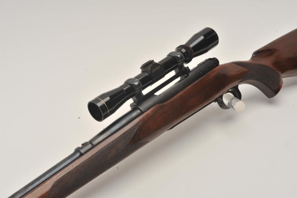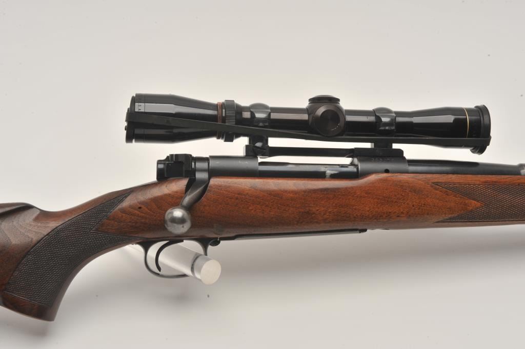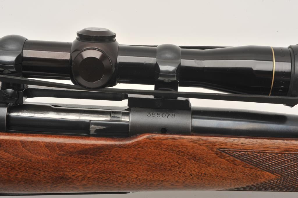 Pre-64 Winchester Model 70 bolt action rifle, .257 Roberts caliber, Serial #385078. The rifle is in fine overall condition with a 24” barrel with a hooded ramp front sight and the rear has been removed. The barrel and Lot Title receiver retain nearly all of their original blue finish with wear at the muzzle and thinning of finish on the trigger guard and magazine floor plate. The checkered wood stock is in very good condition with small Lot Title mars and compressions consistent with carry and use. The butt stock has been professionally extended with a black spacer and rubber recoil pad to provide a 13 ½” LOP. The rifle is topped by a Redfield one-piece Lot Title mount with a Leupold Vari-X II 2 x 7 variable power rifle scope with crisp, clean optics. The bore is very good, the action crisp and markings are sharp on this desirable Pre-64 Model 70 chambered in the Lot Title great .257 Roberts cartridge. Est.: $1,250-$2,500. (C+R).