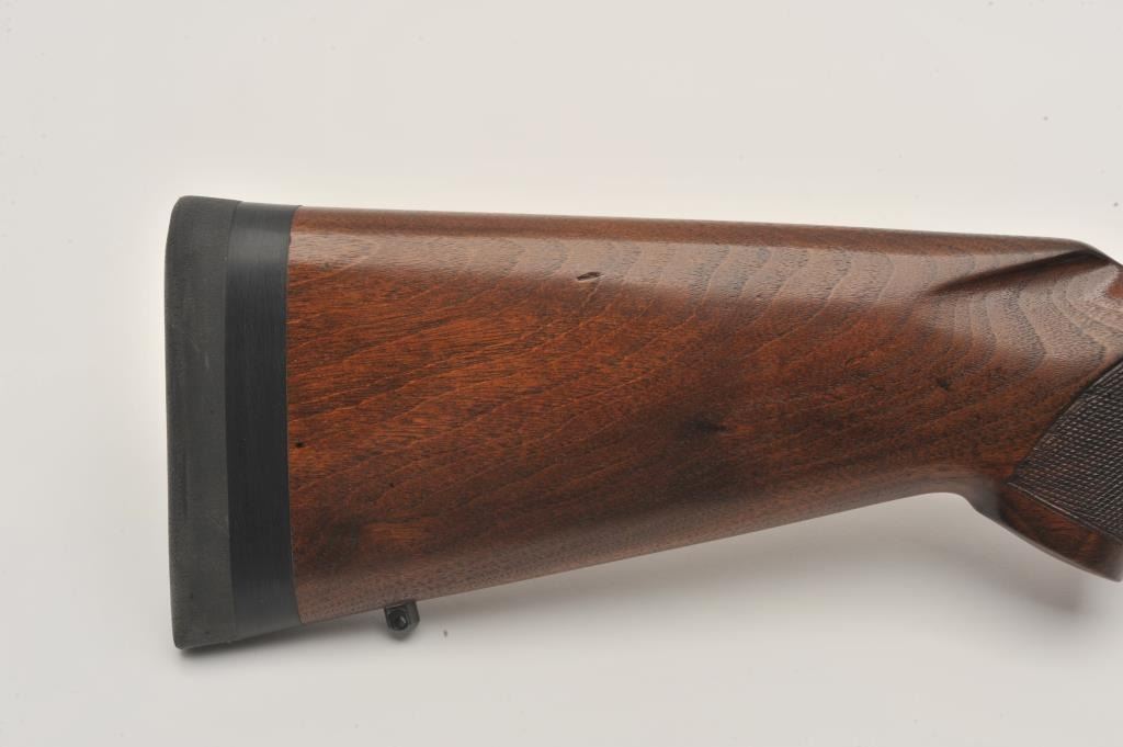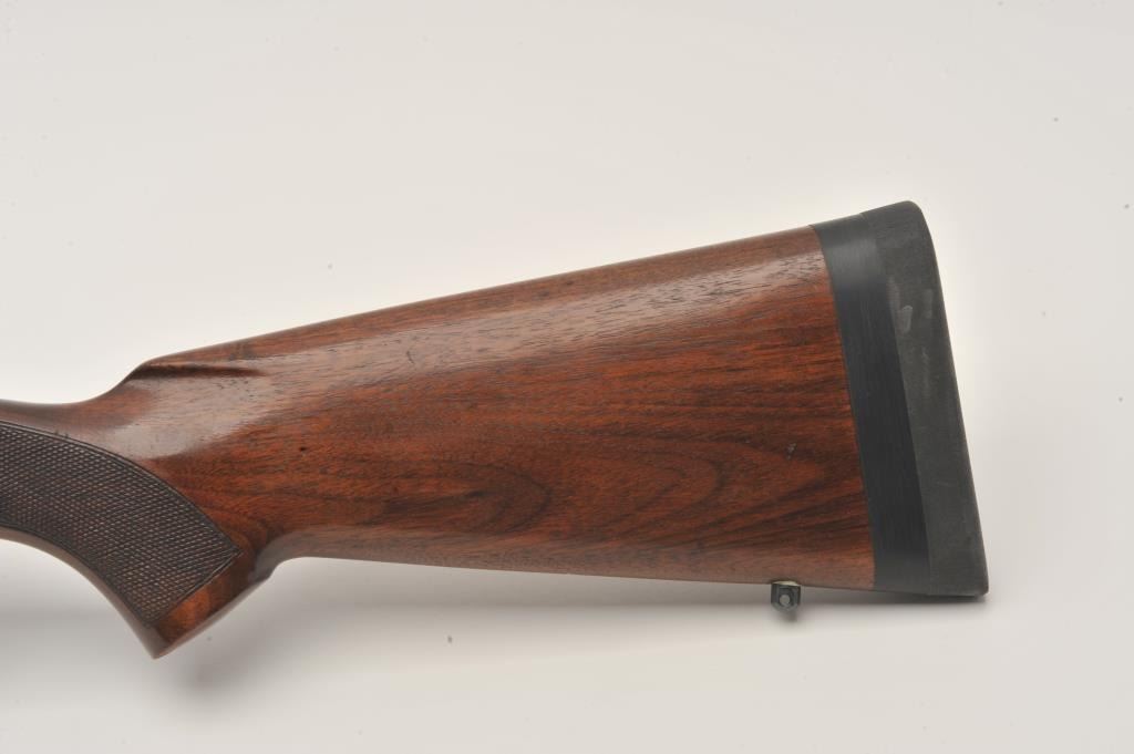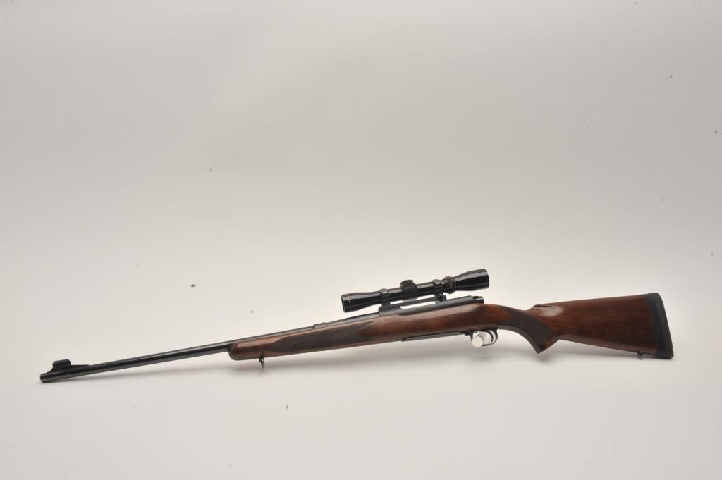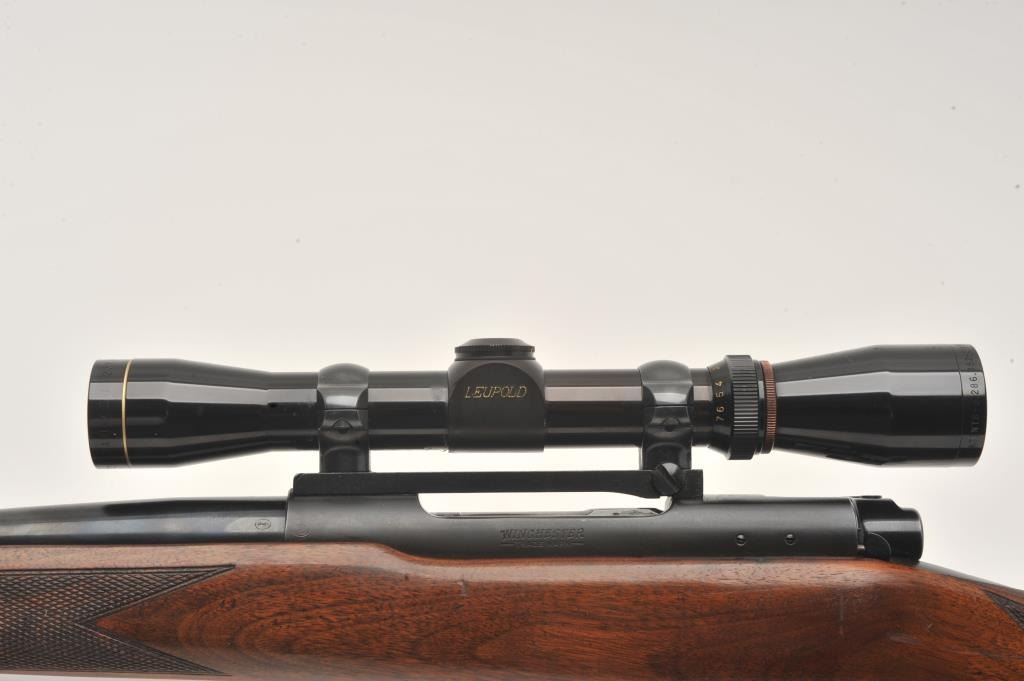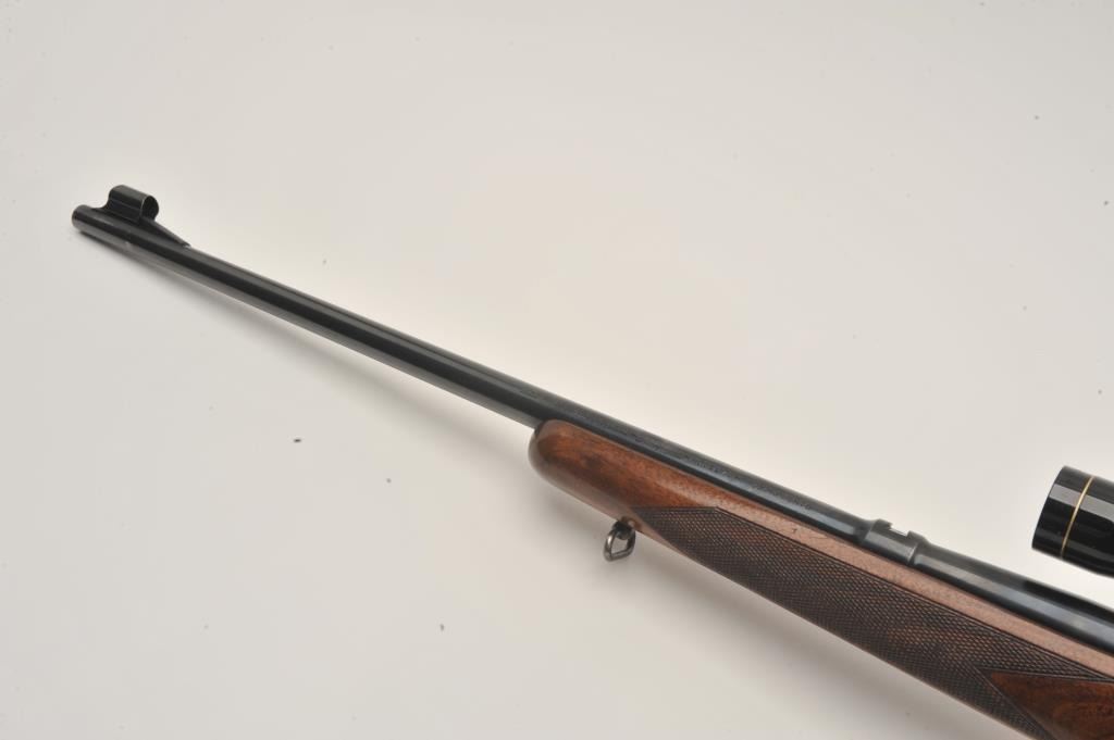 Pre-64 Winchester Model 70 bolt action rifle, .257 Roberts caliber, Serial #385078. The rifle is in fine overall condition with a 24” barrel with a hooded ramp front sight and the rear has been removed. The barrel and Lot Title receiver retain nearly all of their original blue finish with wear at the muzzle and thinning of finish on the trigger guard and magazine floor plate. The checkered wood stock is in very good condition with small Lot Title mars and compressions consistent with carry and use. The butt stock has been professionally extended with a black spacer and rubber recoil pad to provide a 13 ½” LOP. The rifle is topped by a Redfield one-piece Lot Title mount with a Leupold Vari-X II 2 x 7 variable power rifle scope with crisp, clean optics. The bore is very good, the action crisp and markings are sharp on this desirable Pre-64 Model 70 chambered in the Lot Title great .257 Roberts cartridge. Est.: $1,250-$2,500. (C+R).