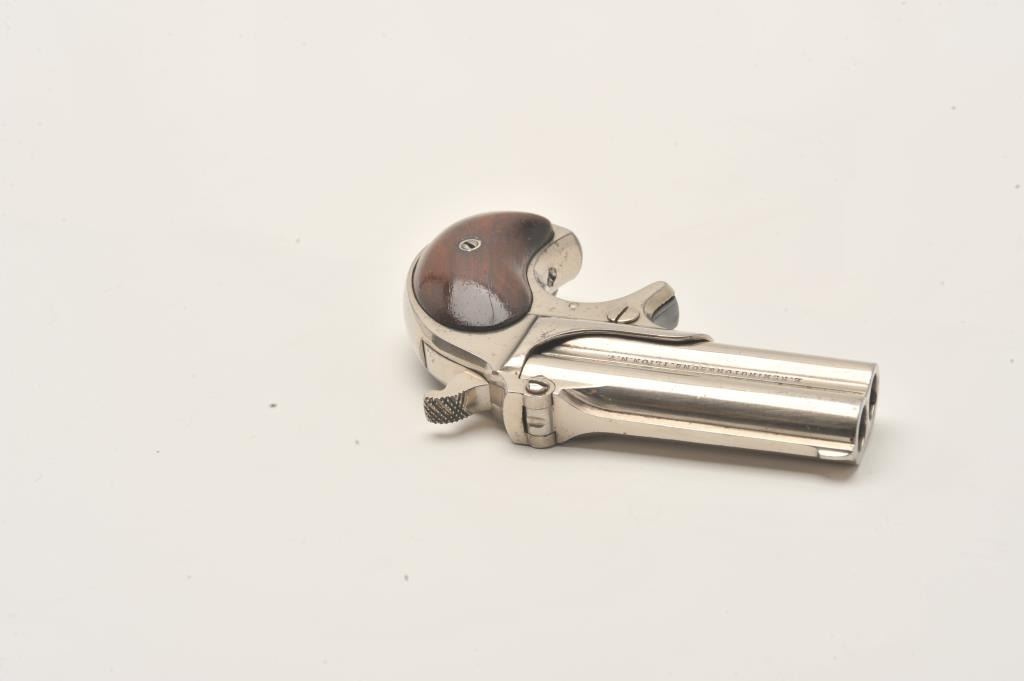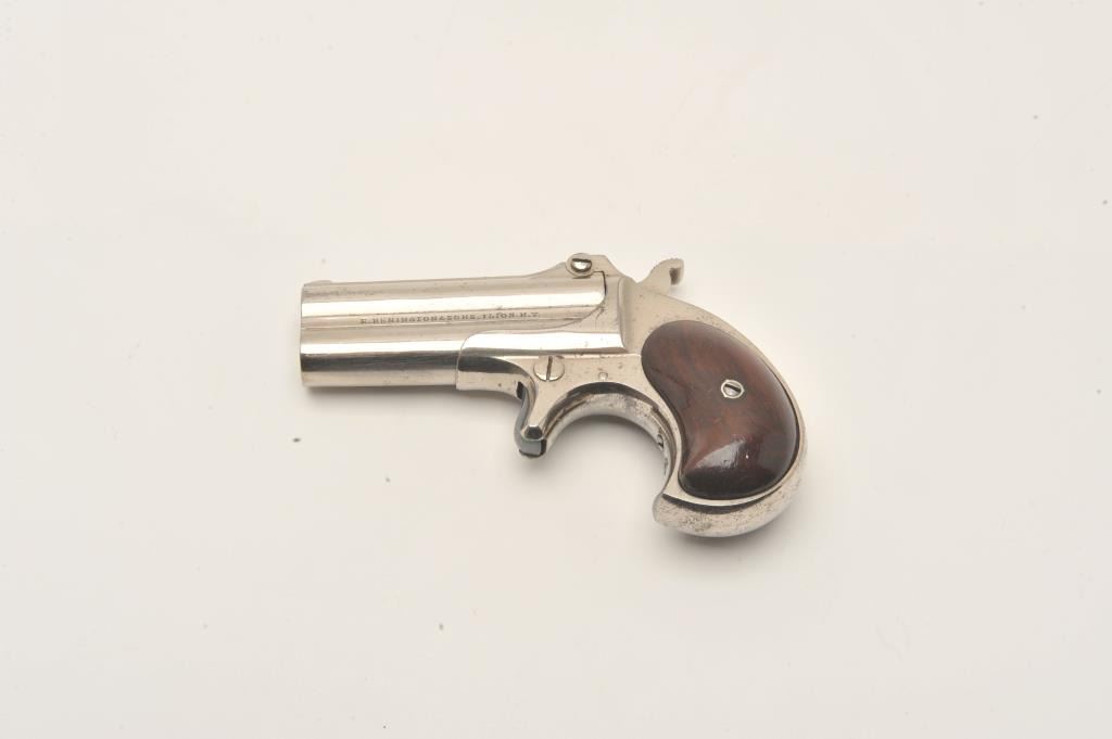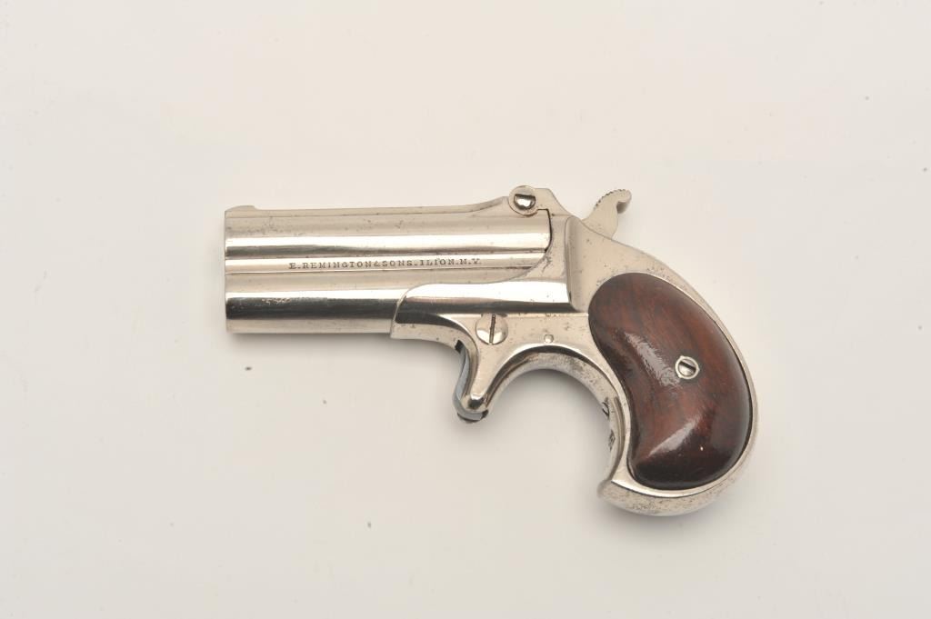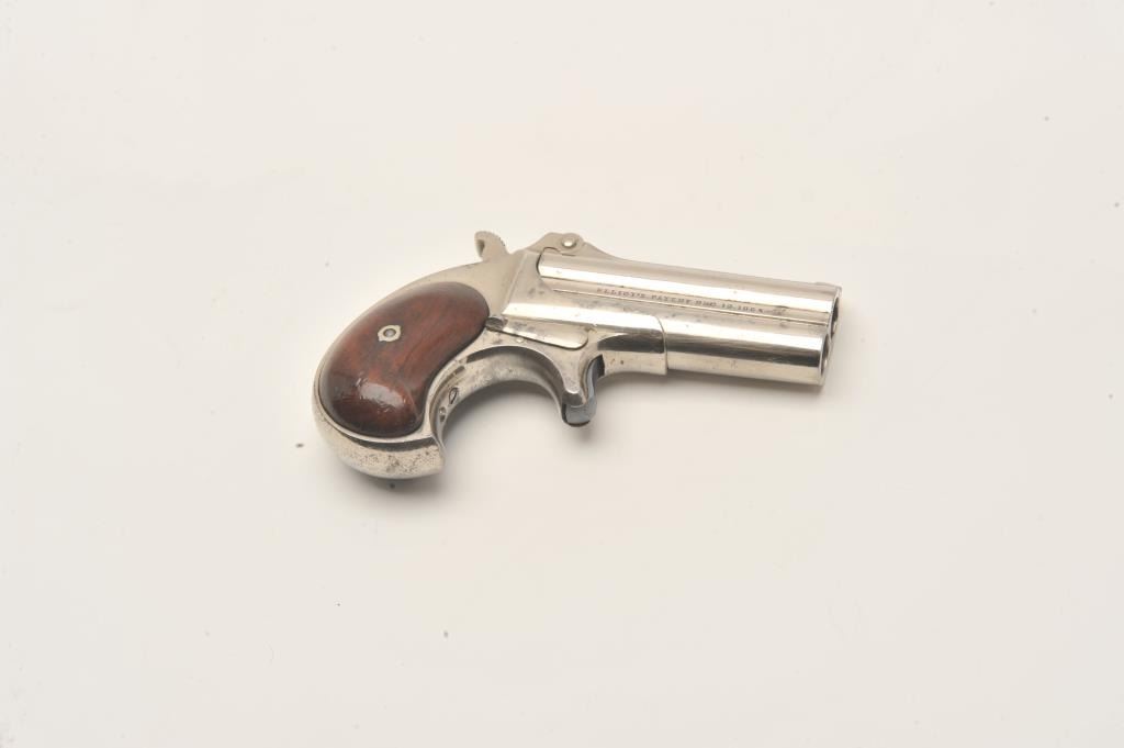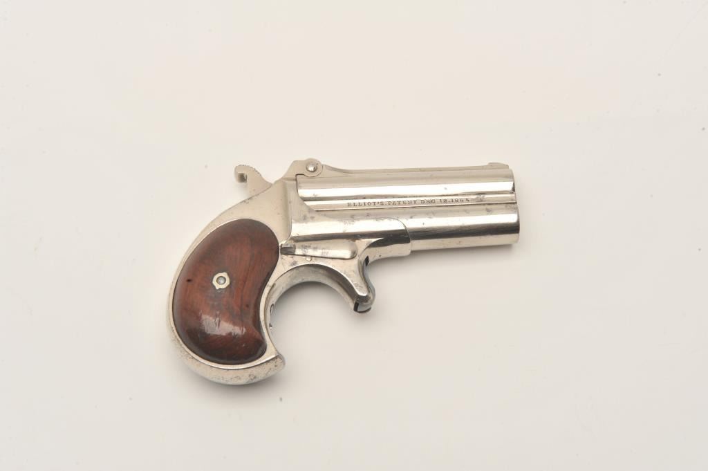 Remington Double Derringer in .41 rim fire with early side address and no extractor, S/N 241. The left side reads “Elliot’s patent Dec 12 1865”. The right side reads “E. Remington & Sons Ilion, N.Y.”. Less than 2000 Lot Title of the 1st type second variation estimated to have been produced. Fine original condition with 90%-95% original nickel showing very slight aging and loss. Very good plus to almost fine rosewood grips with Lot Title minor scratches and bruises on the right. Sharp and crisp with no defects to the hinge. One of the best known surviving examples of early type. Formerly in the Elliot Burka collection. The collection of Doug Drummond Lot Title with a copy of his book. (Antique) Est.: $3000-$6000