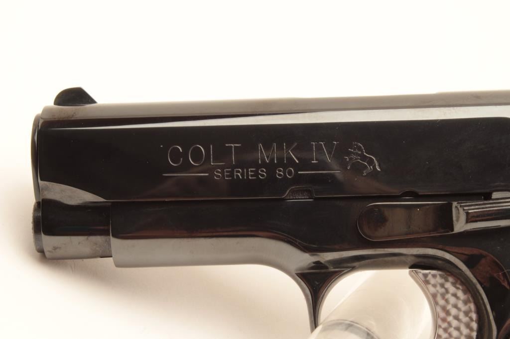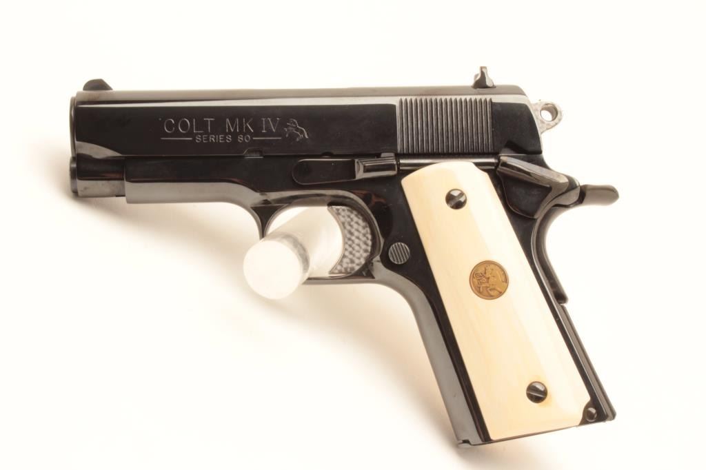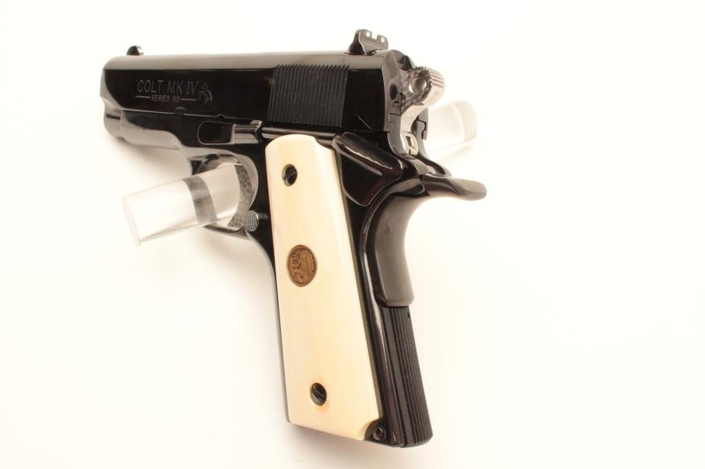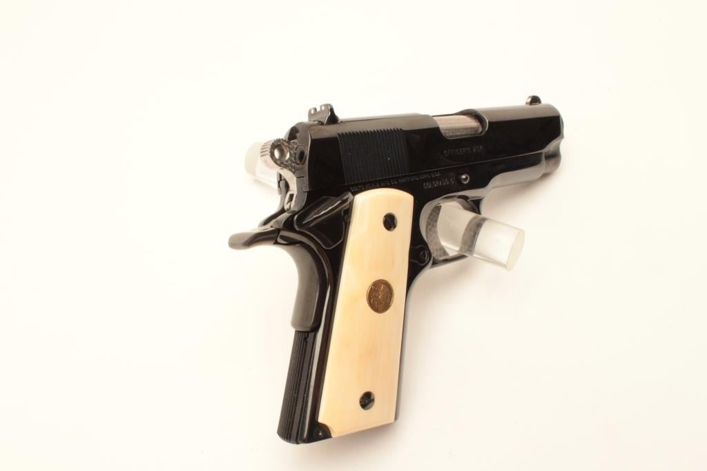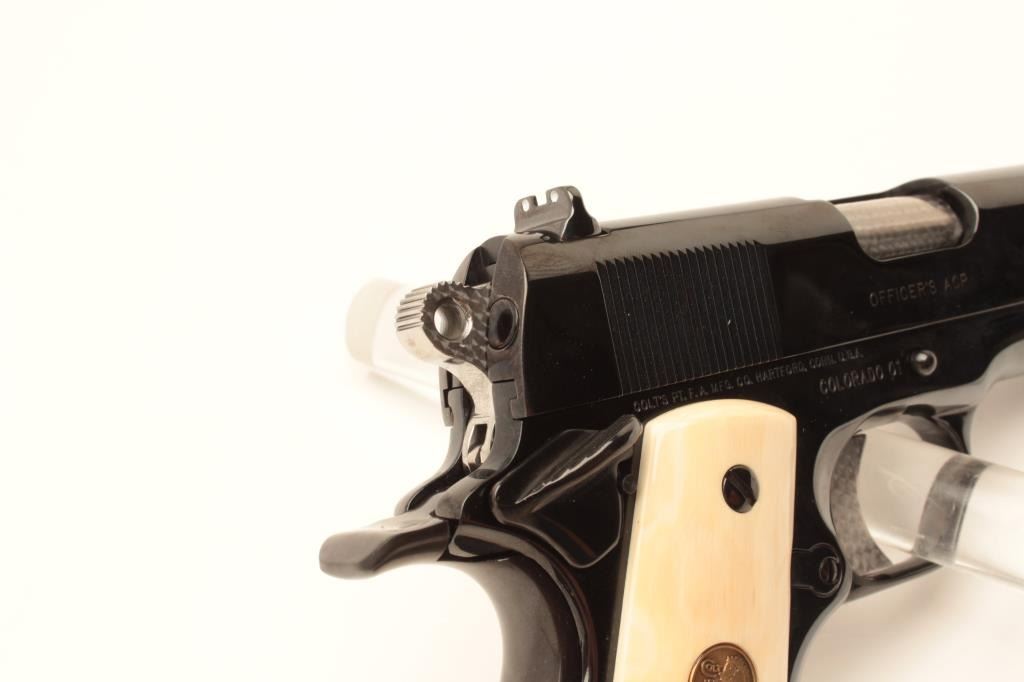 Colt MK IV Series 80 Officers ACP semi-automatic pistol, .45 ACP caliber, Serial #COLORADO 01. The pistol is as new in the factory cardboard box with a 3 ½” barrel. The pistol retains nearly all of its Lot Title high polish blue finish with only light handling marks noted. The ringed hammer and trigger are engine turned. The gold medallion faux ivory grips are in excellent condition. The pistol comes in the original Lot Title maroon Colt box with all associated packaging materials and manual. The lot includes one correct, Colt marked magazine. Est.: $1,000-$2,000. (Modern).