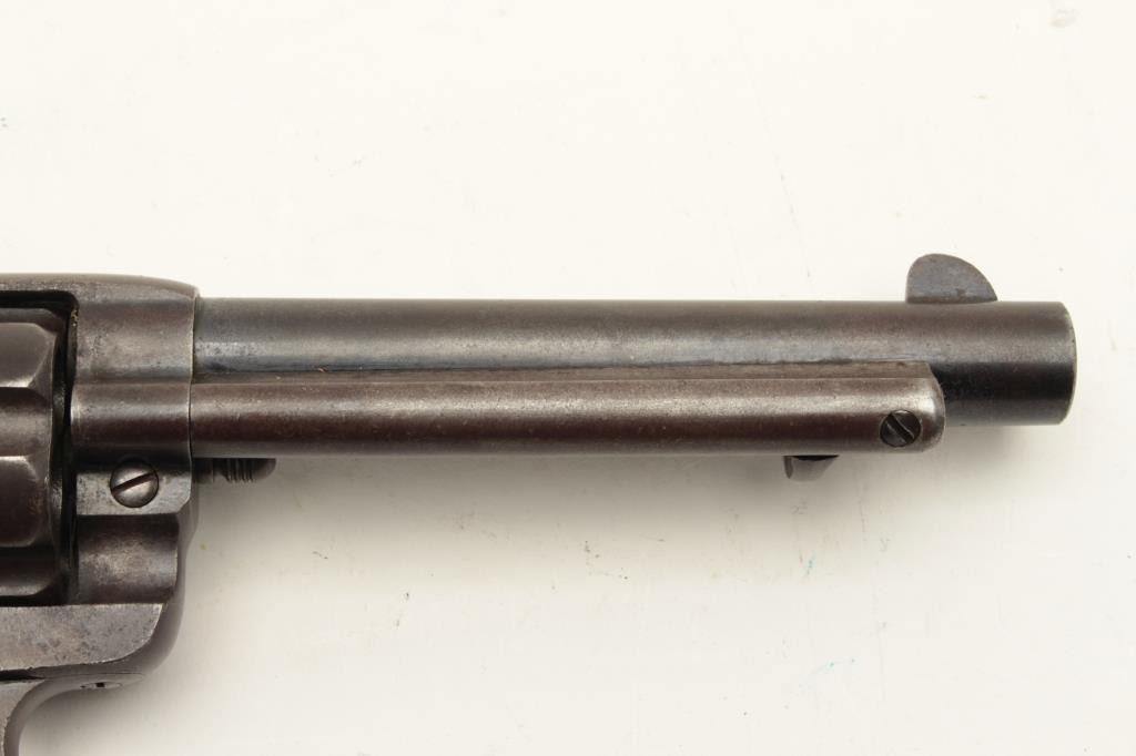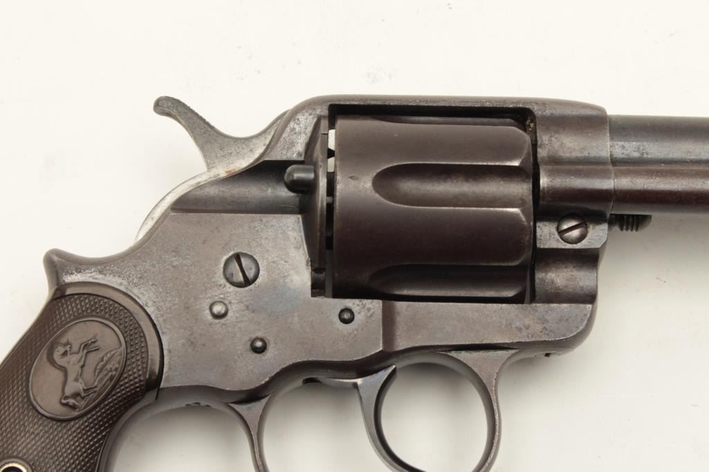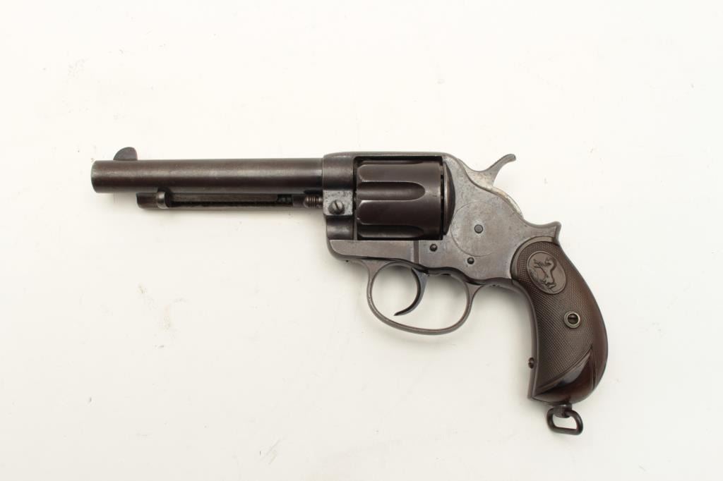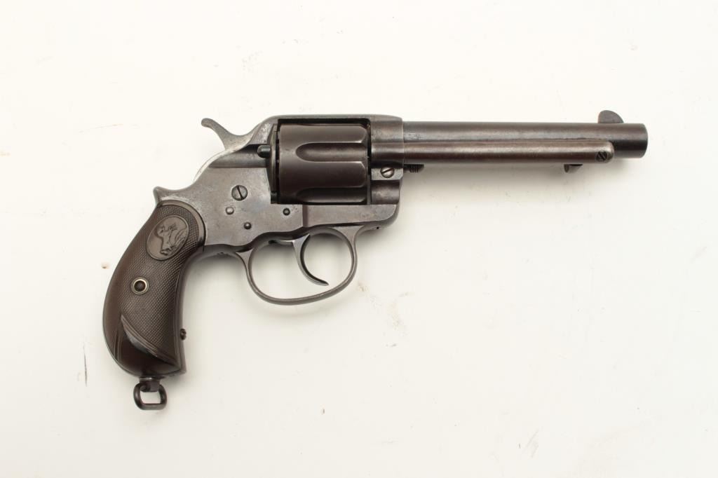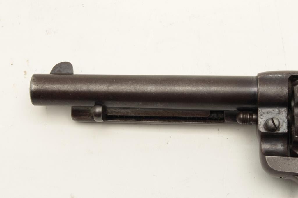 Colt Model 1878 DA revolver, London address and proofed, desirable .476 caliber, 5.5” barrel, blued finish, checkered hard rubber grips, S/N 7943, in overall very good condition displaying a pleasing plum brown Lot Title patina with mixed muted original blued finish in protected areas, good action and markings, overall good bore with some minor pinprick pitting toward muzzle, good grips. (Antique). Est.: $1,500-$2,500.