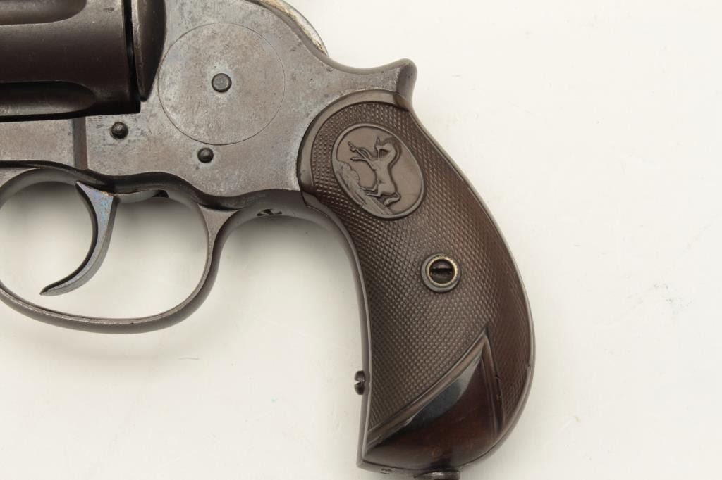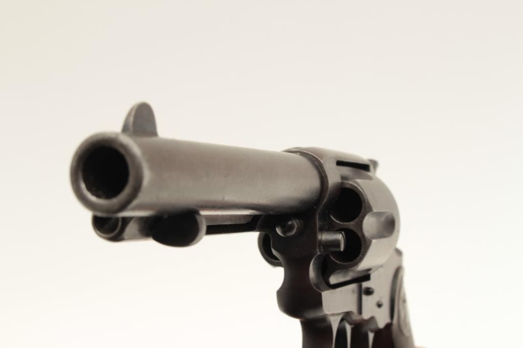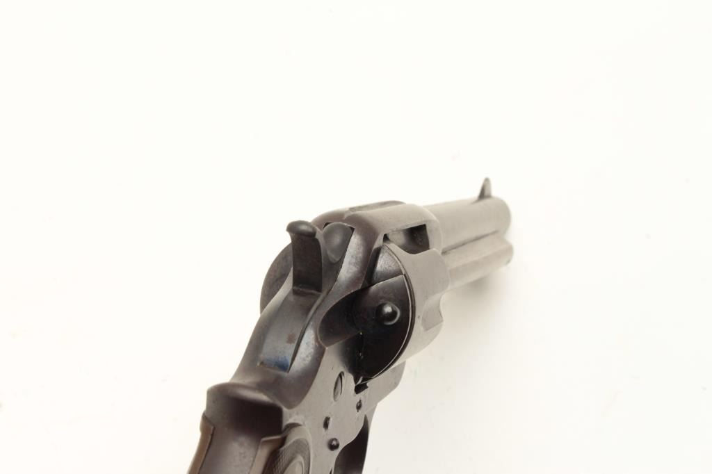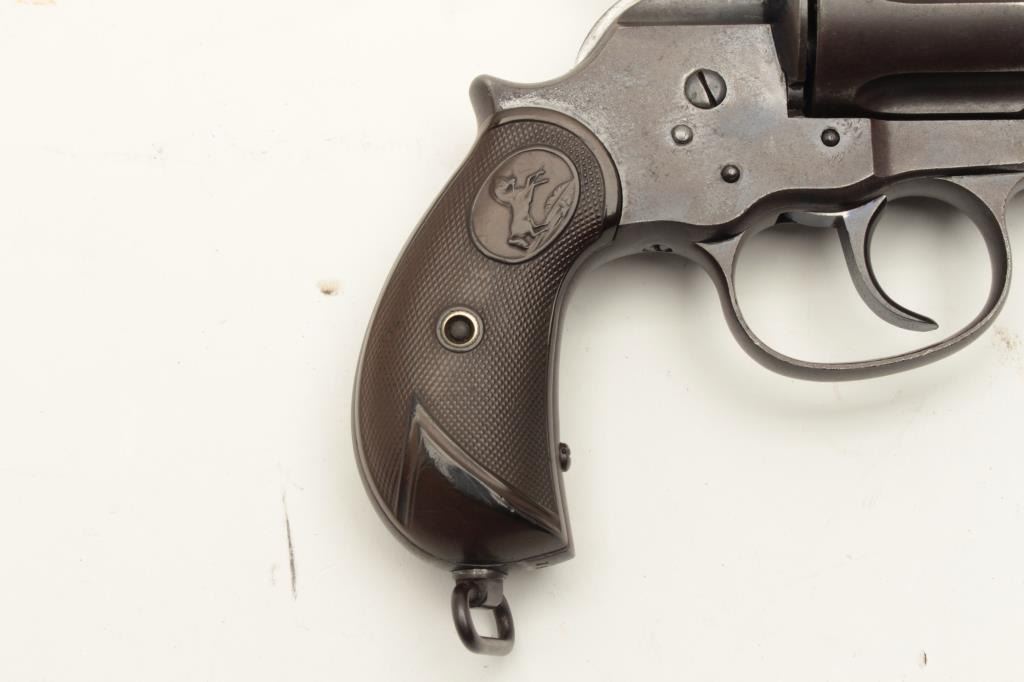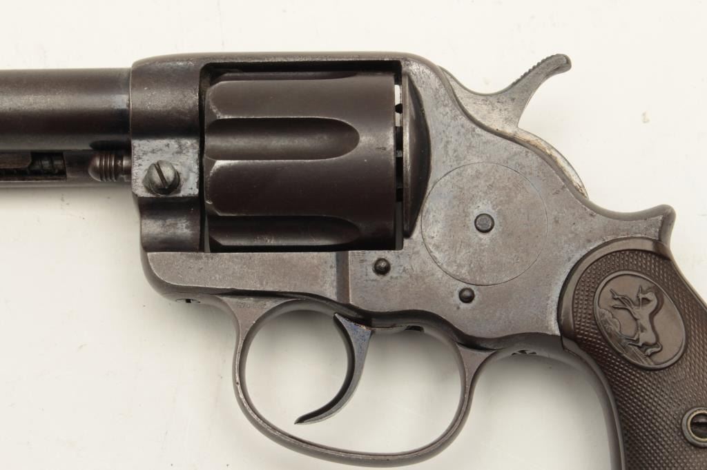 Colt Model 1878 DA revolver, London address and proofed, desirable .476 caliber, 5.5” barrel, blued finish, checkered hard rubber grips, S/N 7943, in overall very good condition displaying a pleasing plum brown Lot Title patina with mixed muted original blued finish in protected areas, good action and markings, overall good bore with some minor pinprick pitting toward muzzle, good grips. (Antique). Est.: $1,500-$2,500.