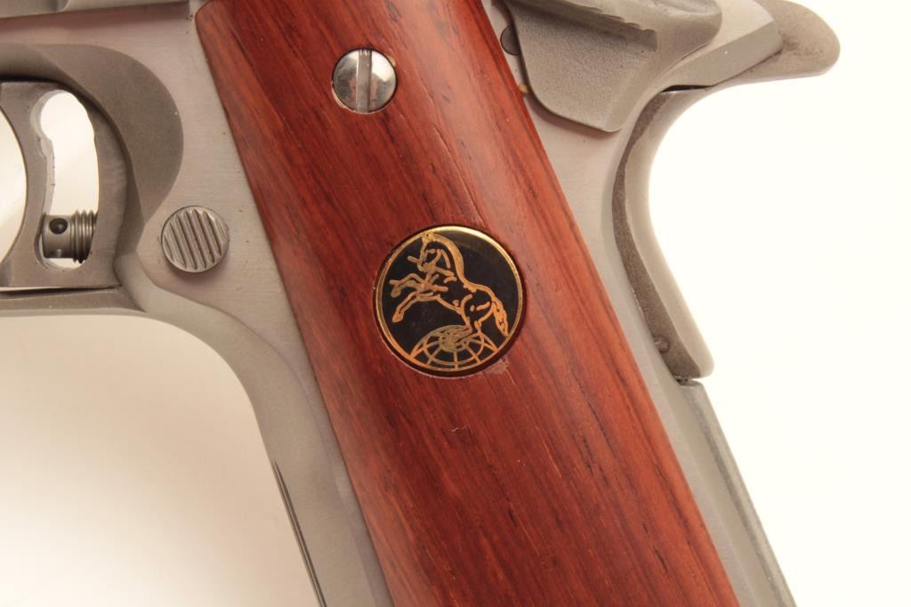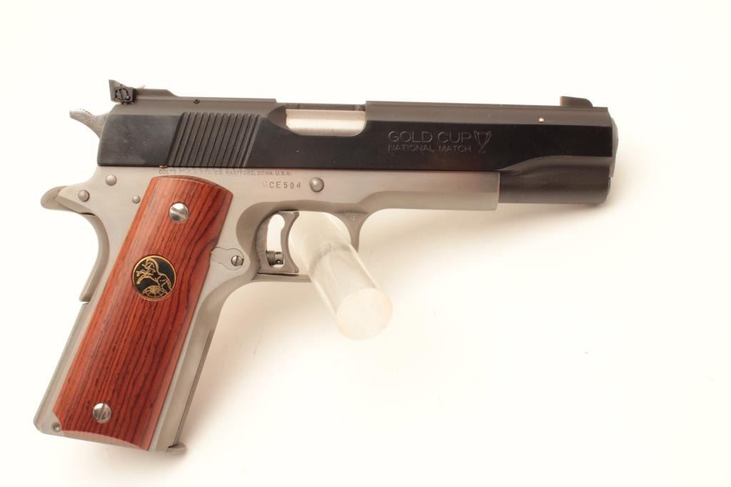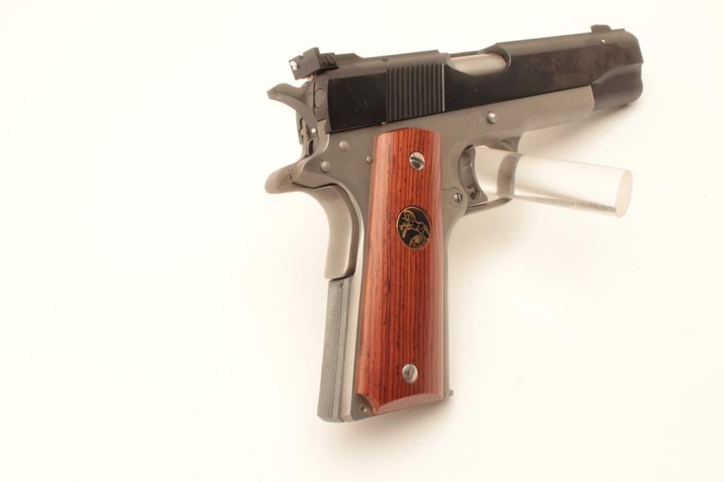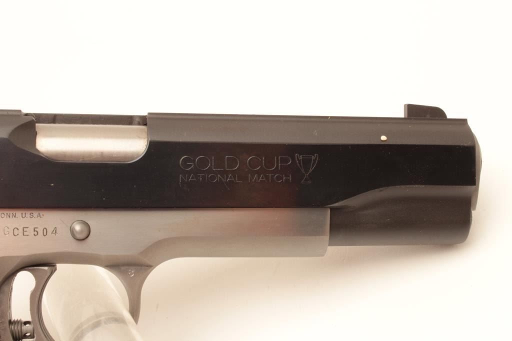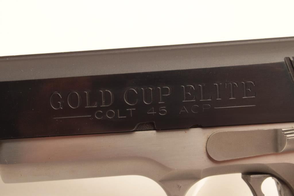 Colt Gold Cup Elite National Match semi-automatic pistol, .45 ACP caliber, Serial #GCE504. The pistol is as new in the box with a 5” barrel. The pistol features a blued slide with a stainless frame. The Lot Title smooth wood Colt Medallion grips are in excellent condition showing only faint handling marks. The pistol is in the original maroon Colt factory box with all associated packaging materials and manual. Lot Title The lot includes one correct Colt marked magazine. Est.: $1,250-$2,500. (Modern).