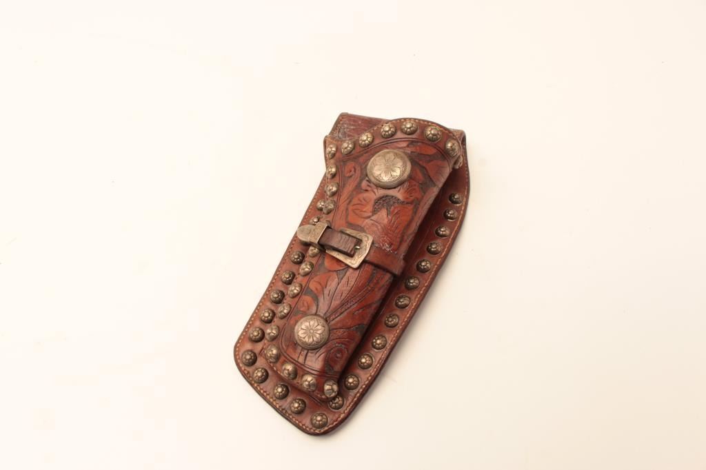 Fine carved and tooled silver mounted holster for a 5 ½” single action with buckle marked “Bohlin made-Hollywood Calif.”. We recognize the carving and fancy studs as Bohlin shop and it is our opinion the holster is pre-war Lot Title and all Bohlin made. The condition is very good with normal age and use 2 holes in the back skirt for tie down. Beautiful. Est.: $1500-$3000