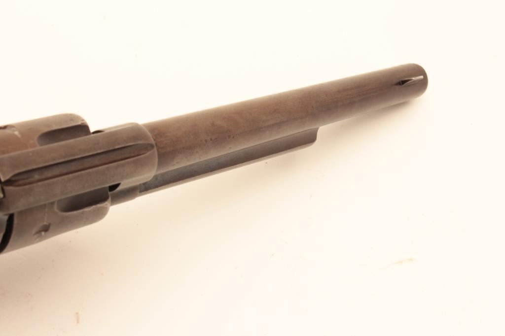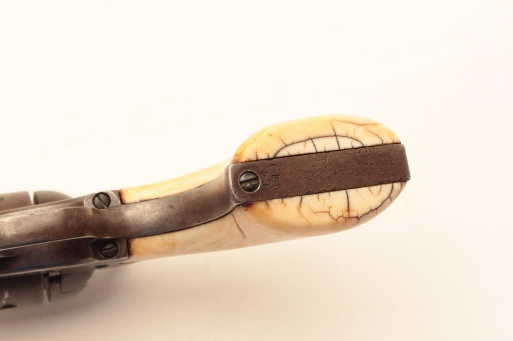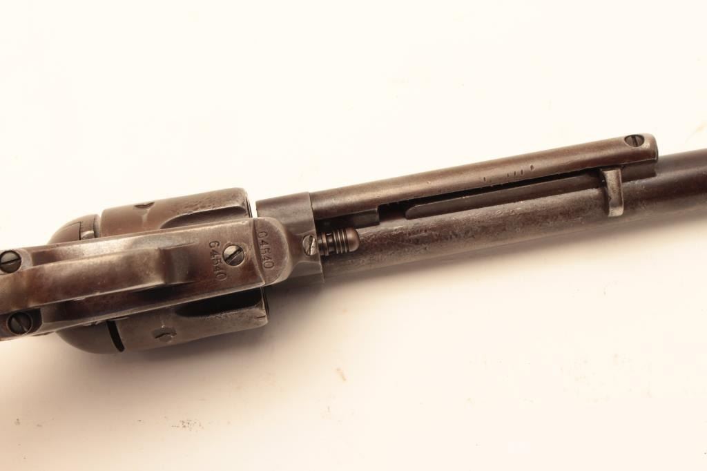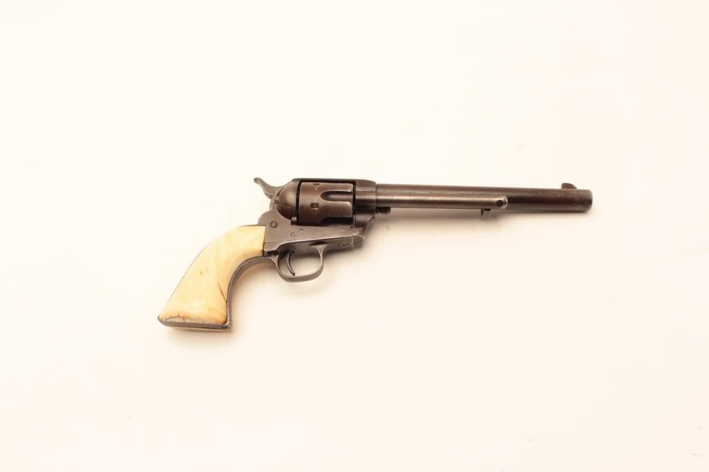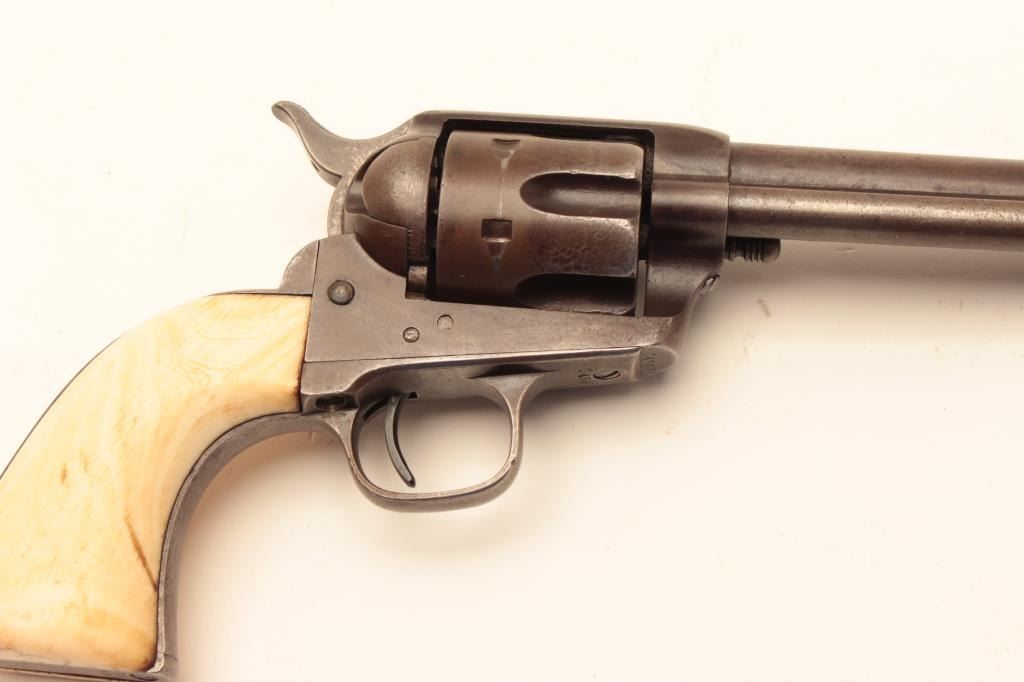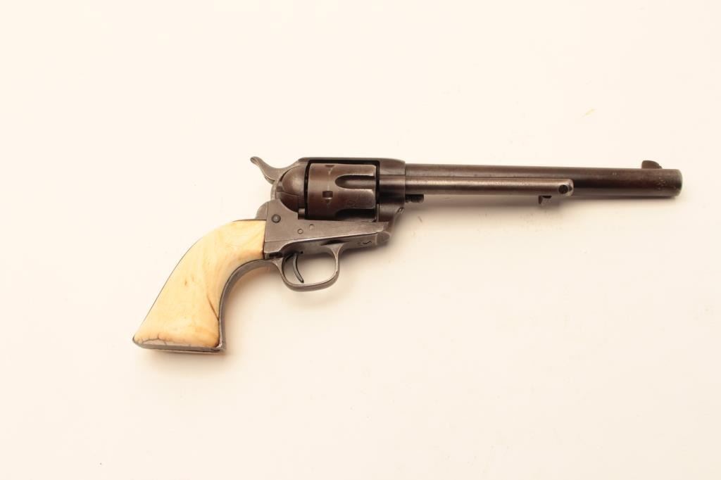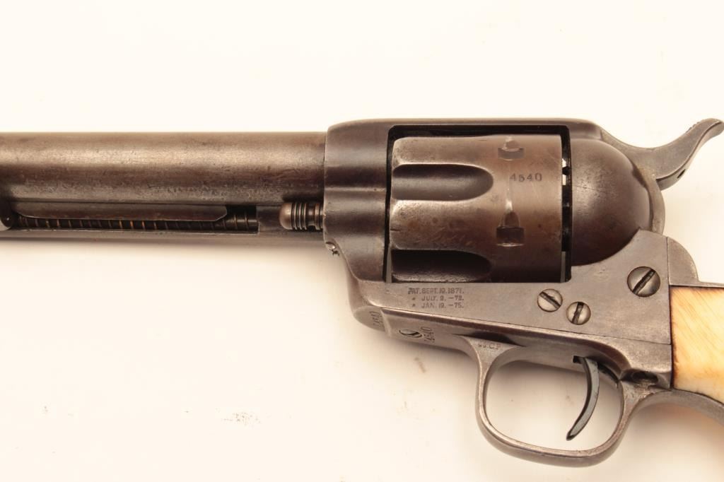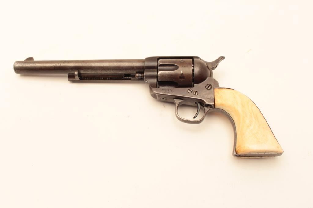 Colt Single Action Army Revolver in .44-40 caliber with a 7 ½” barrel, patina finish and original 1 piece ivory grips, S/N 65540. Factory letter states .44-40, blue and stocks not listed. Shipped March 15, 1881 to Lot Title Hibbard, Spencer, Bartlett & Co., Chicago, Ill., 20 guns in shipment. Gray to brown patina overall with generally good metal showing many small nicks and marks on the bottom of the barrel and edges of the Lot Title cylinder from frontier use. All matching visible numbers including the cylinder. The barrel address is only about half visible but the 3 line patent dates are fully visible. The grips fit well with slight shrinkage and Lot Title small losses. The grips are definitely correct to the period. The front sight has been reduced slightly and the action is working well with fair to good bore. A representative early Colt SAA made while the Lot Title west was still “Wild and wooly”. (Antique) Est.: $2500-$5000