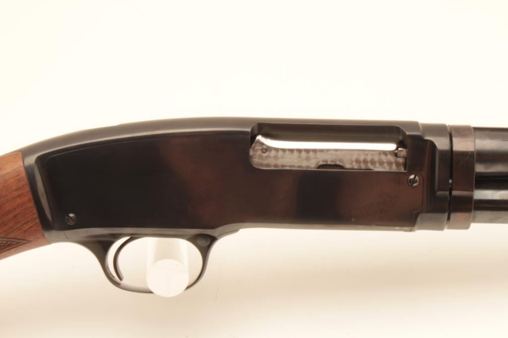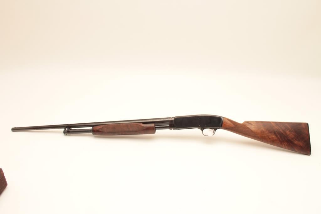 Winchester Model 42 410 gauge pump action shotgun with factory skeet 25” barrel showing raised non vent rib, S/N 23533. Restored and restocked to excellent with engine turned bolt and follower. 95%-98% since restoration Lot Title with minor assembly marks and scratches. Over $2000 to restore and restock. With Winchester luggage case. (C&R) Est.: $3000-$6000