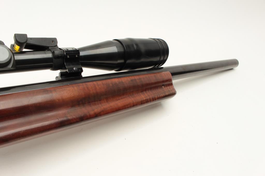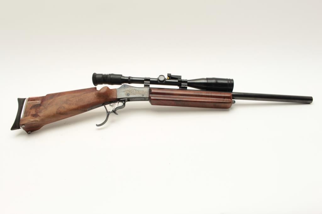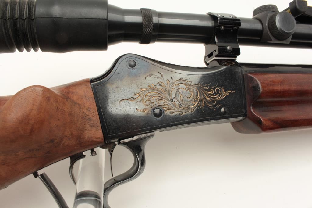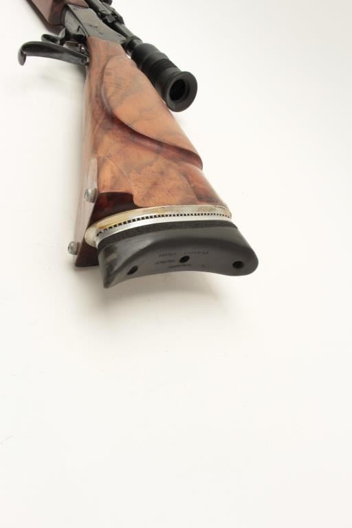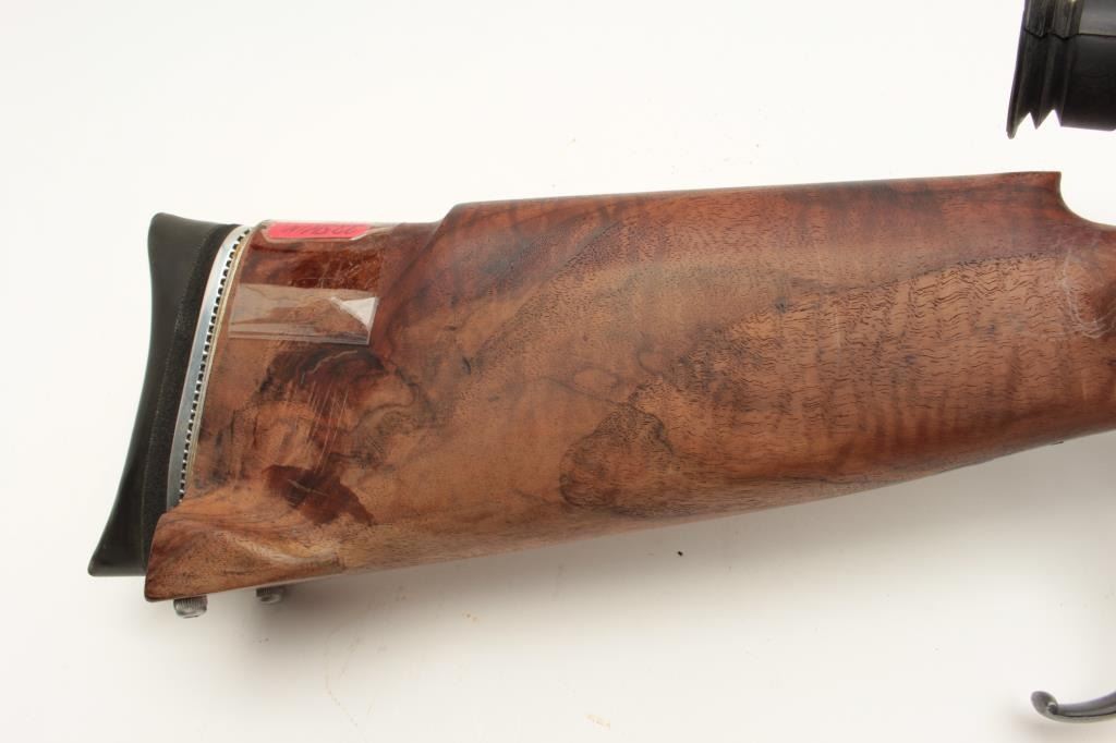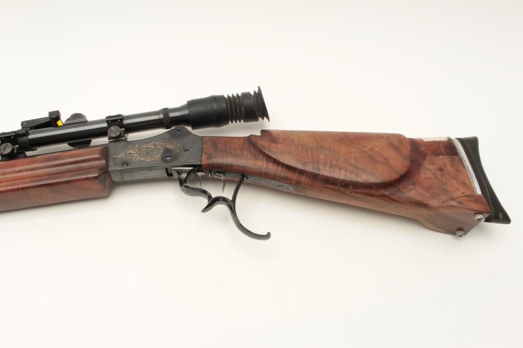 Custom Martini action single shot rifle with 25” Baldridge, Shasta, Cal.-marked heavy barrel, .225 Win. caliber, double set triggers (working at time of description), custom Shutzen butt stock with adjustable Lot Title butt pad, heavy wood forend, no visible S/N, mounted with a Weaver K-12-1 scope with spirit level; gun is in overall good condition with a good bore, crisp action, beautiful graining to wood stocks with butt Lot Title stock not yet varnished. (Modern). Est.: $900-$1,800.