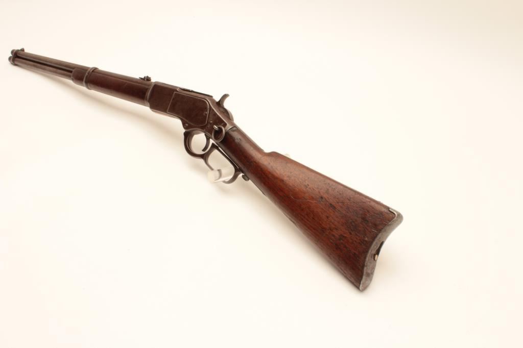 Winchester Model 1873 lever action SRC, .44 caliber, 20” barrel, blued finish, wood stocks, S/N 54054, in overall good condition with a crisp action, good bore, pleasing brown patina to metal surfaces and good wood Lot Title overall. Accompanied by a factory letter confirming carbine as received in the warehouse on May 31, 1880 and shipped from the warehouse on June 2, 1880 with 2,499 other Model 1873’s, order number 20278. Lot Title (Antique). Est.: $1,500-$3,000.