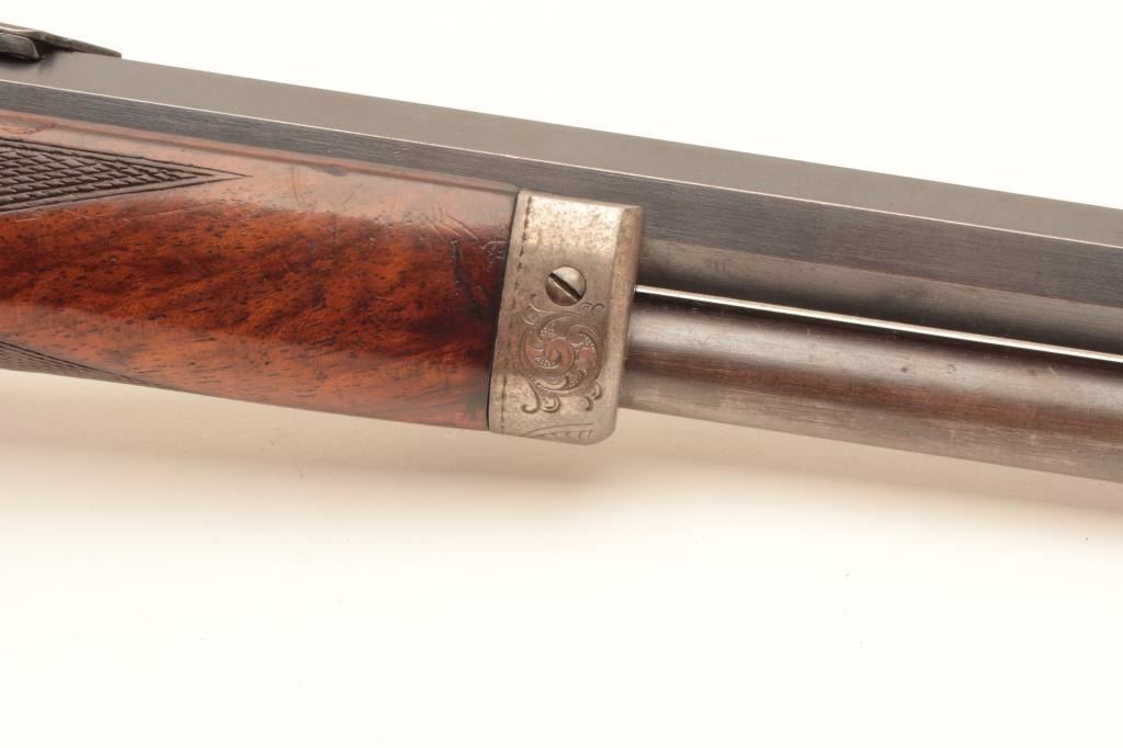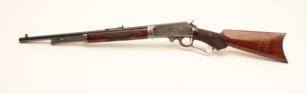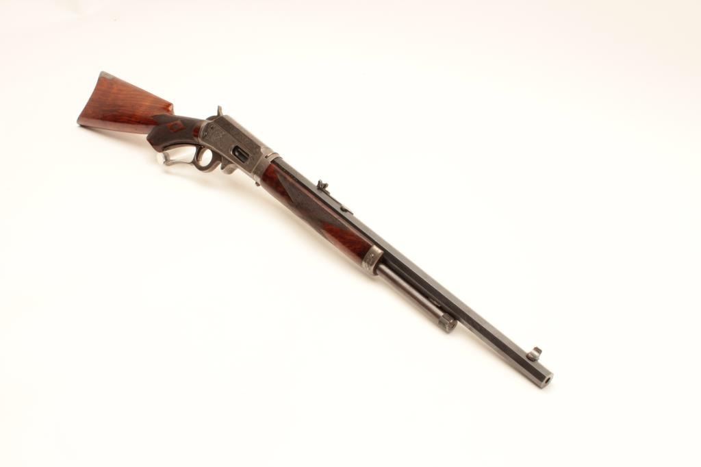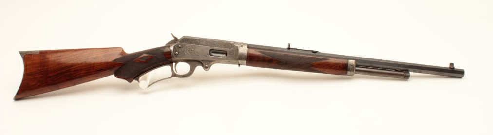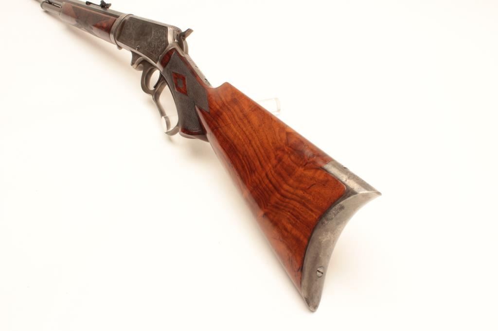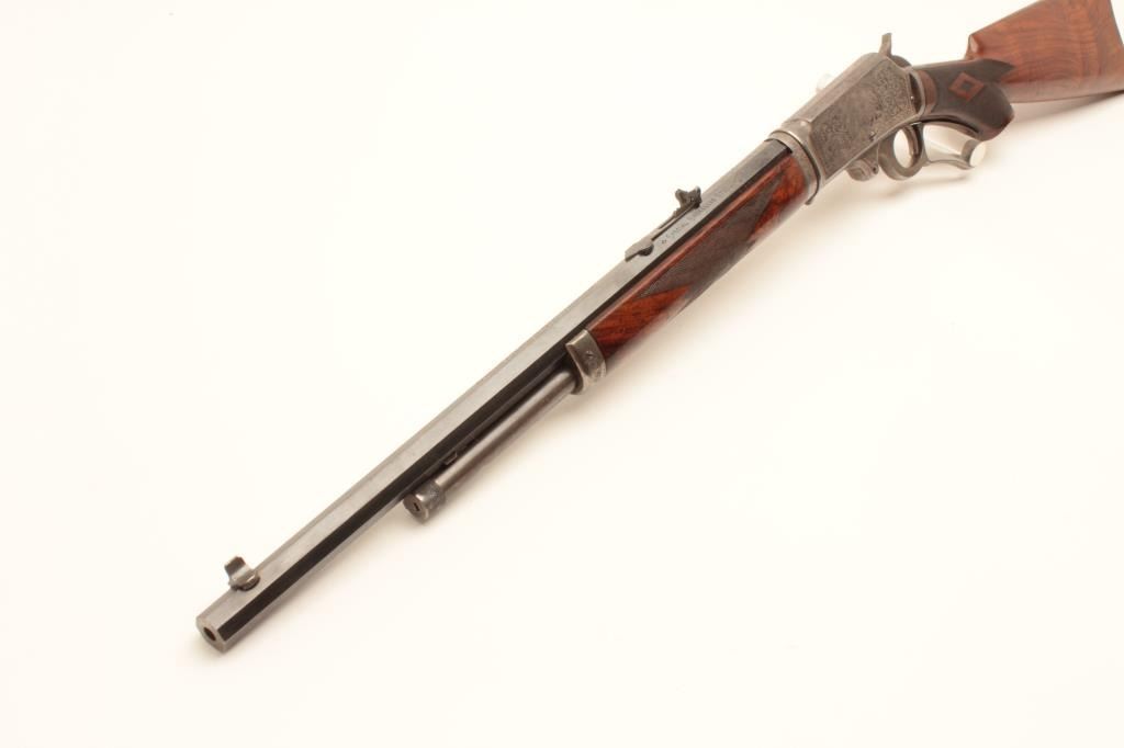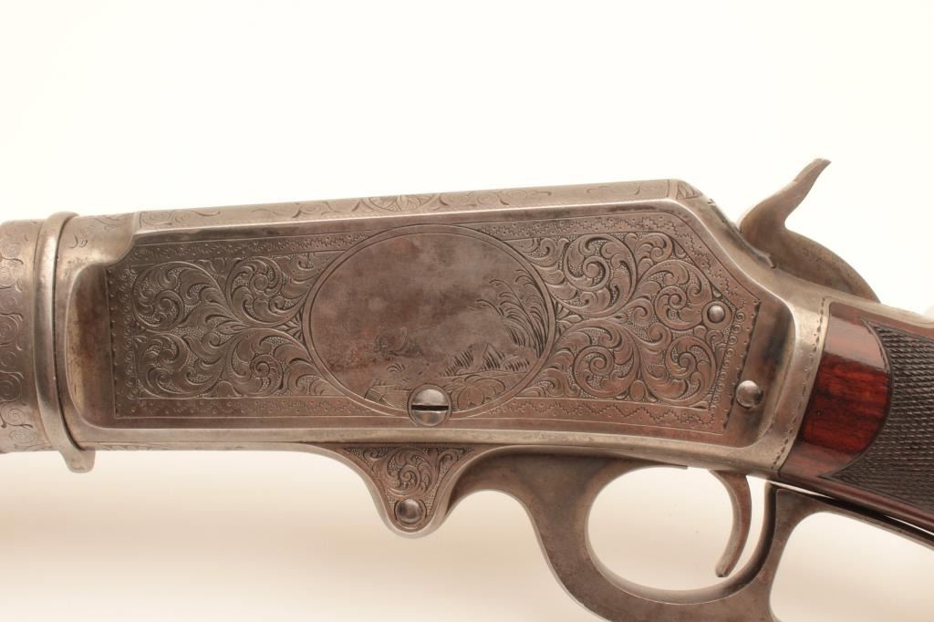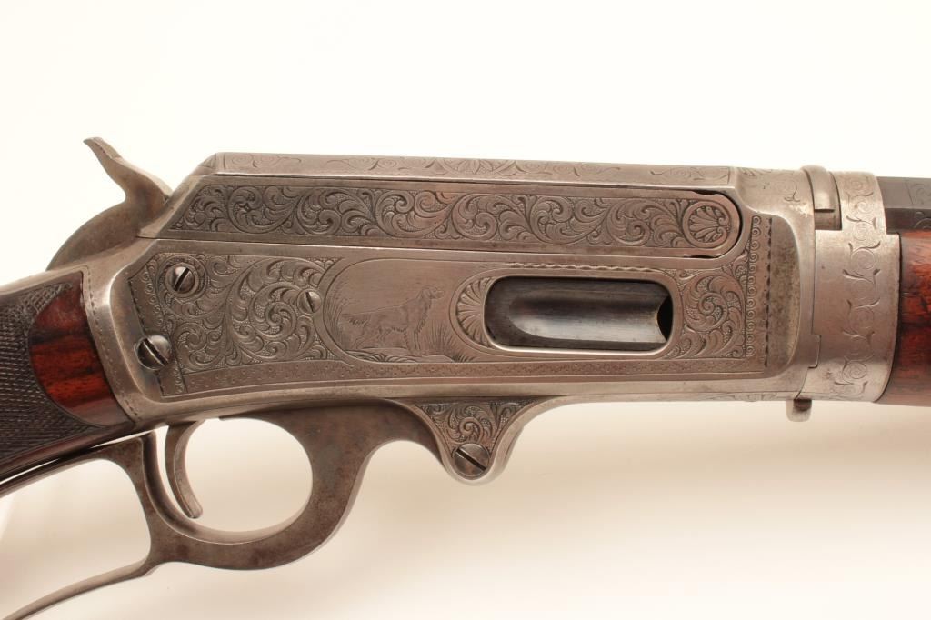 Deluxe factory engraved Marlin Model 1893 lever action rifle, .30-30 caliber, takedown, 20” octagon barrel, blue and case hardened finish, ¾ magazine, deluxe checkered wood stocks, Serial #163068. This gun is in fine Lot Title overall condition showing the majority of its original blue finish on the Special Smokeless Steel barrel; scattered areas of original case colors on the receiver, hammer, lever and crescent butt plate; crisp action, Lot Title sharp markings, fine bore; extensive engraving on the receiver, barrel at the breech, fore end cap and butt plate including two finely accomplished panel scenes. One scene depicts a hunting dog on the right side Lot Title of the frame and the other of a mountain lion on the left. The wood is overall fine with better-than-standard graining and checkered diamonds accenting both sides at the wrist. A beautifully engraved deluxe Lot Title Marlin accompanied by a folder with lots of information on the Model 1893 from Brophy’s book, “Marlin Firearms, A History of the Guns and the Company that Made Them”, including information on page 531 that appears to show