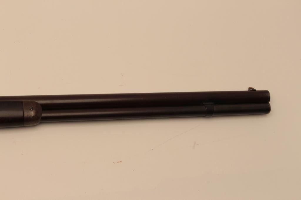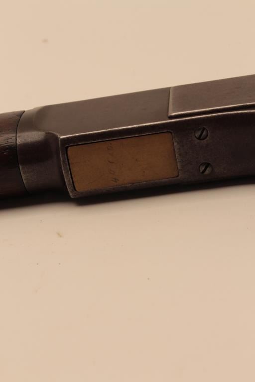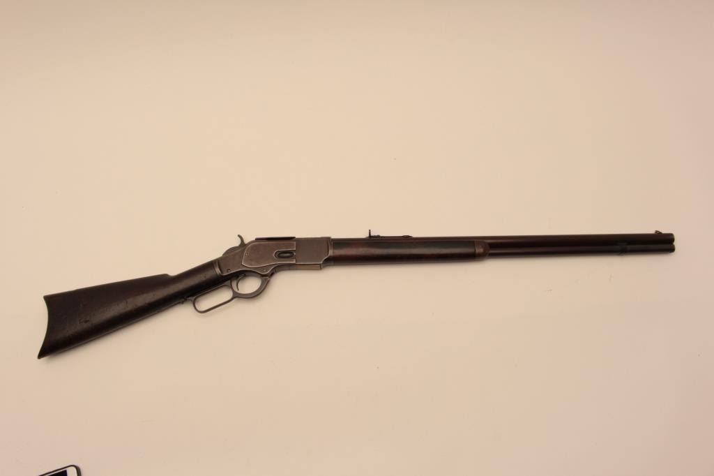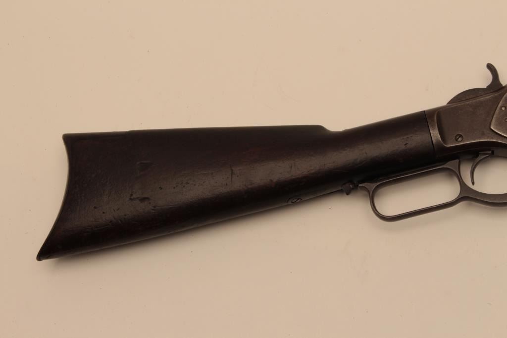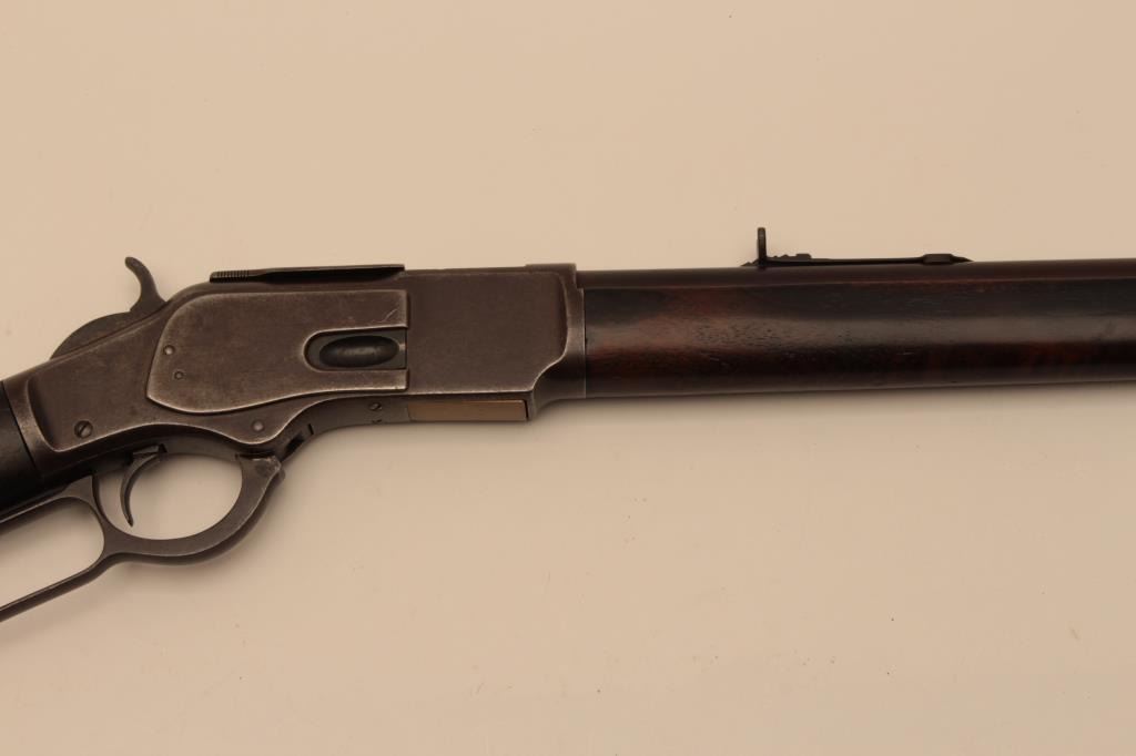 Winchester 1873 Rifle in .44-40 caliber with a 24” round barrel, full mag, rifle butt, S/N 215688B. Smooth brown patina with traces of blue mixed in. Good barrel address and caliber markings clear on breech and brass Lot Title lifter. Very slight metal erosion and natural metal aging. The stocks are good to very good with oil staining, scratches and minor imperfections. A couple large gouges and dings on the right rear of the butt stock. Lot Title Good action and fair to good bore. Rear sight is a period large western dealer style buck horn in proper dovetail. (Antique) Est.: $1000-$2000