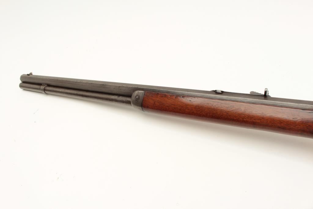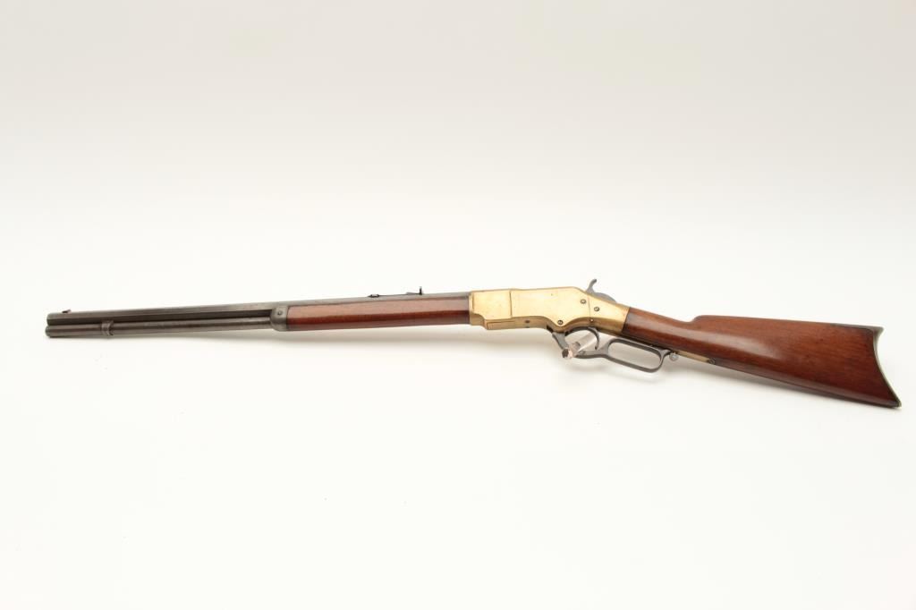 Winchester 4th Model 1866 lever action rifle, .44 WCF caliber, Serial #156287. The rifle is in good overall condition with a 24” octagon barrel with a blade front and replacement rear sights. The barrel and Lot Title full-length magazine have gone a grey patina with areas of light surface erosion. The brass receiver has taken on a pleasing taffy color with small mars and scratches. The Hammer and lever display old, toning case Lot Title hardening. The smooth wood stocks are in good condition with small compressions and an extra coat of varnish added. The butt stock ends with a smooth steel crescent butt with trap. The bore is fair, the action is crisp Lot Title and markings are sharp on this desirable 4th Model 1866 Yellow Boy. Est.: $7,000-$14,000. (Antique).