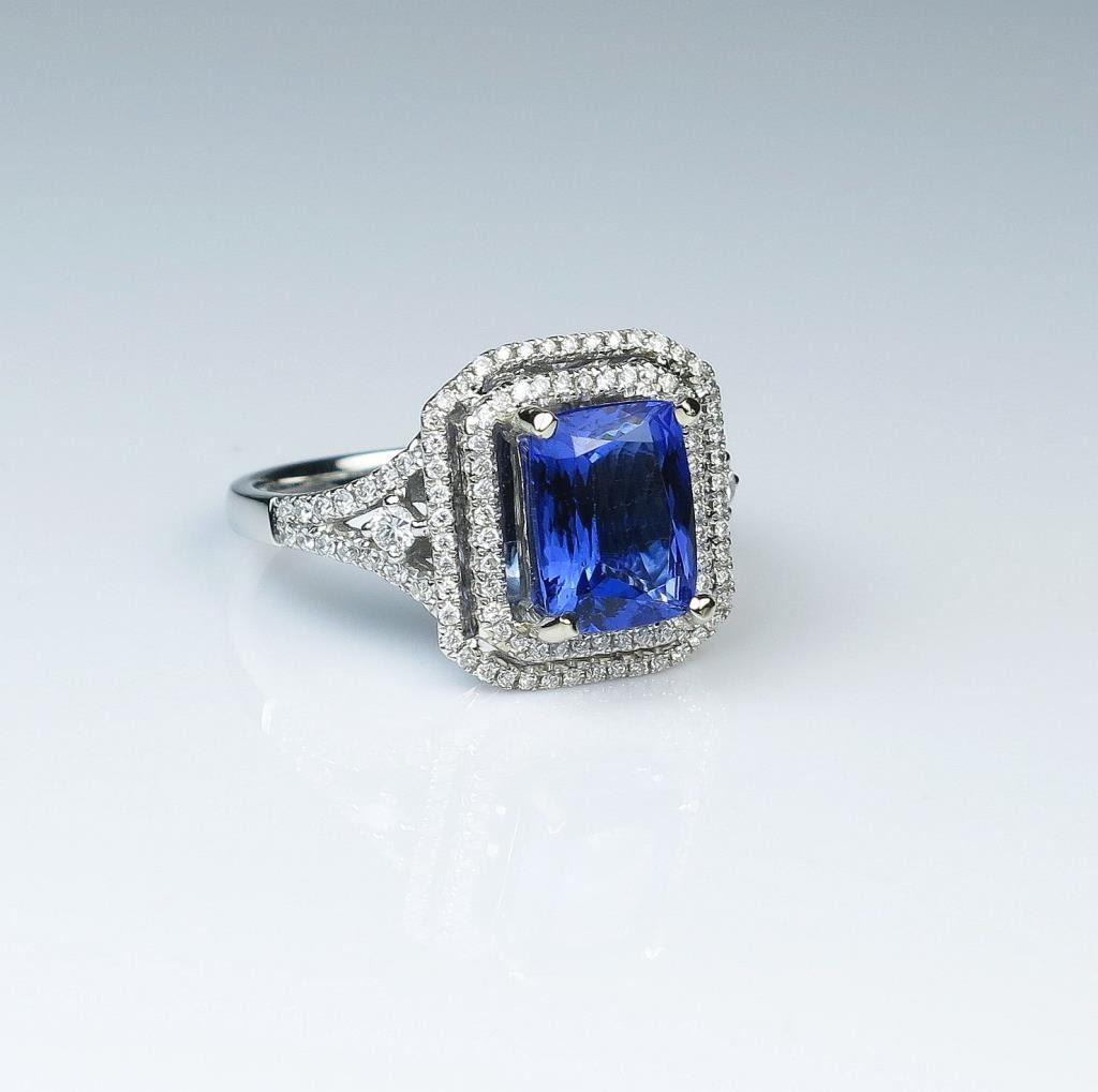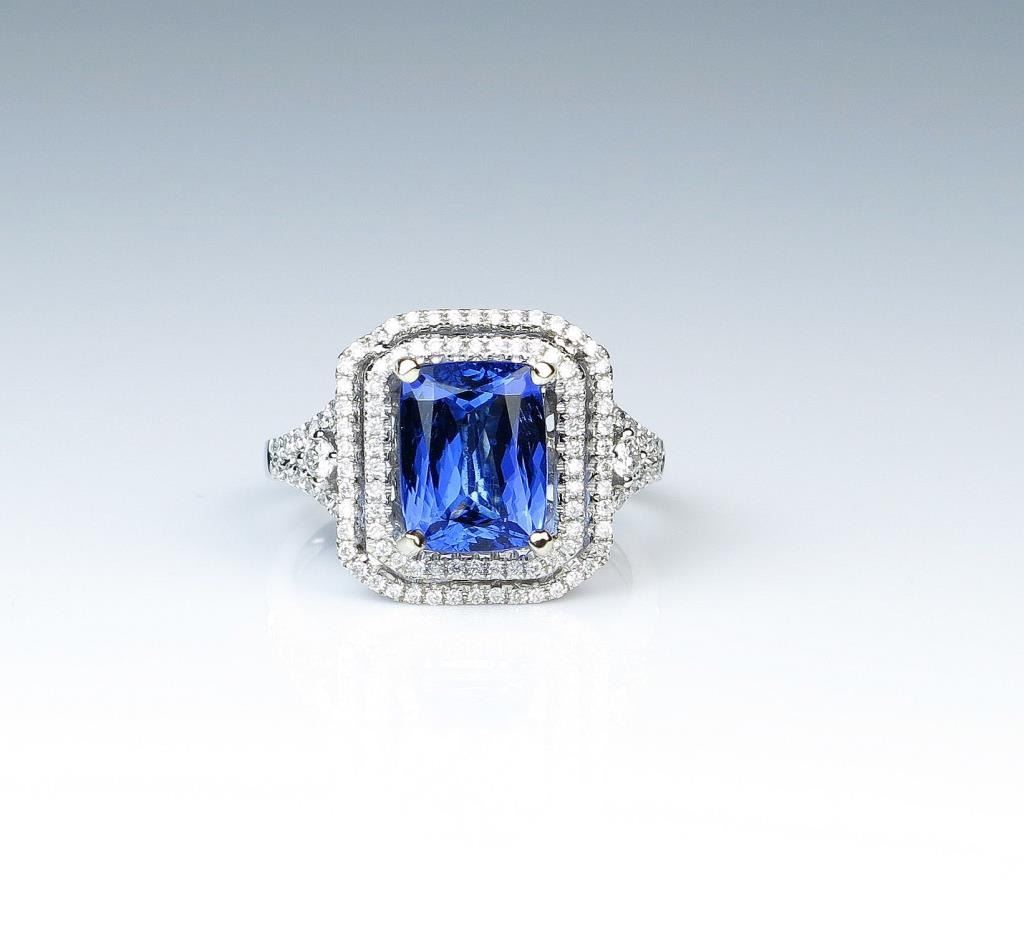 Spectacular Tanzanite and Diamond ring featuring an Extra Fine 3.35 carat emerald cut Tanzanite with perfect blue violet color and VS clarity beautifully framed with 114 round brilliant cut Diamonds weighing approx. Lot Title 1.00 carat with G-H colors and VS/SI clarity set in 14 karat white gold. Full Appraised Value $9,500.00 Estimate $6,000-$7,000
