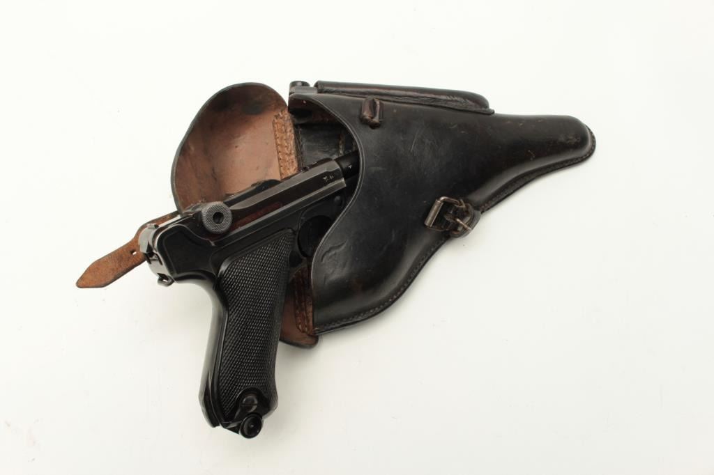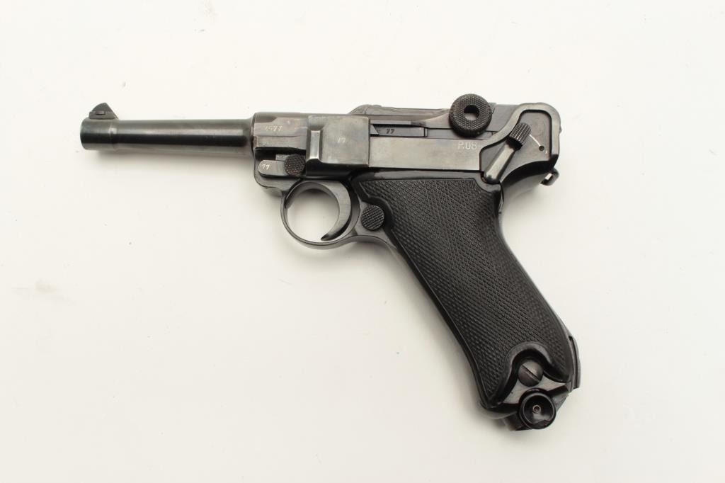 P08 Mauser black widow semi-automatic pistol, byf/41 marked, 9mm caliber, 4” barrel, blued finish, nazi proofed, checkered black grips, S/N 4577, accompanied by a leather flap holster, P08 marked with cdg 41 stamping and Lot Title one extra magazine. This pistol is in overall very good condition with matching visible S/Ns, very good bore, considerable military finish on metal surfaces, crisp action and sharp markings; the grips are also Lot Title in very good condition; holster is good to very good. (C&R). Est.: $2,750-$5,500.