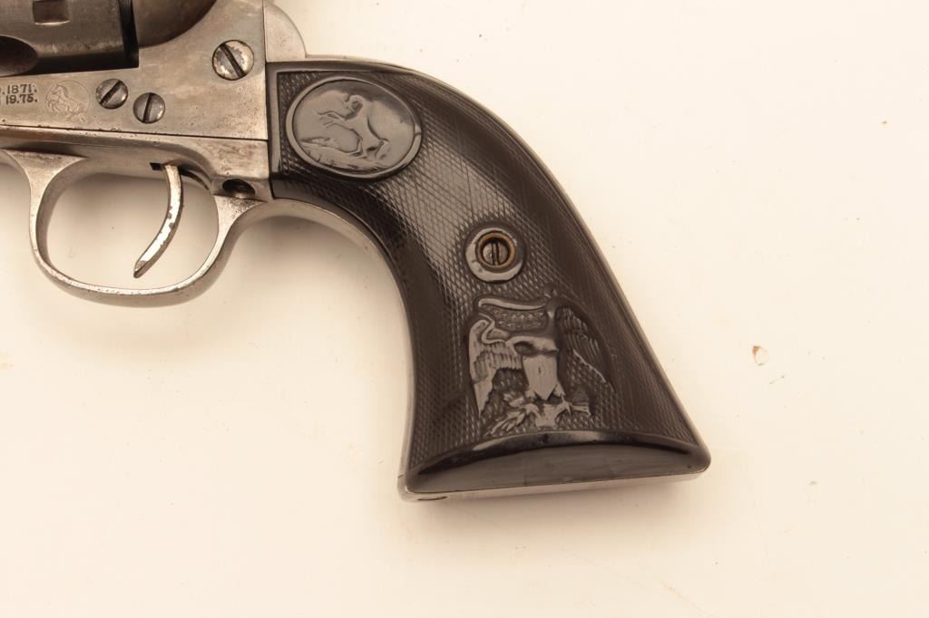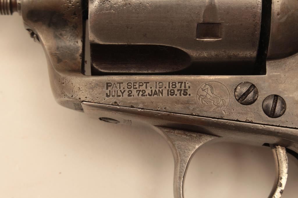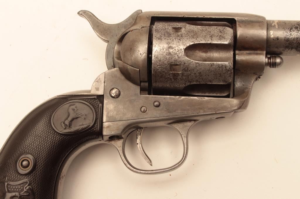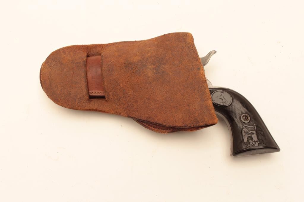 Colt Single Action Army Sheriff’s Model revolver in .45 L.C. caliber with a 4” barrel, nickel finish, rubber eagle grips, shipped to Donlay & Geisler, Houston, Texas, and October 1, 1893. The remarks states Lot Title another revolver with same number is recorded. All features confirmed by factory letter except grips not listed. A period carved western holster for this Colt and constable badge are included. Documentation Lot Title letter from John Damon former Judge of Brazoria, Texas states “145344 had been in Wharton, Texas in a collection for 40 years before 2003”. The judge recants that this pistol belonged to the sheriff of Wharton Lot Title known as “Buckshot lane”. A research folder on the sheriff is included and other recollections about Texas are made in the well written document. Also formerly Joe Kiser (1st president of Colt collector’s Lot Title Association Collection). The condition of the Sheriffs model remains in good condition with gray patina finish and scattered light to moderate pitting. The markings are visible but light on the bottom line of the address.