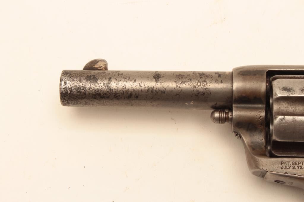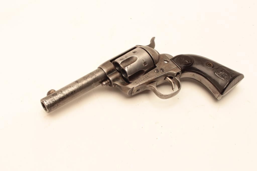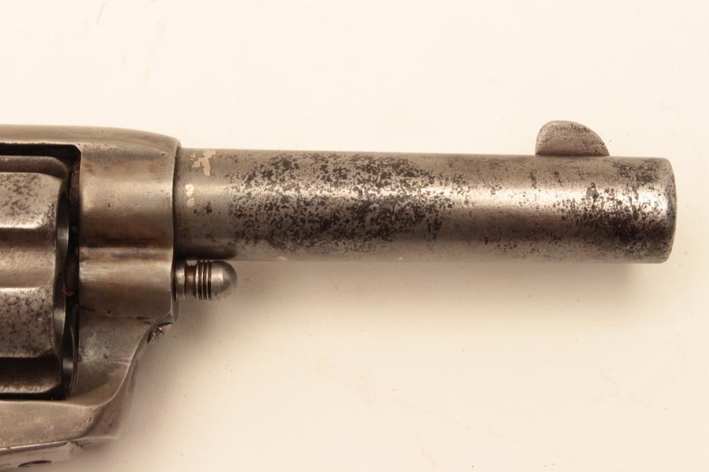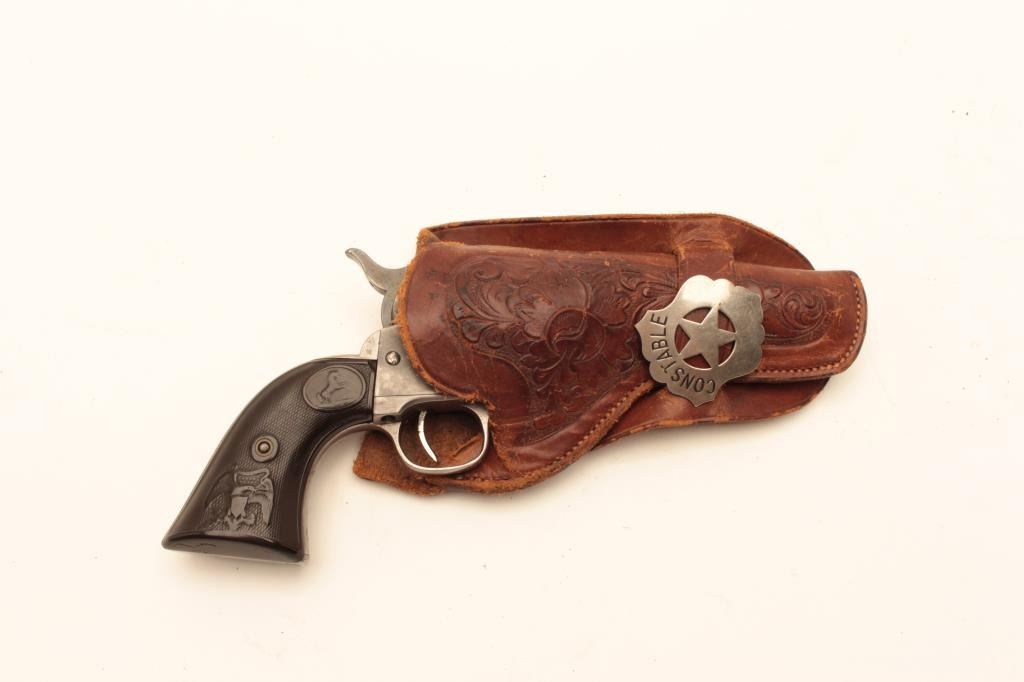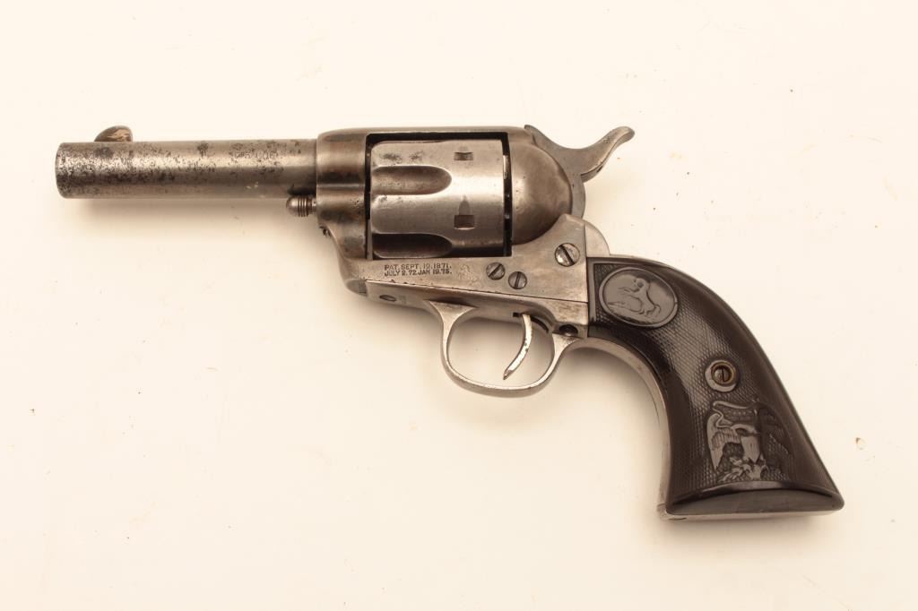 Colt Single Action Army Sheriff’s Model revolver in .45 L.C. caliber with a 4” barrel, nickel finish, rubber eagle grips, shipped to Donlay & Geisler, Houston, Texas, and October 1, 1893. The remarks states Lot Title another revolver with same number is recorded. All features confirmed by factory letter except grips not listed. A period carved western holster for this Colt and constable badge are included. Documentation Lot Title letter from John Damon former Judge of Brazoria, Texas states “145344 had been in Wharton, Texas in a collection for 40 years before 2003”. The judge recants that this pistol belonged to the sheriff of Wharton Lot Title known as “Buckshot lane”. A research folder on the sheriff is included and other recollections about Texas are made in the well written document. Also formerly Joe Kiser (1st president of Colt collector’s Lot Title Association Collection). The condition of the Sheriffs model remains in good condition with gray patina finish and scattered light to moderate pitting. The markings are visible but light on the bottom line of the address.