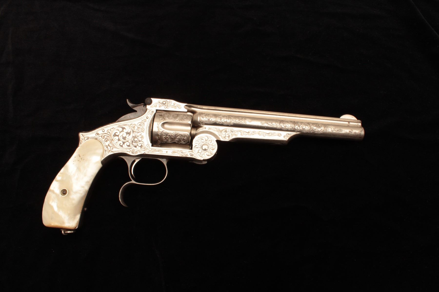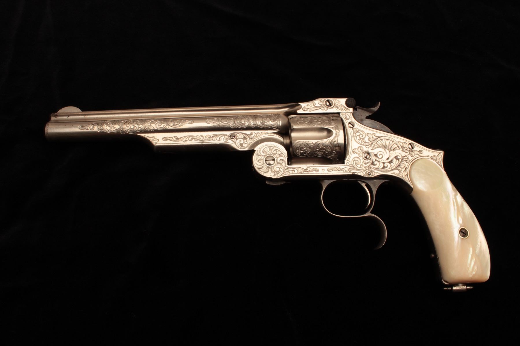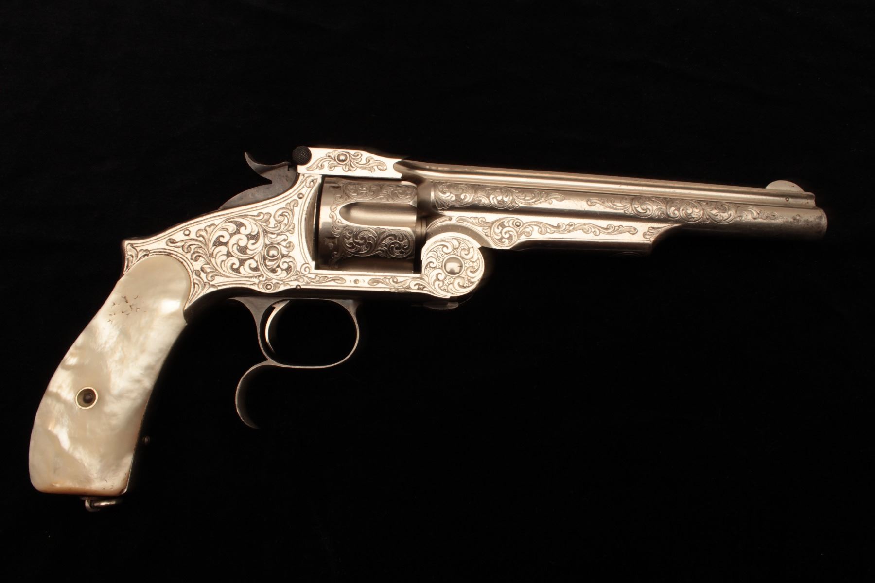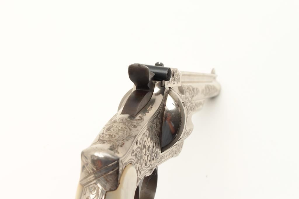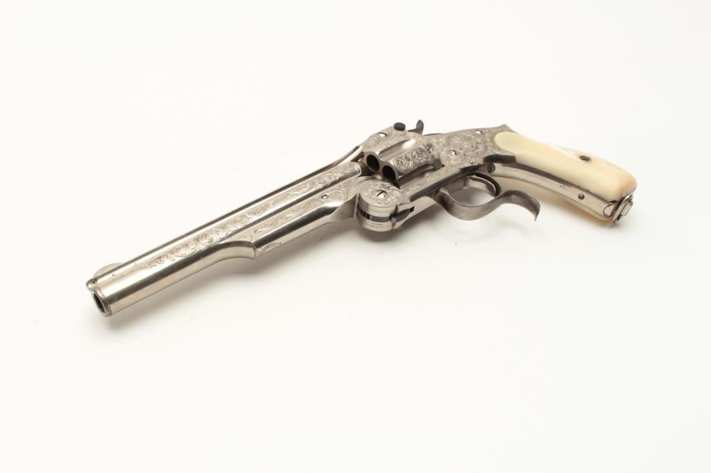 Smith & Wesson Model 3 Second Model revolver in .44 caliber “Russian”, S/N 33026 and shipped to Hartley & Graham of New York in August of 1874 and finely New York style engraved possibly by L.D. Nimscke. This Lot Title subject revolver was found in Mexico by old time collector and author Lee Silva who obtained it from a prominent family’s private museum and sold it to Ray Biley in early 1990’s. There is a “R’ carved inside each Lot Title grip and slight traces of carving and inked scene on the right side that may have been a wreath with stars. The pistol shows 90%-95% bright original nickel finish with losses at the muzzle and straps and no polishing. The Lot Title metal surfaces are crisp and near excellent with well-defined edges and sharp address. Original colors on small parts, trigger, and screws. The grips are near fine with slight handling and minor edge wear. The bore is Lot Title excellent and ejector “Pops” with most of it’s original blue. The interior shows little to no use. The action is tight and the bore is near mint. The engraving is of high quality and genuine to the 19th century. The