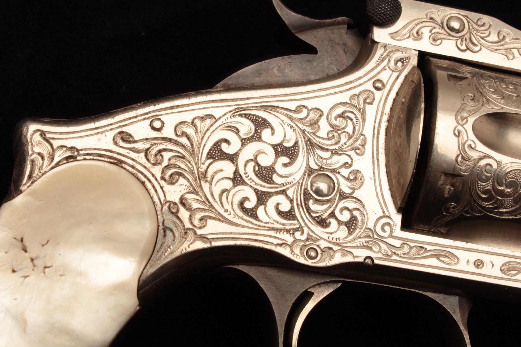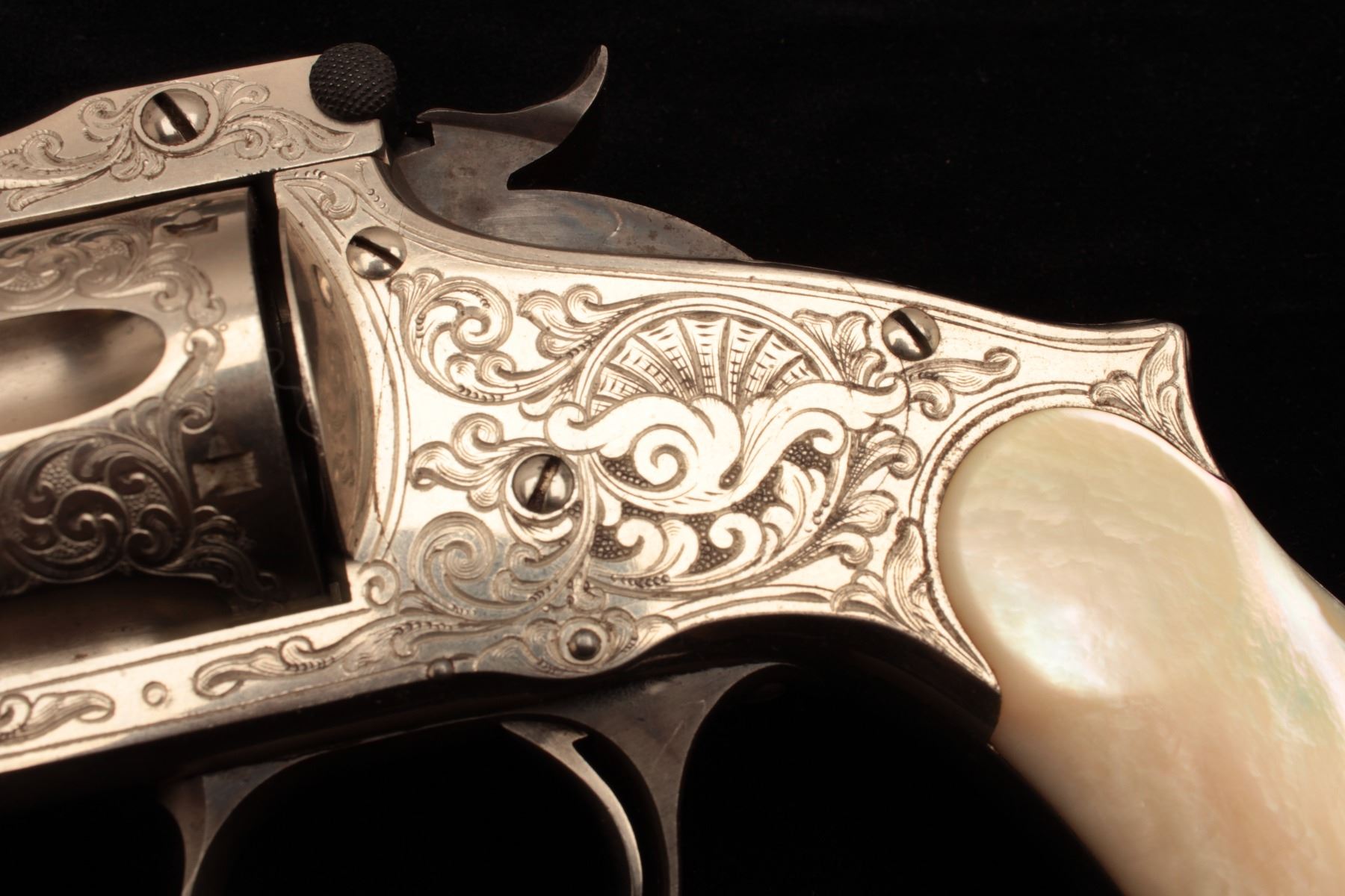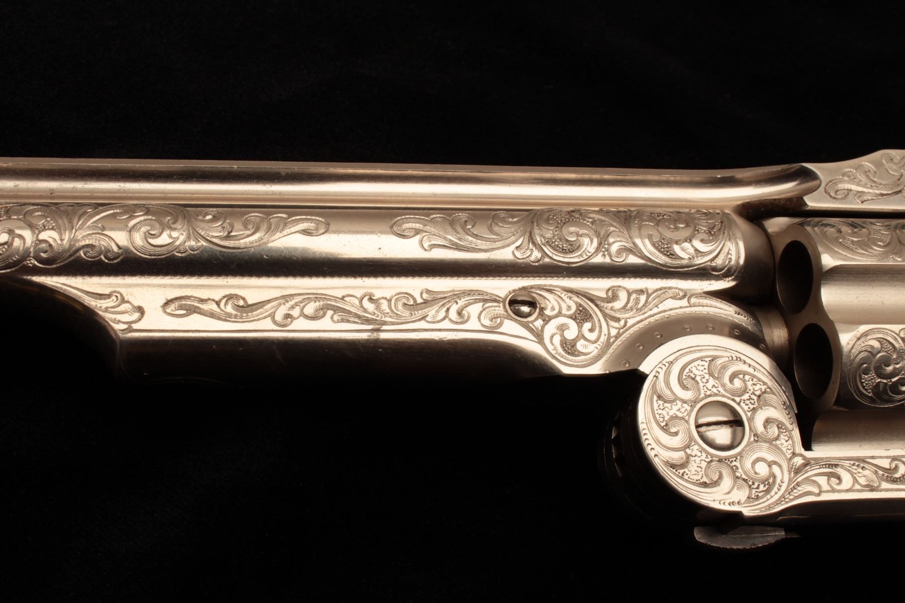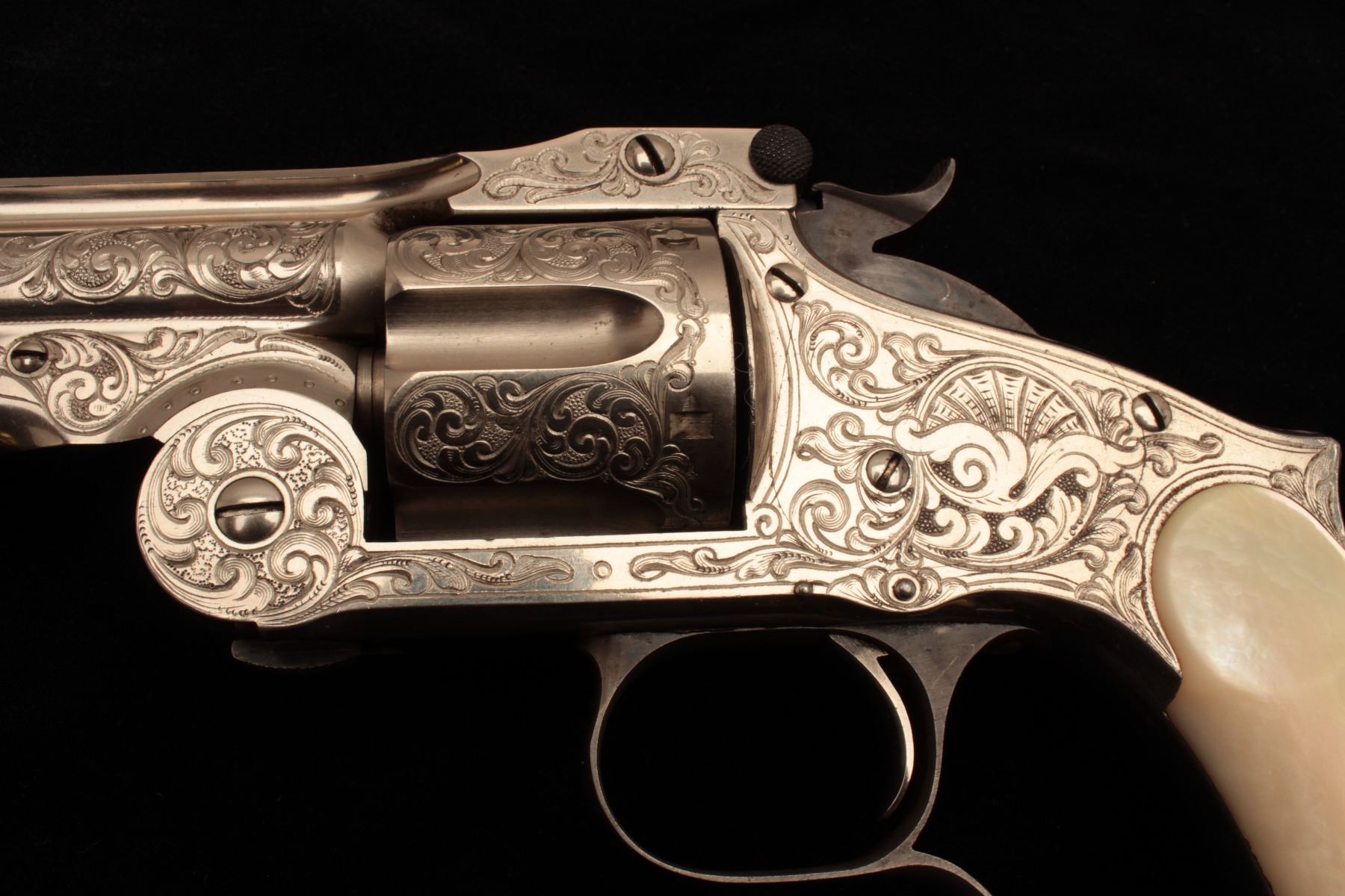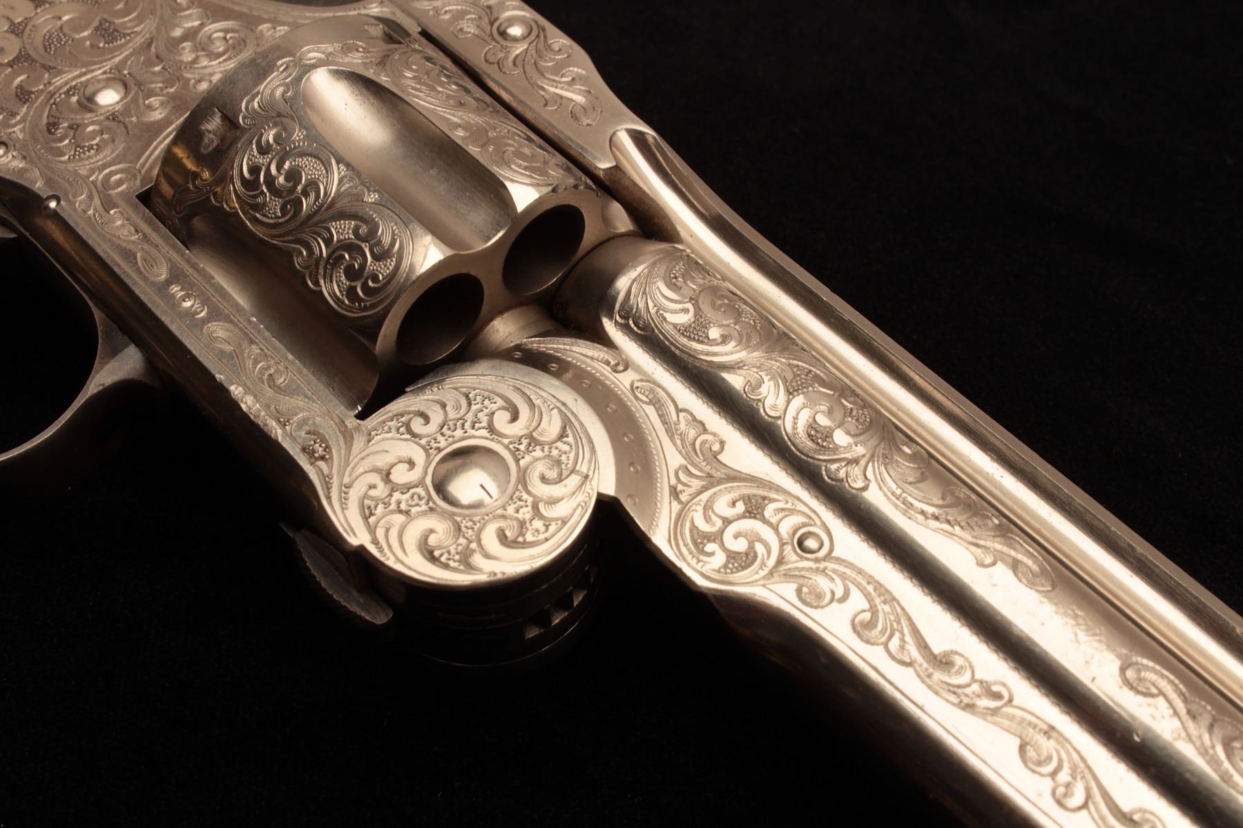 Smith & Wesson Model 3 Second Model revolver in .44 caliber “Russian”, S/N 33026 and shipped to Hartley & Graham of New York in August of 1874 and finely New York style engraved possibly by L.D. Nimscke. This Lot Title subject revolver was found in Mexico by old time collector and author Lee Silva who obtained it from a prominent family’s private museum and sold it to Ray Biley in early 1990’s. There is a “R’ carved inside each Lot Title grip and slight traces of carving and inked scene on the right side that may have been a wreath with stars. The pistol shows 90%-95% bright original nickel finish with losses at the muzzle and straps and no polishing. The Lot Title metal surfaces are crisp and near excellent with well-defined edges and sharp address. Original colors on small parts, trigger, and screws. The grips are near fine with slight handling and minor edge wear. The bore is Lot Title excellent and ejector “Pops” with most of it’s original blue. The interior shows little to no use. The action is tight and the bore is near mint. The engraving is of high quality and genuine to the 19th century. The