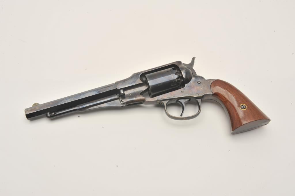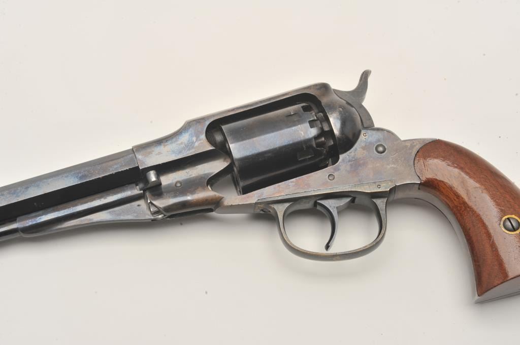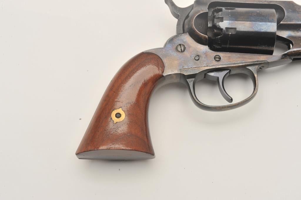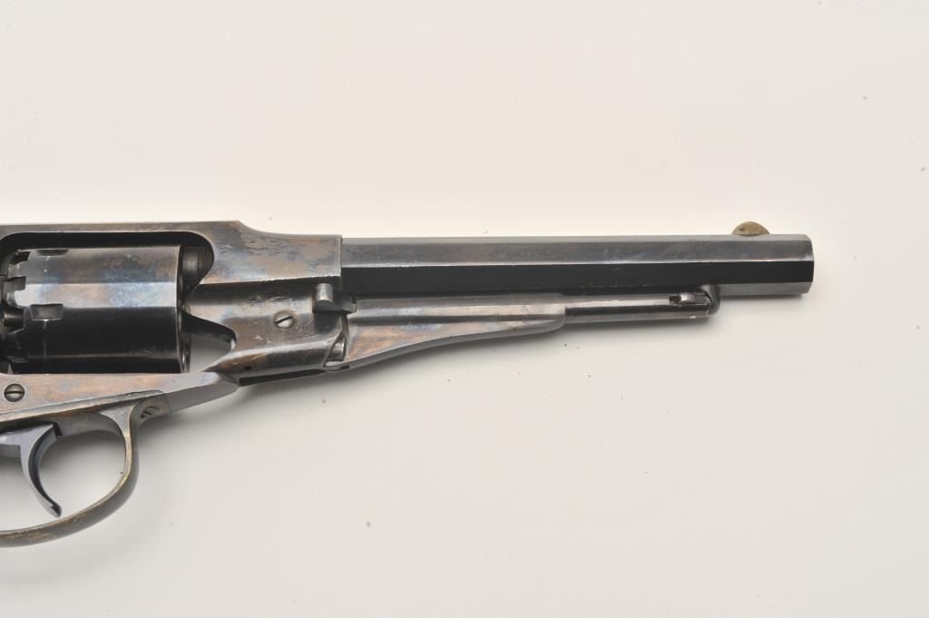 Remington New Model belt Double Action revolver in .36 caliber percussion, S/N 3287 with 6 ½” octagon barrel and blue finish. Only about 4000 produced between 1863-1873. The revolver shows 75%-85% bright original Lot Title blue with excellent to near mint metal surfaces. The finish has flaked where lost. The pistol shows almost no use with excellent grips and pristine interior. (Antique) Est.: $3000-$6000