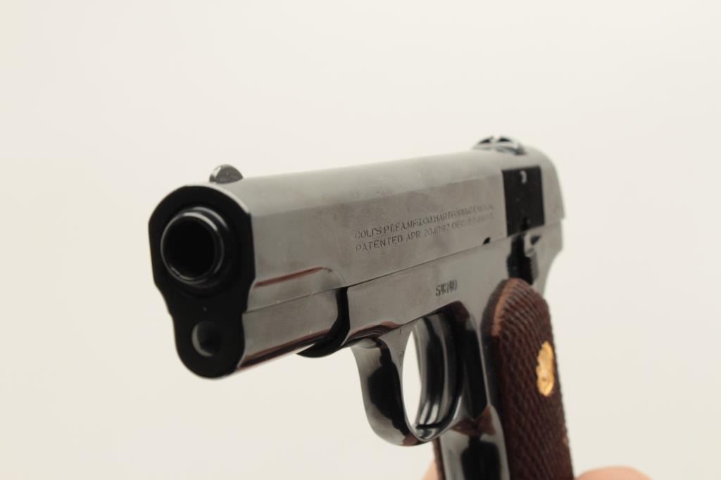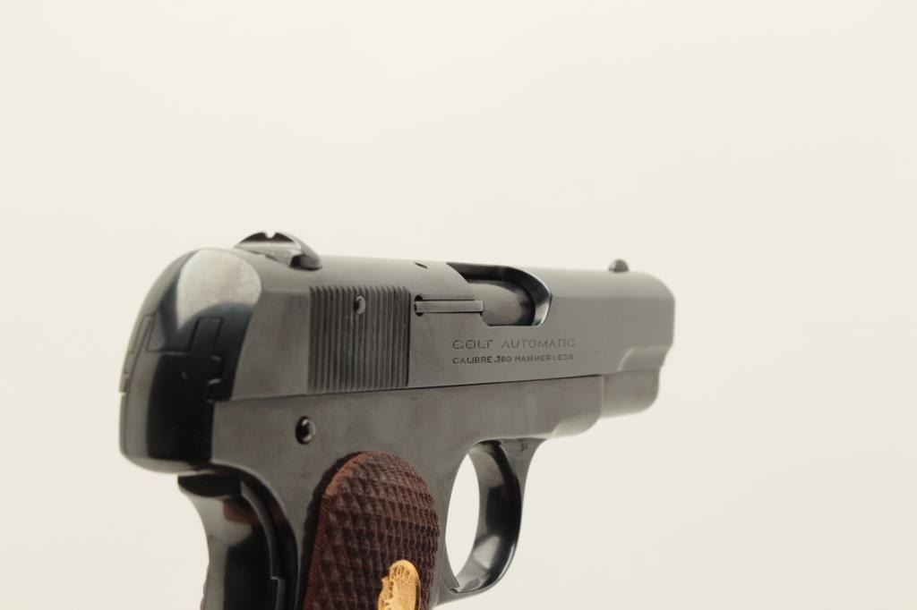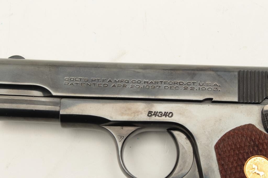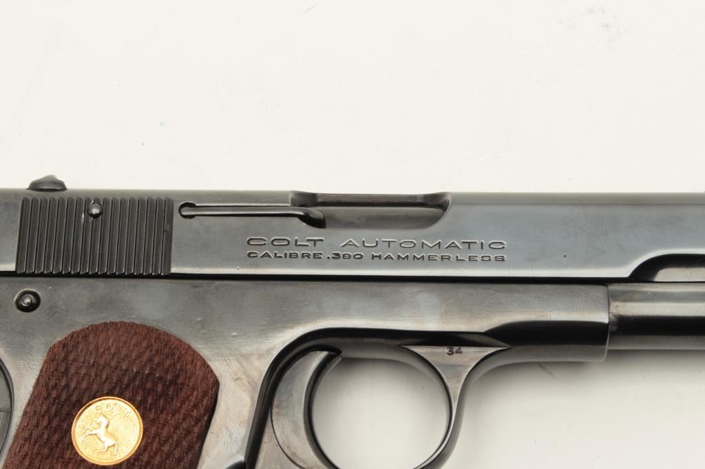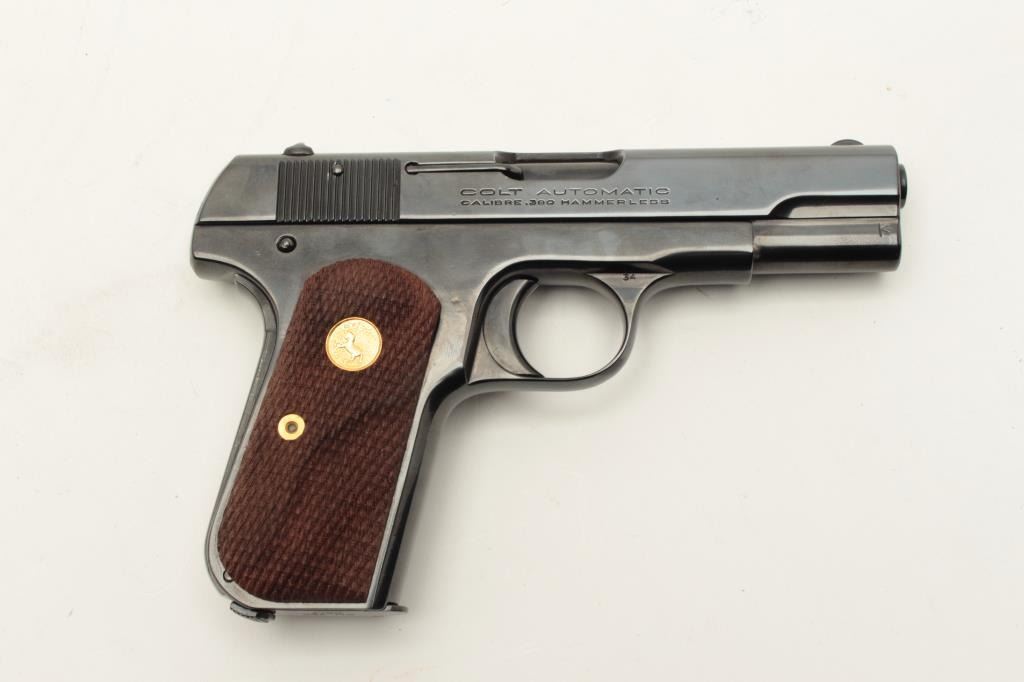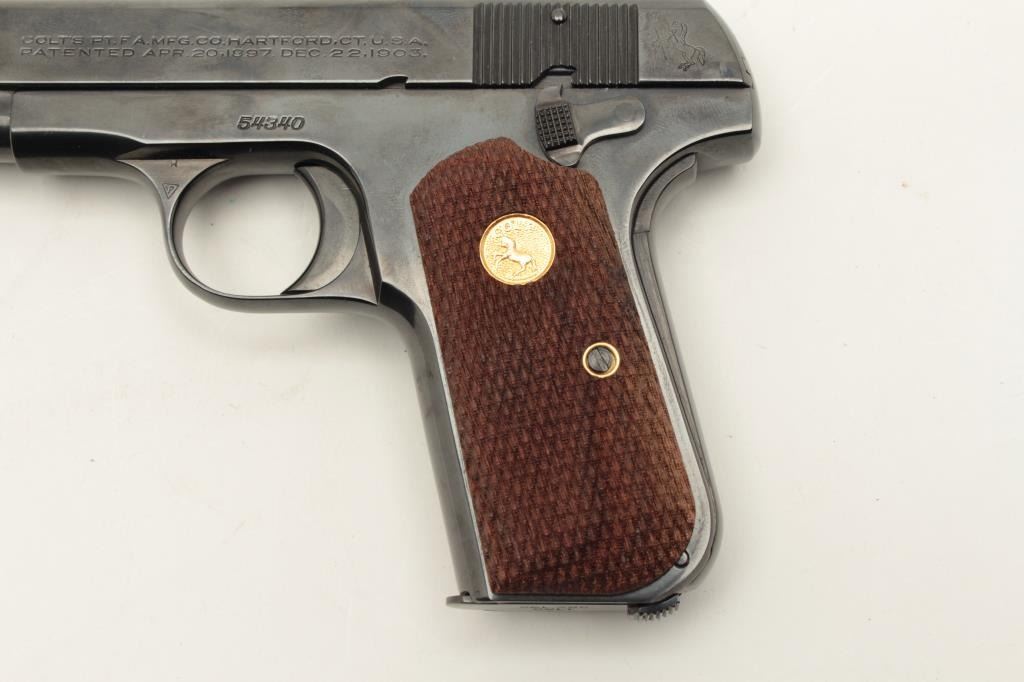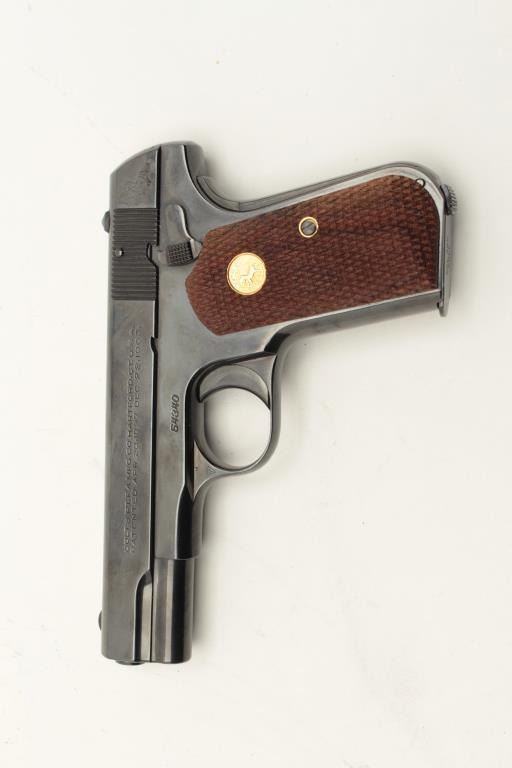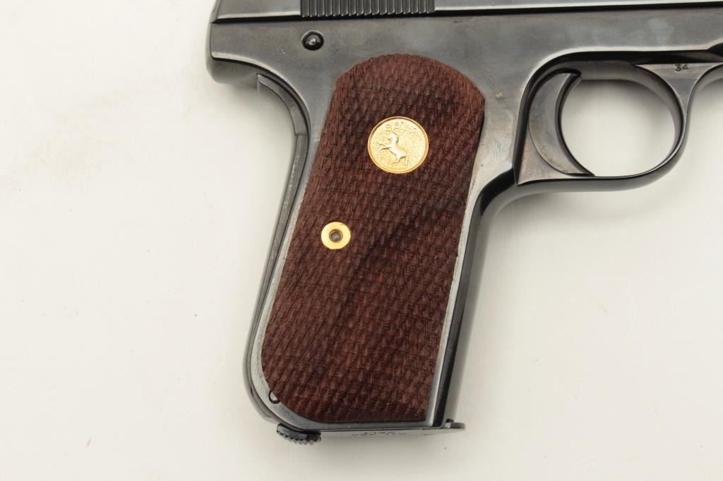 Colt Model 1908 semi-automatic pocket pistol, .380 caliber, 3.75” barrel, old re-blued finish, checkered wood medallion grips, S/N 54340, in overall very good condition as re-finished; good bore, crisp action, very Lot Title good markings and very good to fine grips. (C&R). Est.: $1,200-$1,800.