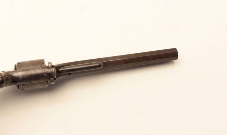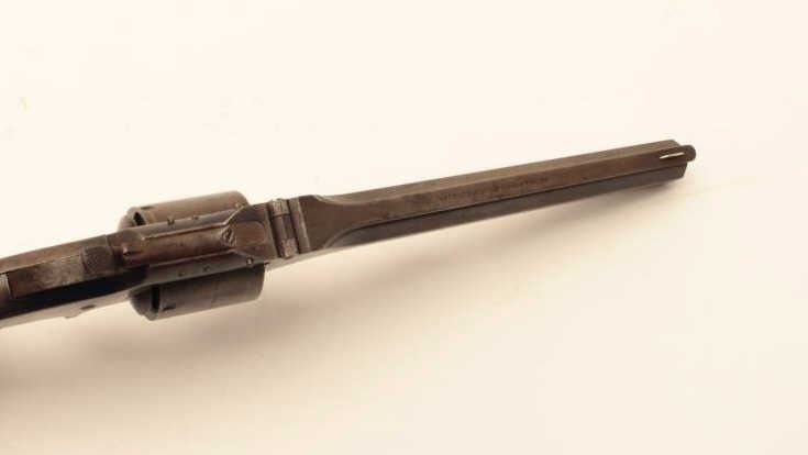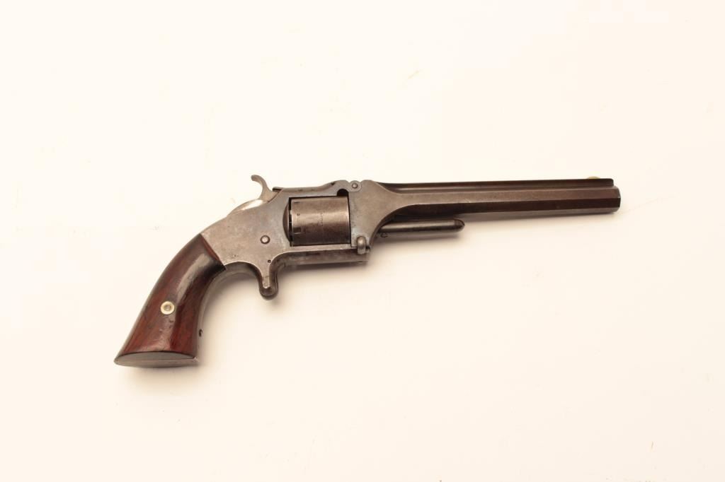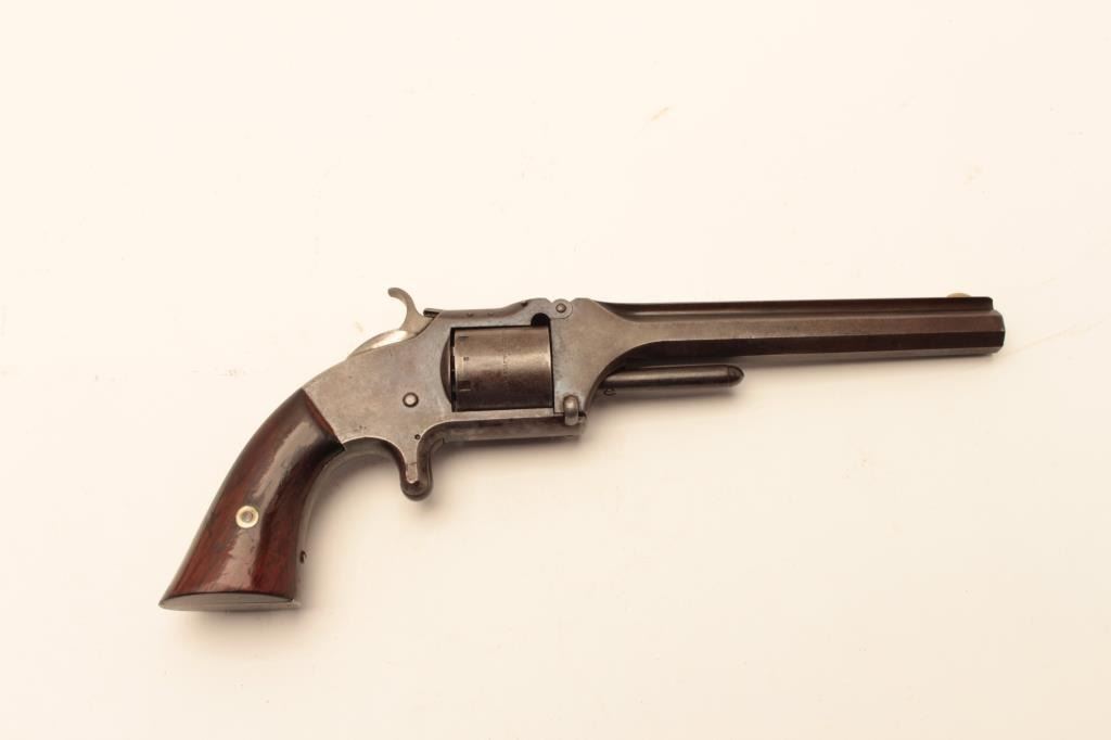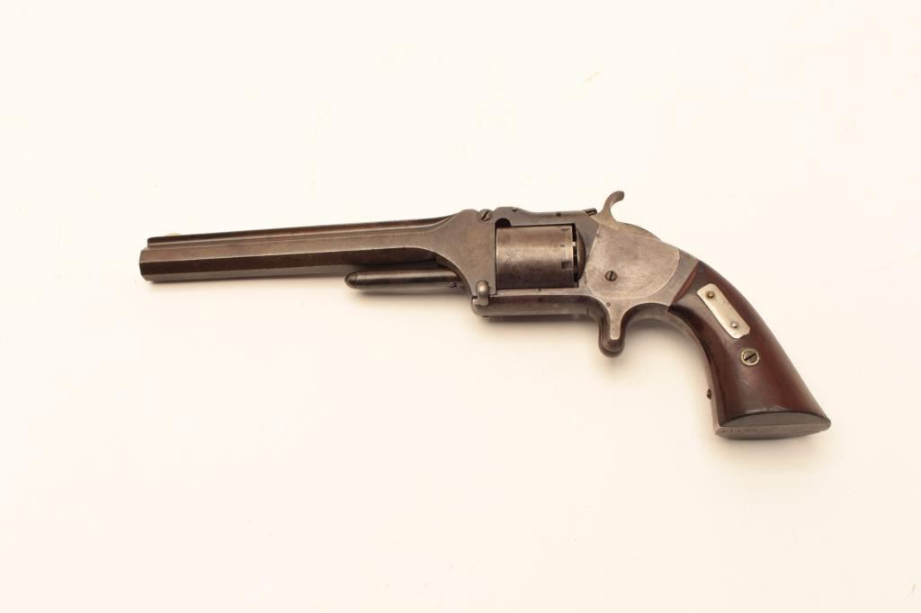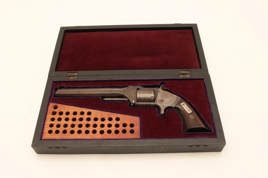 Smith & Wesson #2 Army Single Action revolver in .32 rim fire with a 6” barrel, S/N 27412. Backstrap professionally inscribed with 3 large initials “R.B.F.” in small silver plaque nailed to the left grip with light Lot Title scratching illegible. Included is a large stack of original documents and service records of return B. Forester who owned this revolver. He served in 55th Ohio infantry and 151st Co. 2nd Battalion veteran Reserve Lot Title Corps. Also modern research confirming service and pension. The revolver remains in good condition with 30%-40% blue and good grips. Good markings and good action. From a major local collection with Pelson display Lot Title case. (Antique) Est.:$1500-$3000