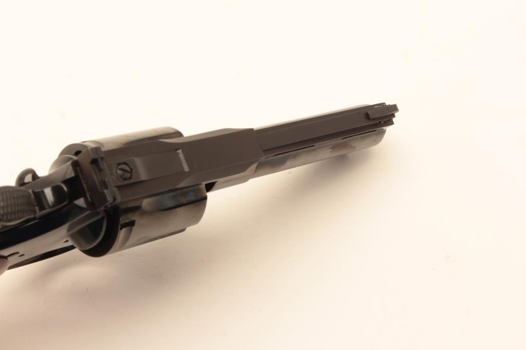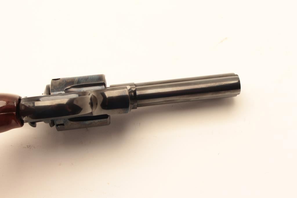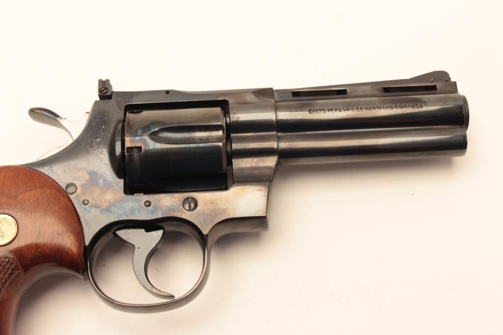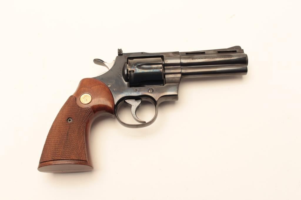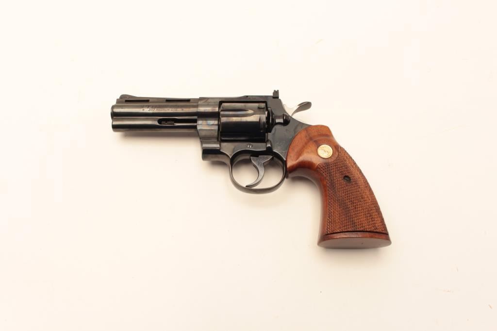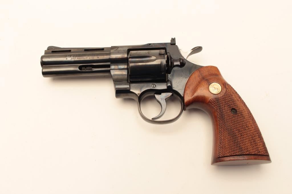 Colt Python .357 Mag Double Action Revolver with a 4” barrel, checkered wood grips and blue finish, S/N E26193. 99% to almost mint. No evidence of use. 1971 owner never fired. (Modern/PPT) Est.: $1500-$3000