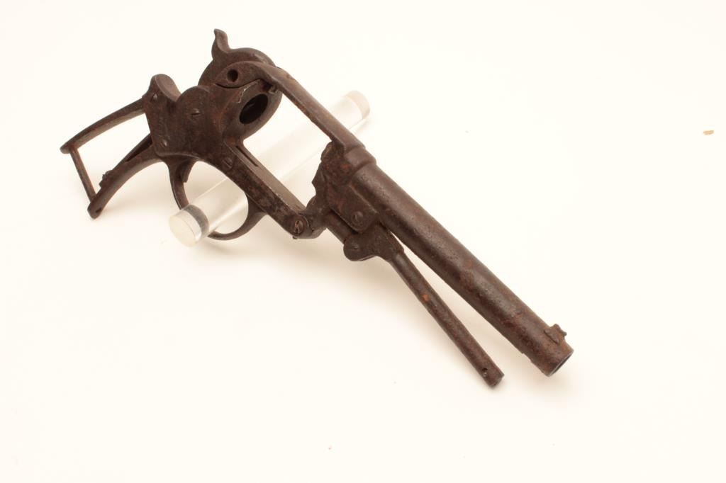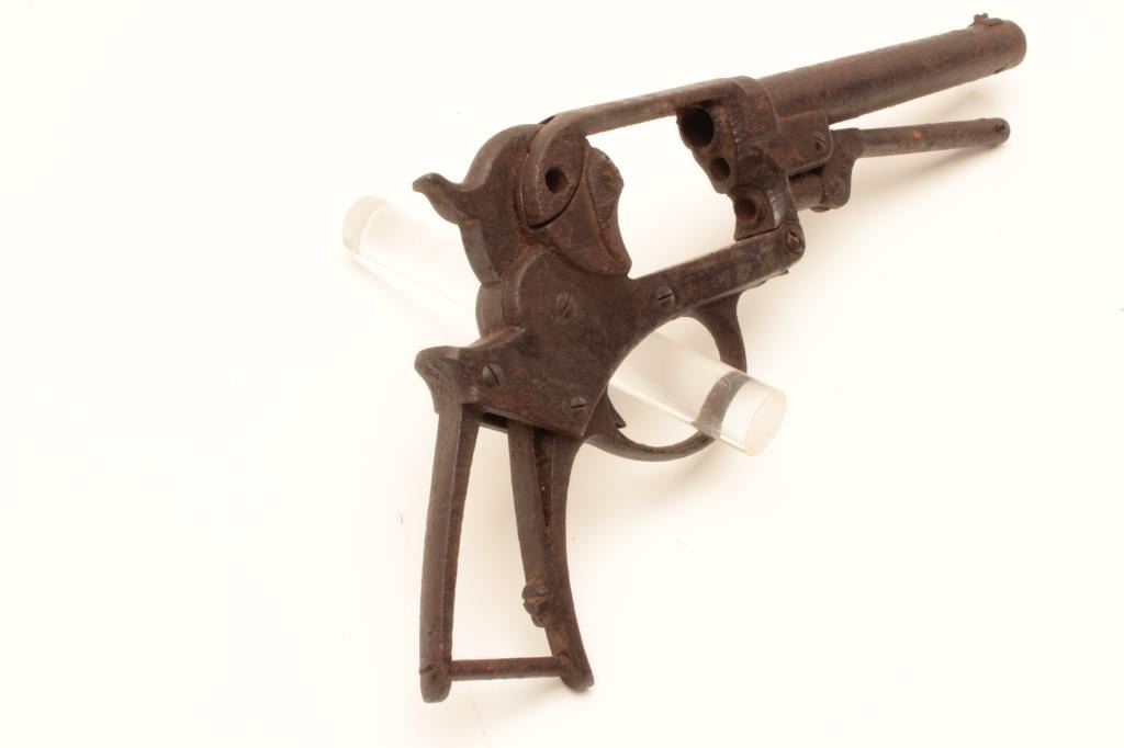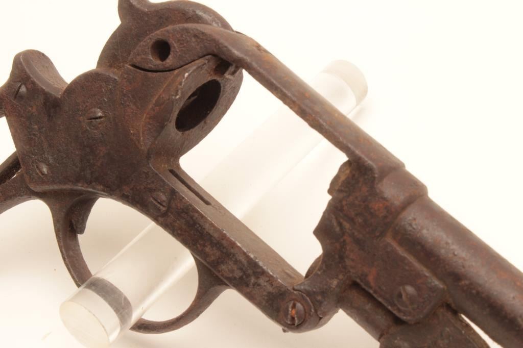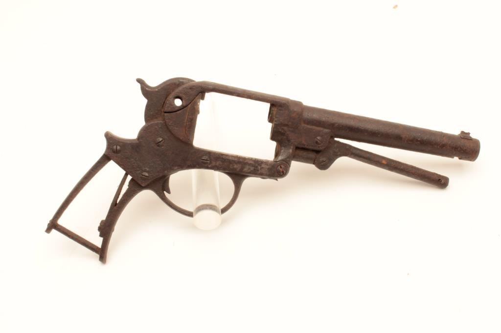 Rusty relic Starr Army Model DA percussion revolver, missing cylinder, grips and trigger; also missing barrel release screw; old tag attached states “52/45 Cal Starr found in sand pit at Hay Warden, IA by some Lot Title Indians 1952”. From the collection of John O. Beckwith. Est.: $250-$500.