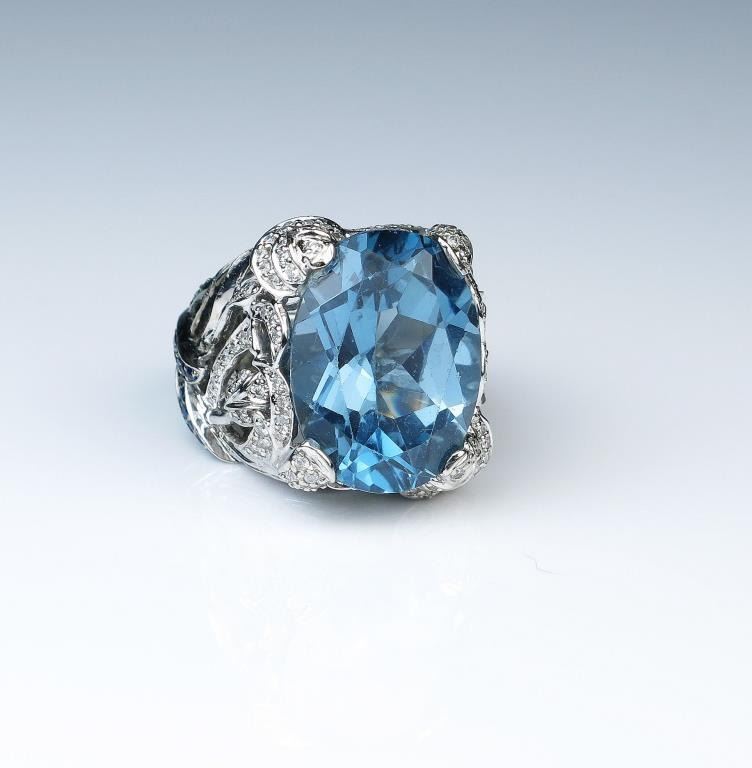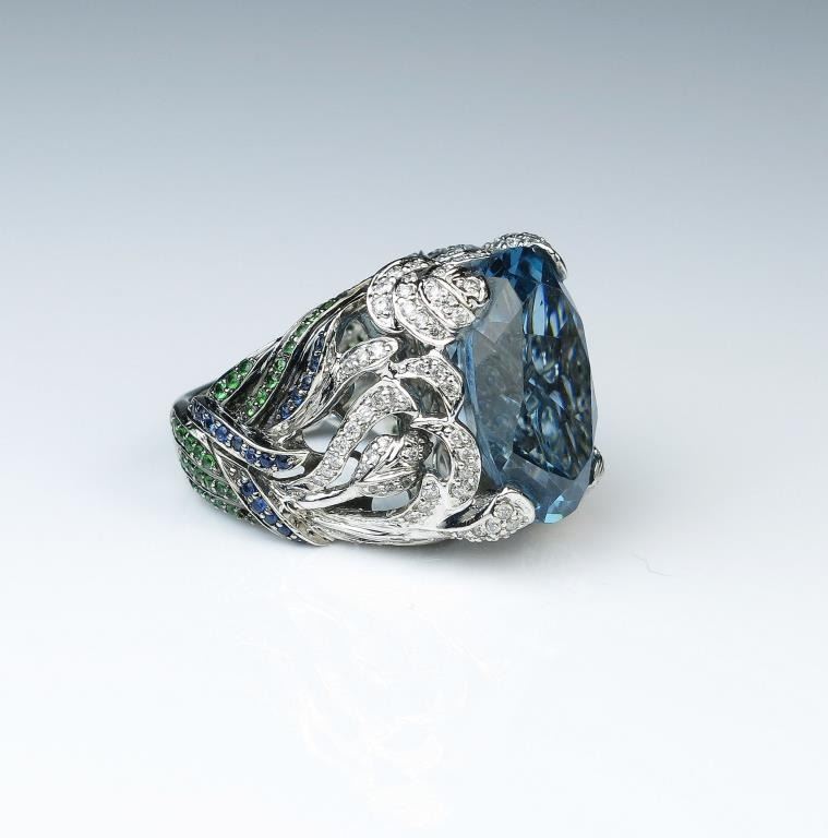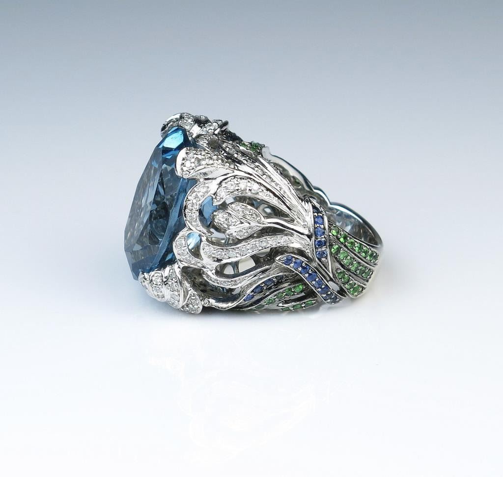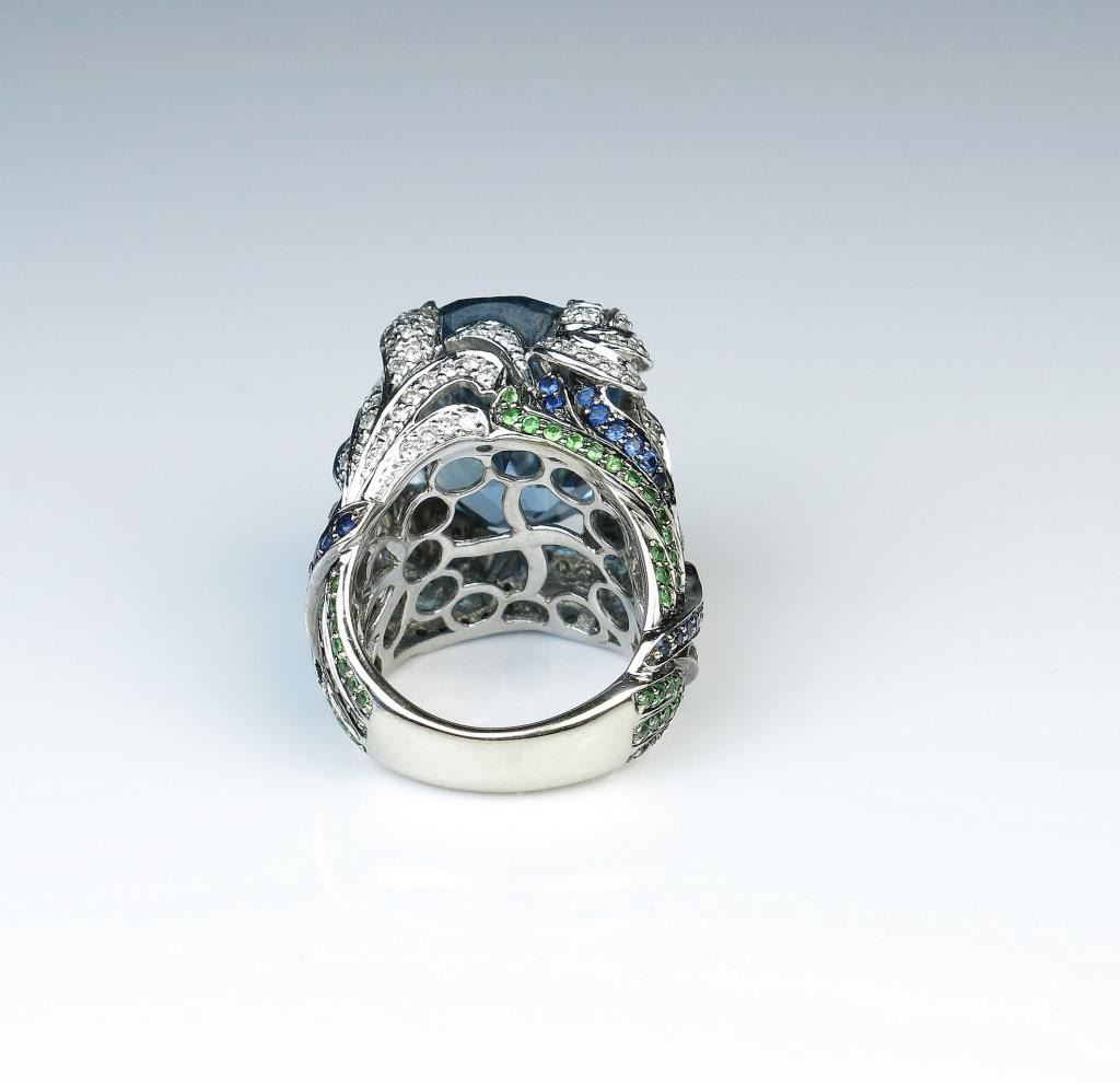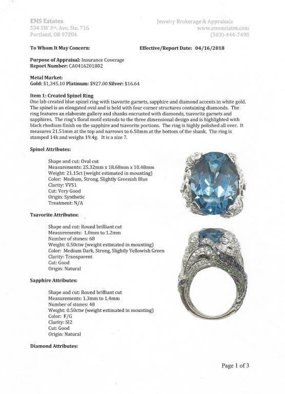 Spectacular Bulgari style fashion ring featuring a huge created Blue Spinel weighing approx. 25.00 carats with beautifully designed setting with over 270 round pave set Diamonds with F-G colors, natural Blue Lot Title Sapphire and Tsavorite Garnet combination weighing approx. 2.50 carats set in heavy 14 karat white gold setting. Full Appraised Value $6,000.00 Estimates $3,000-$4,000