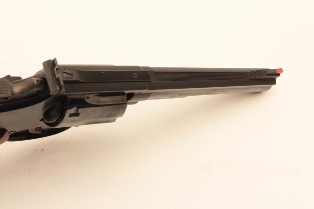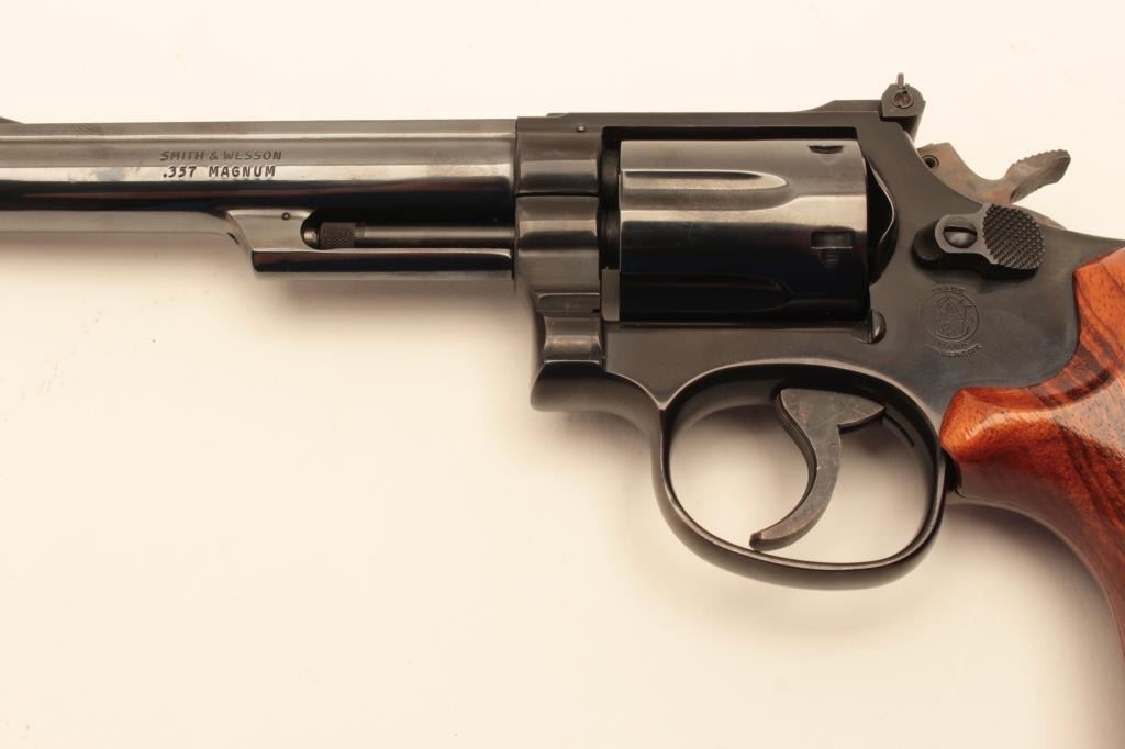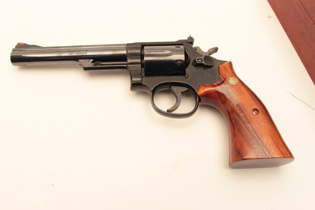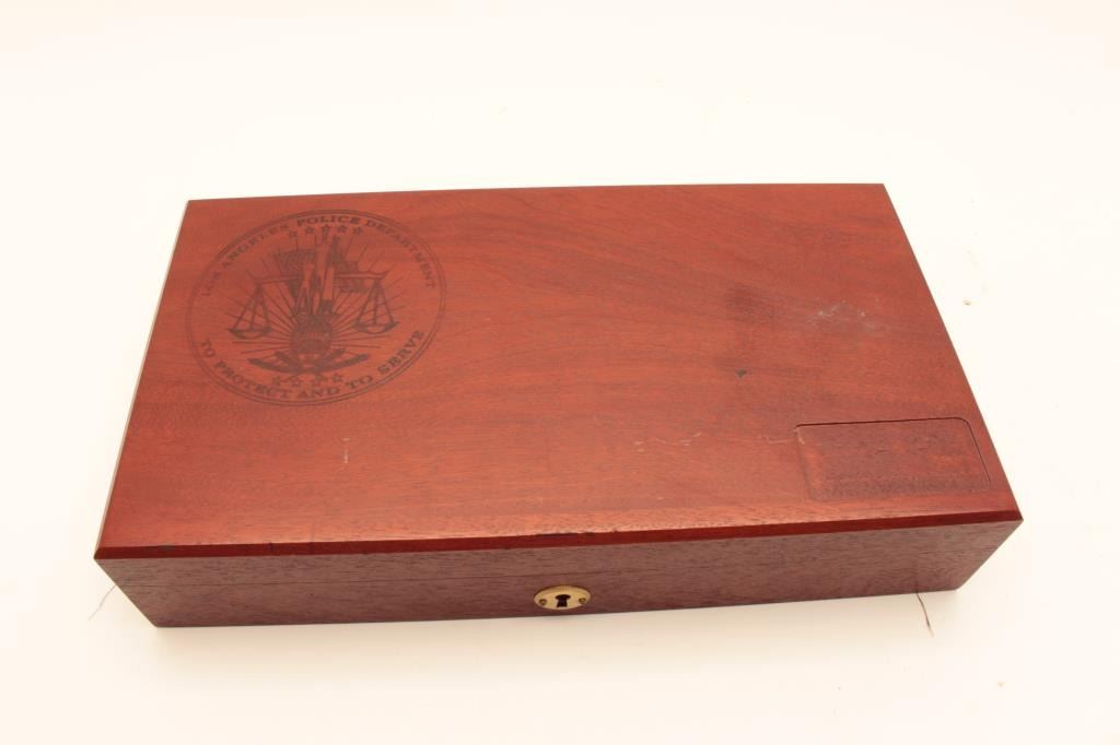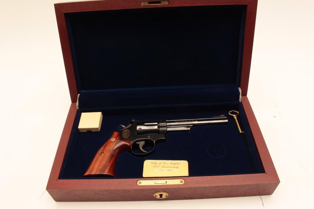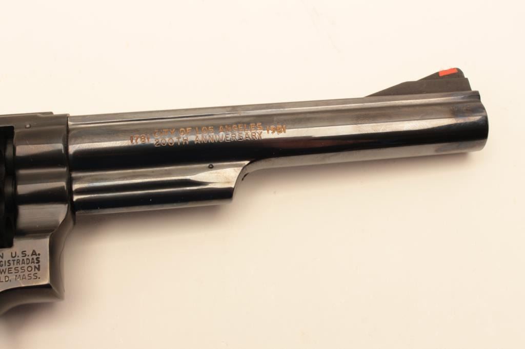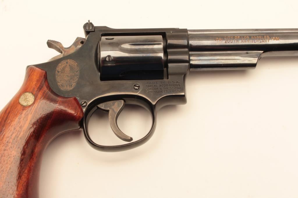 Smith & Wesson 19-4 LAPD Commemorative, #69K4381, blued finish, .357 Mag., 6" barrel, adjustable sights with smooth logo target grips. Revolver is in fine condition overall, 95-98% original blue, grips are Lot Title fine, bore and action are excellent. Includes Los Angeles Police Department logo wooden display case in very good condition. There is an area of stickiness where something was spilled onto the top of the Lot Title case which may clean. (Modern / PPT) Est. $700-1400