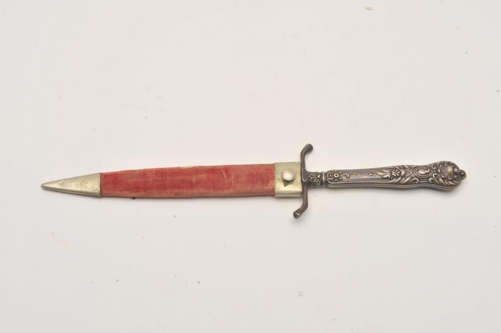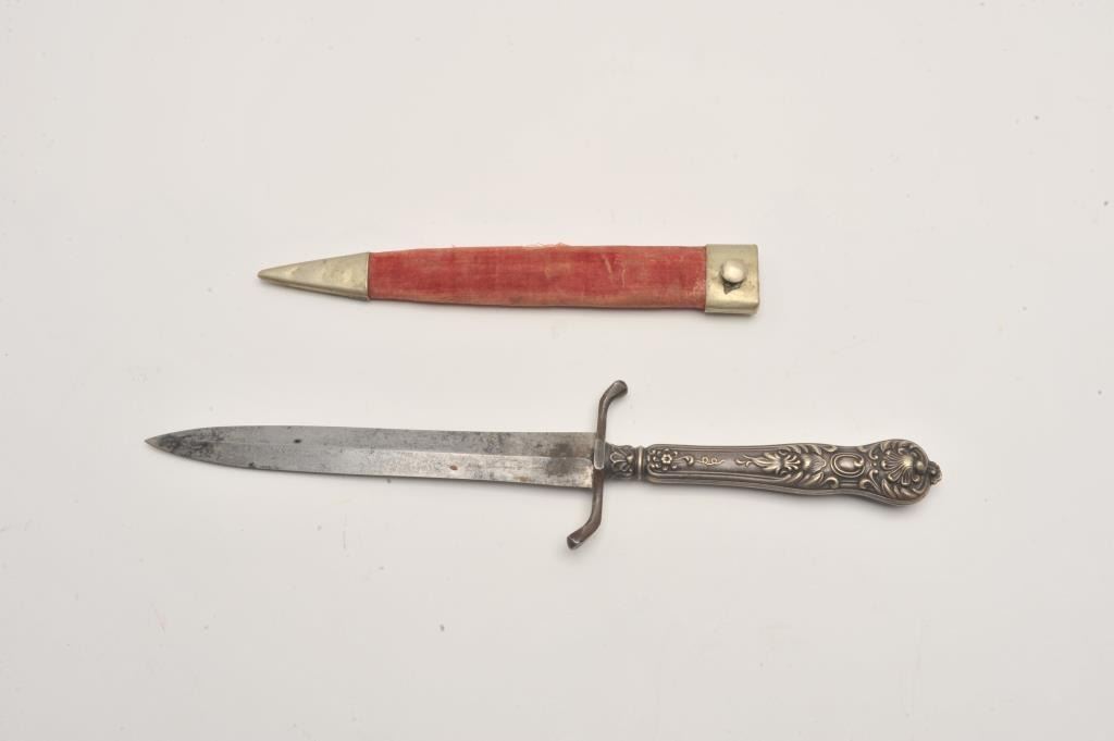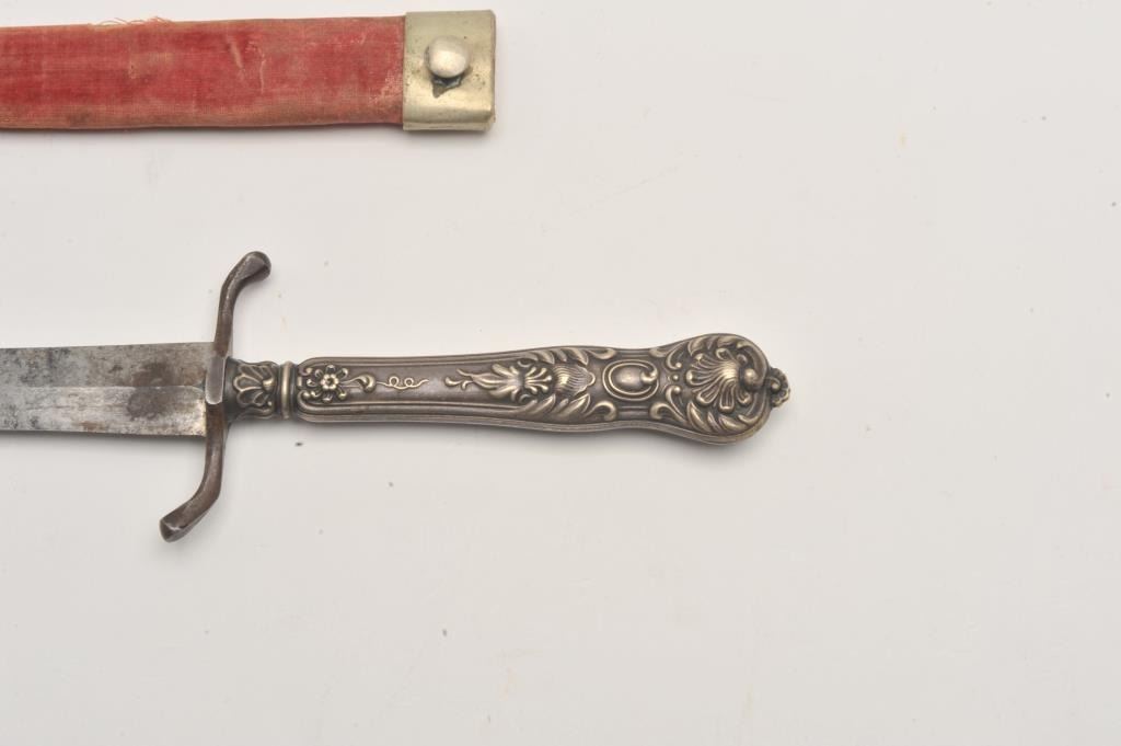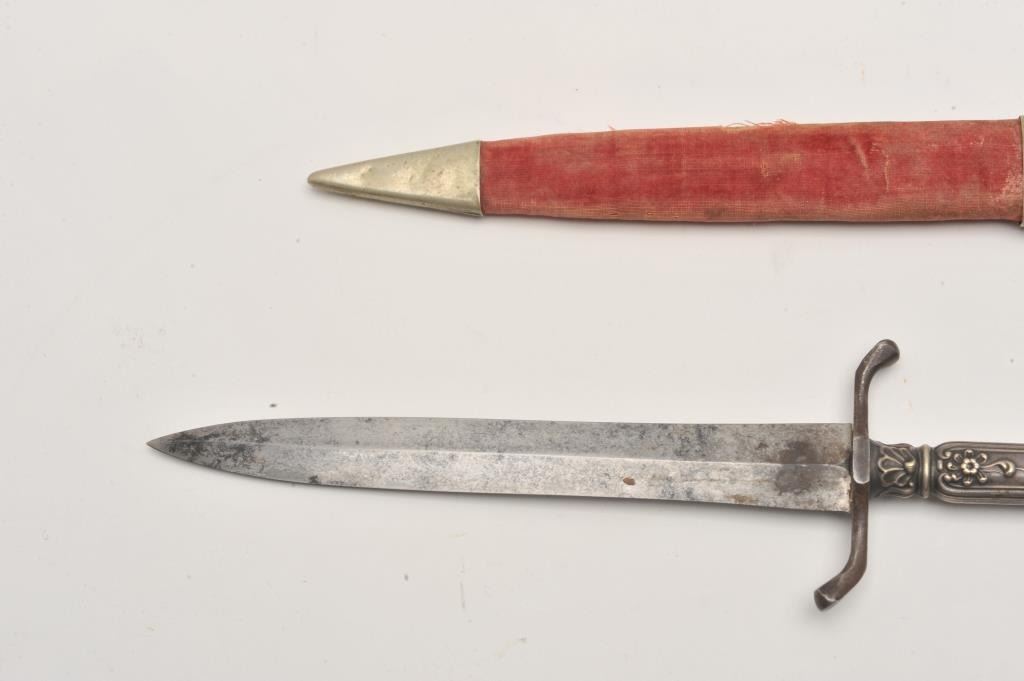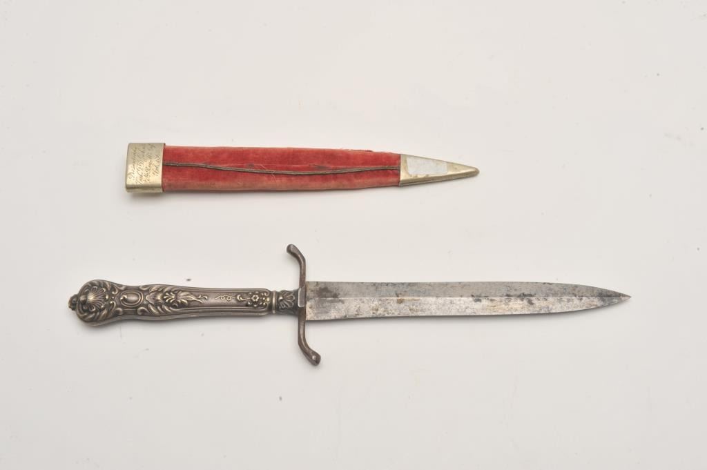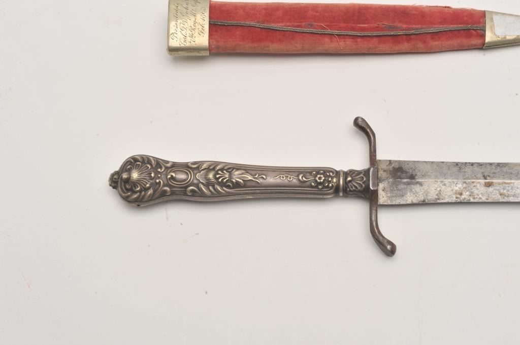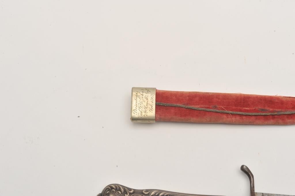Silver cutlery handled spear point dirk with cross guard and original scabbard whose throat is period script inscribed “Col T.D. Johns, 7th Reg, MS Inf, Feb. 1863” in 4 lines. Measures 9 ½’ overall with a 6” blade. Lot Title Good condition with normal staining and aging on the blade. Good scabbard and good overall. Authentic and from a major local collector. Est.: $900-$1800