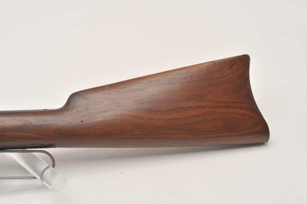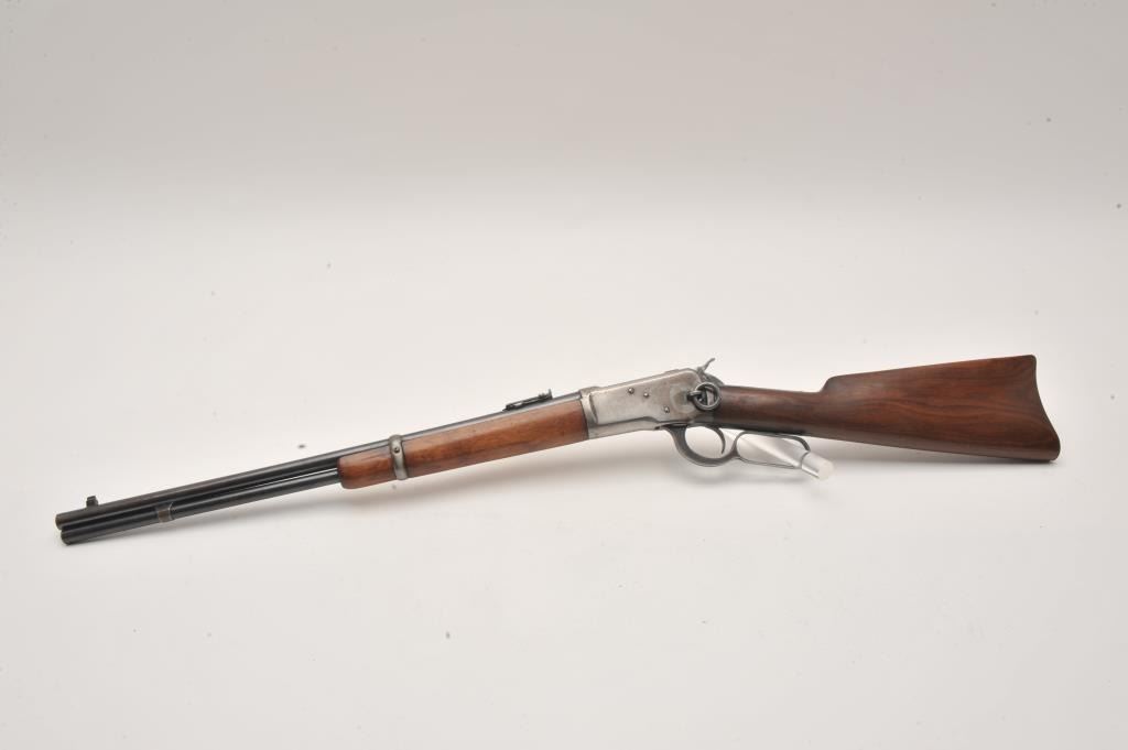 Winchester Model 1892 SRC in .32-20 caliber, S/N 911255. The barrel and magazine tube retains 50%-70% original drifting and toning blue finish. Sharp address and caliber markings. Correct carbine sights. The frame Lot Title shows traces of blue with patina and gray metal. The stocks are very good plus with minor clear varnish. The action is crisp and the bore is excellent. (C&R) Est.: $800-$1600