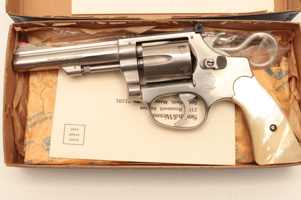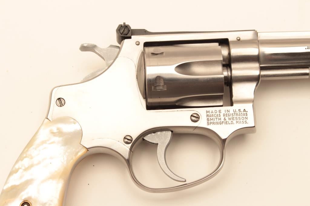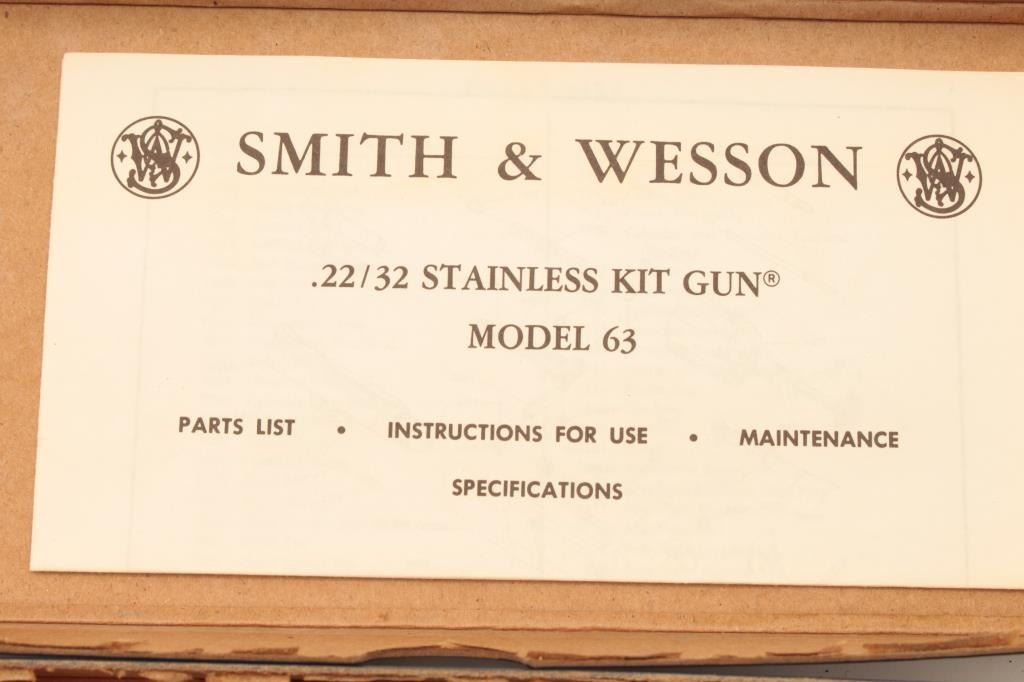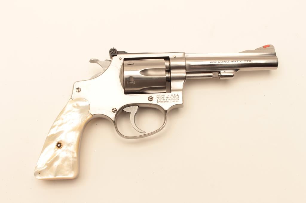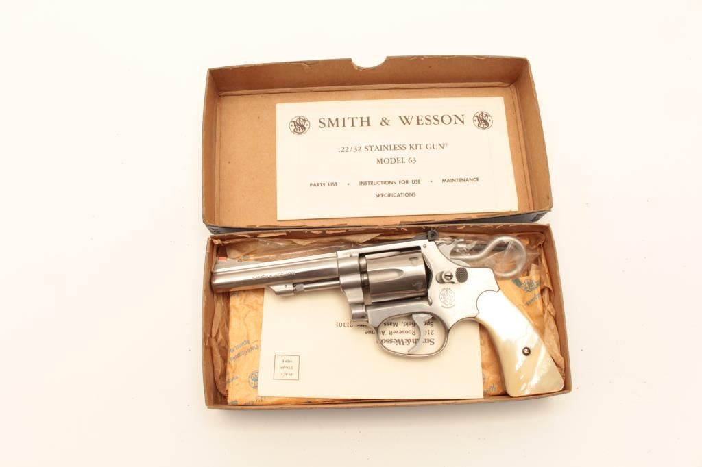 Smith & Wesson Model 63 22/32 stainless “Kit Gun” with a 4” barrel in .22 L.R. caliber, S/N M149003. Red ramp front sight and aftermarket pearl grips. Fine to excellent used condition in original blue and silver Lot Title box. Very seldom seen. (Modern/PPT) Est.: $400-$800
