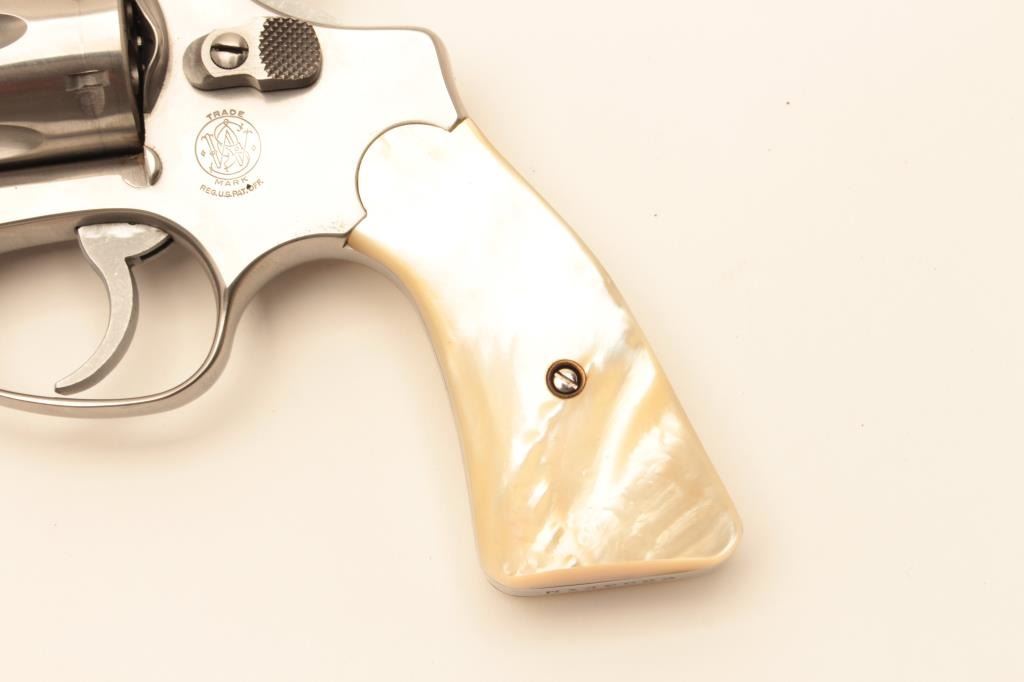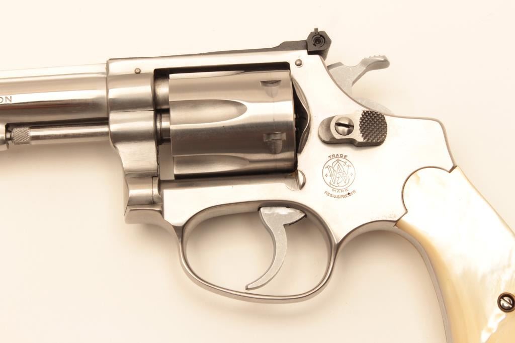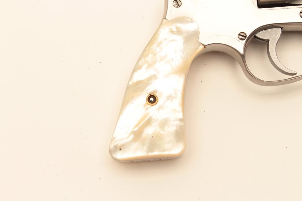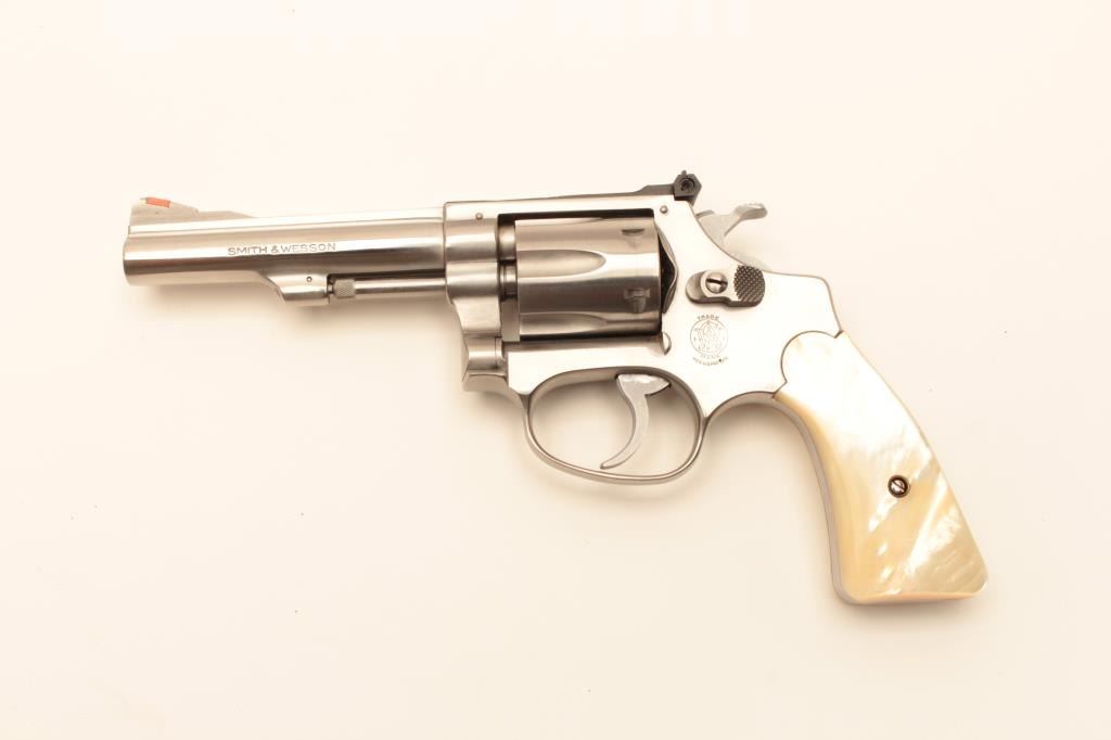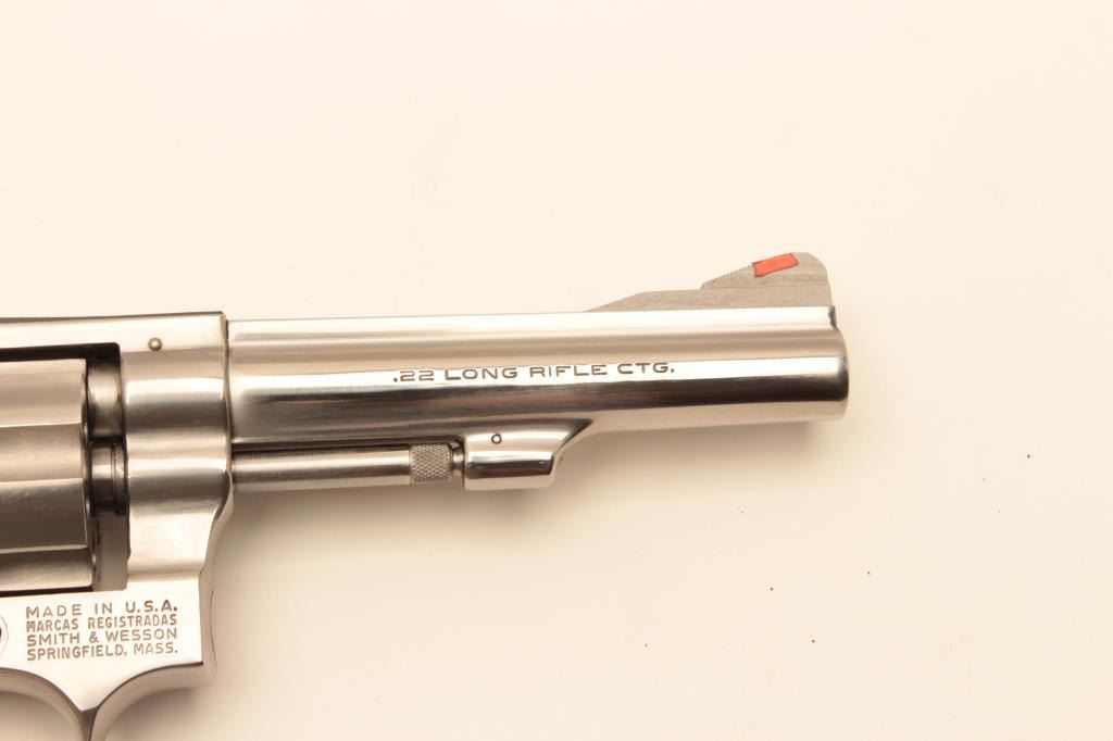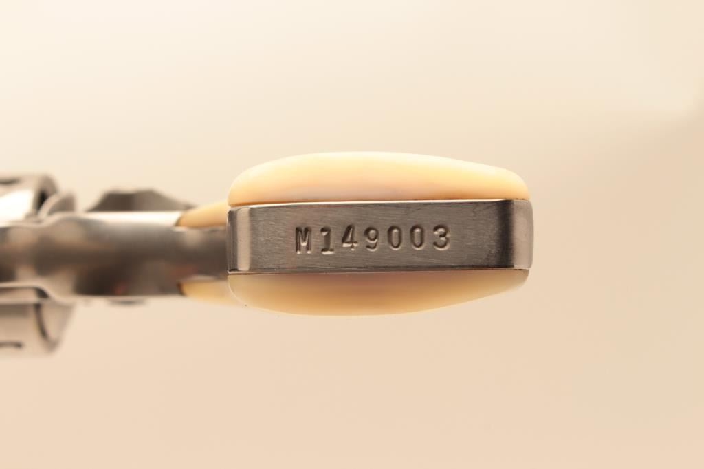 Smith & Wesson Model 63 22/32 stainless “Kit Gun” with a 4” barrel in .22 L.R. caliber, S/N M149003. Red ramp front sight and aftermarket pearl grips. Fine to excellent used condition in original blue and silver Lot Title box. Very seldom seen. (Modern/PPT) Est.: $400-$800