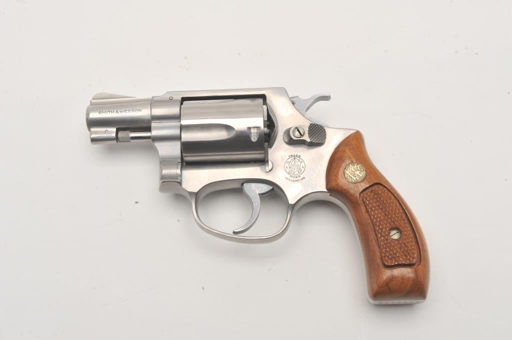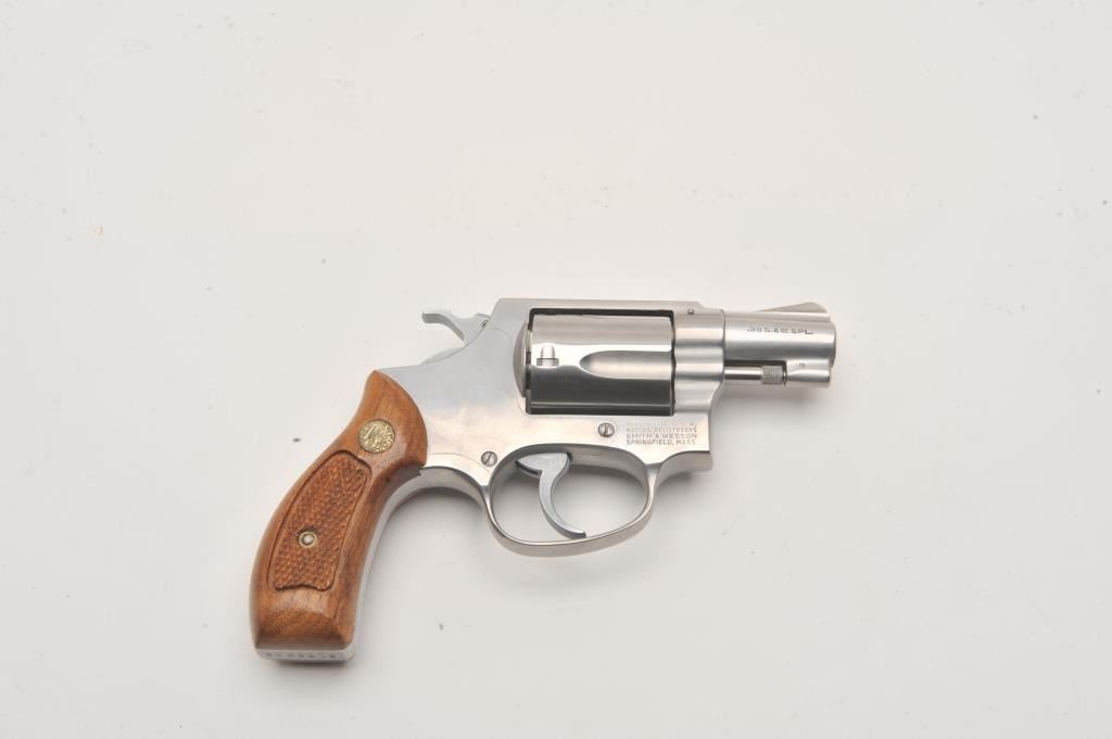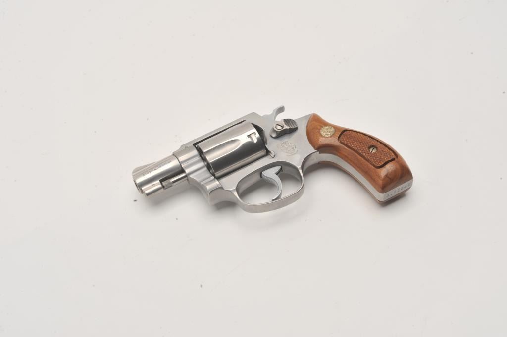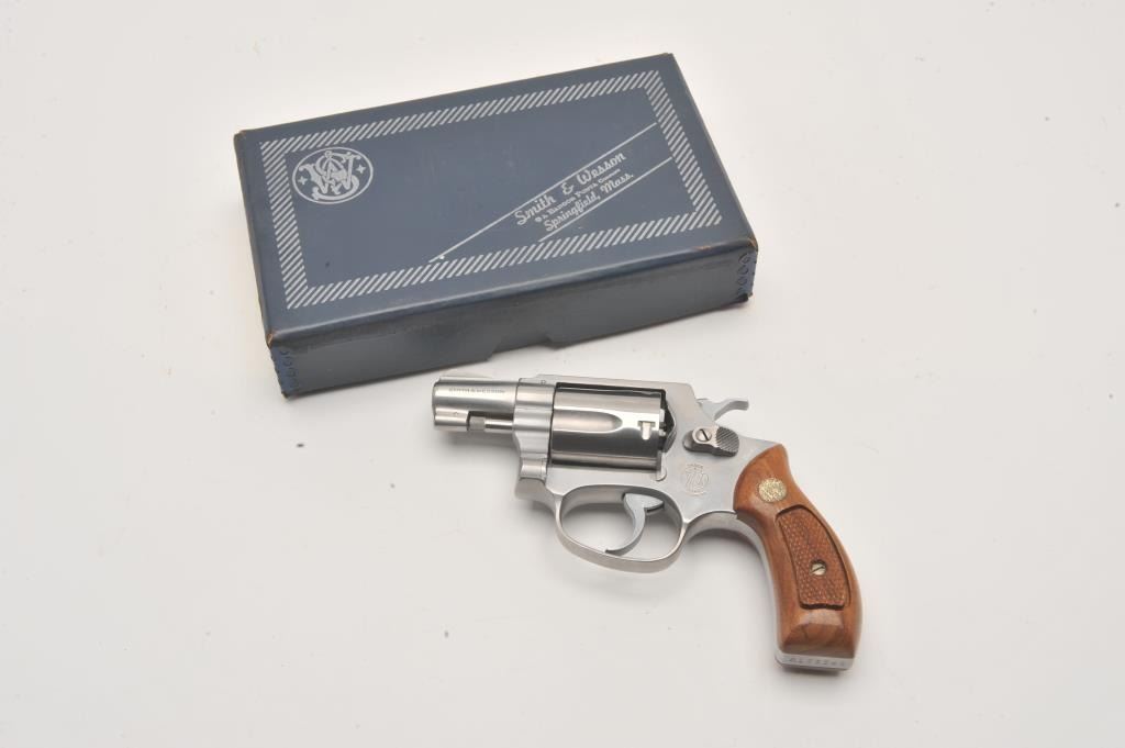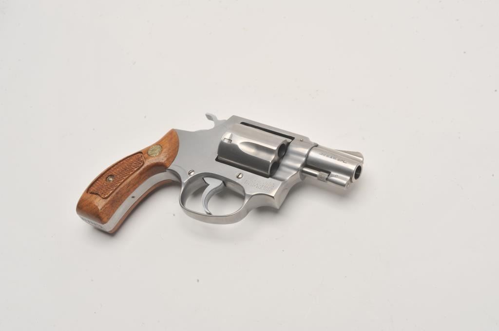 Smith & Wesson Model 60 stainless steel Chiefs Special double action revolver in .38 caliber with a 2” pinned barrel and medallion wood grips, S/N R155546. Excellent condition in original blue and silver box. 99% plus Lot Title condition with possible minor use. (Modern/PPT) Est.: $400-$800