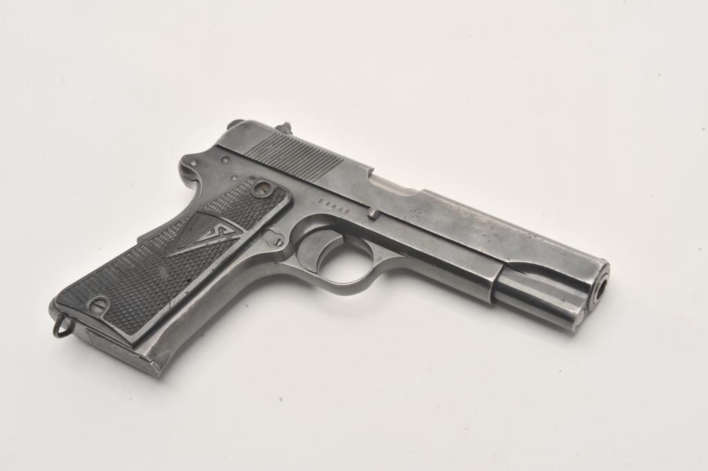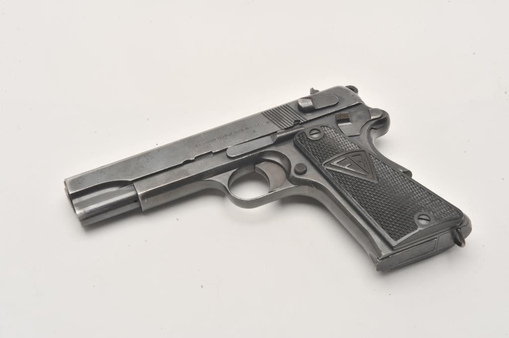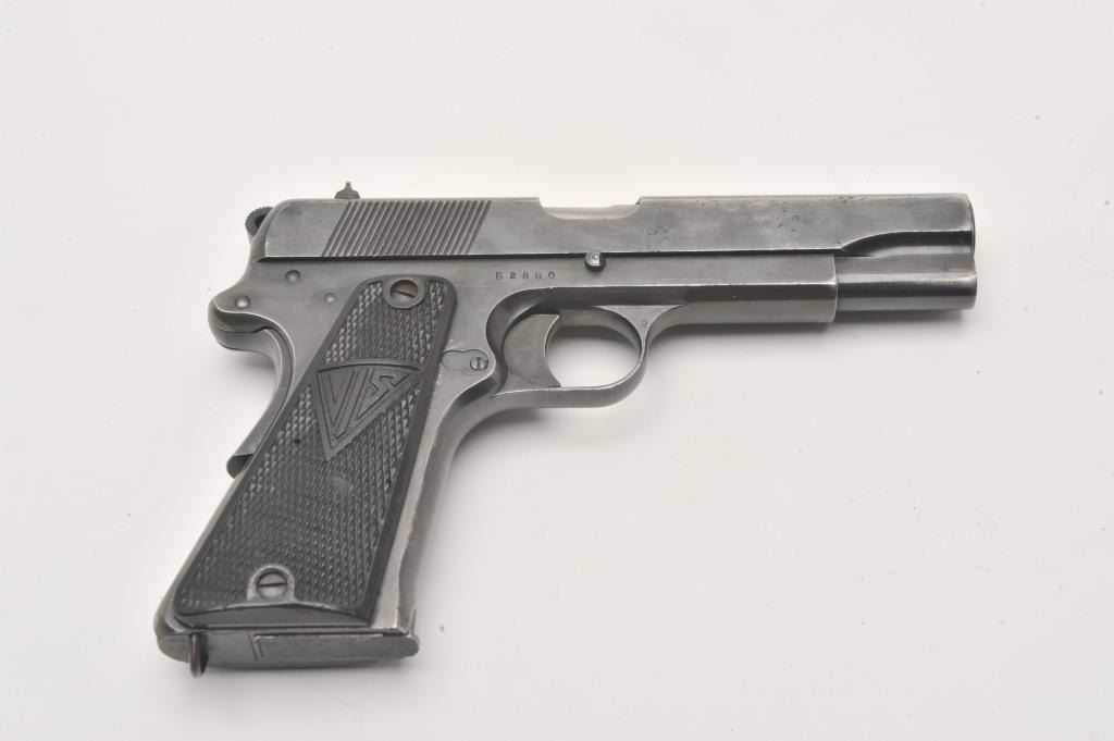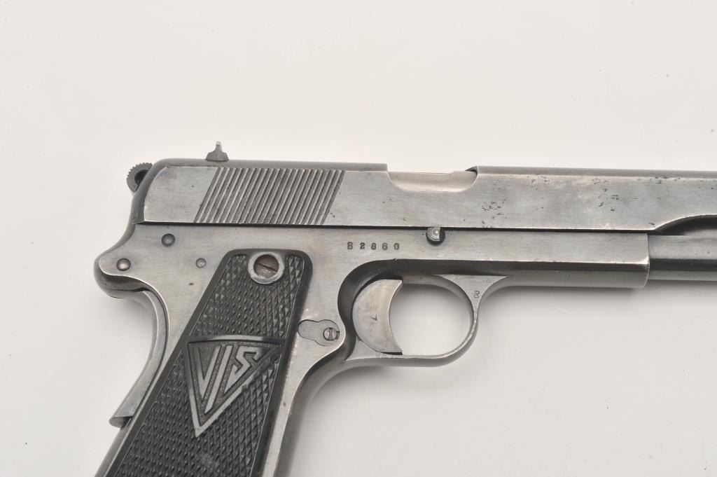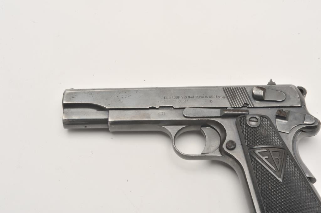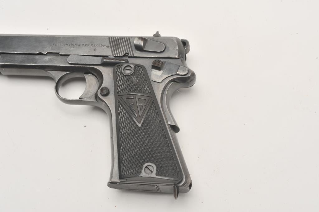 Polish Radom 9mm Model 35 Semi-Auto pistol cut for stock with Nazi proofs, S/N 2860 with bring back papers dated “3, June 1945 for PFC. John L. Brapsteter signed by Commander of 287 ordnance disposal unit. (Paper is Lot Title fragmentary). This Radom remains in very good plus to almost fine condition with 90%-95% original blue with slight losses at high points and some minor erosion and scratches. Excellent grips. Sharp markings. Well-made Lot Title and tight with bright bore. The cut for stock Radom’s were in stock when Nazi’s invaded Poland and are considered scarce. (C&R/No PPT) Est.: $1000-$2000