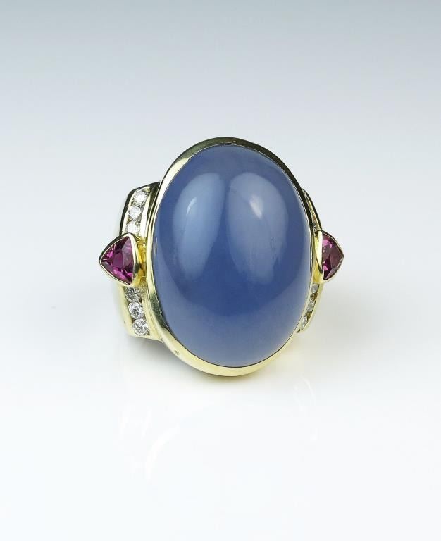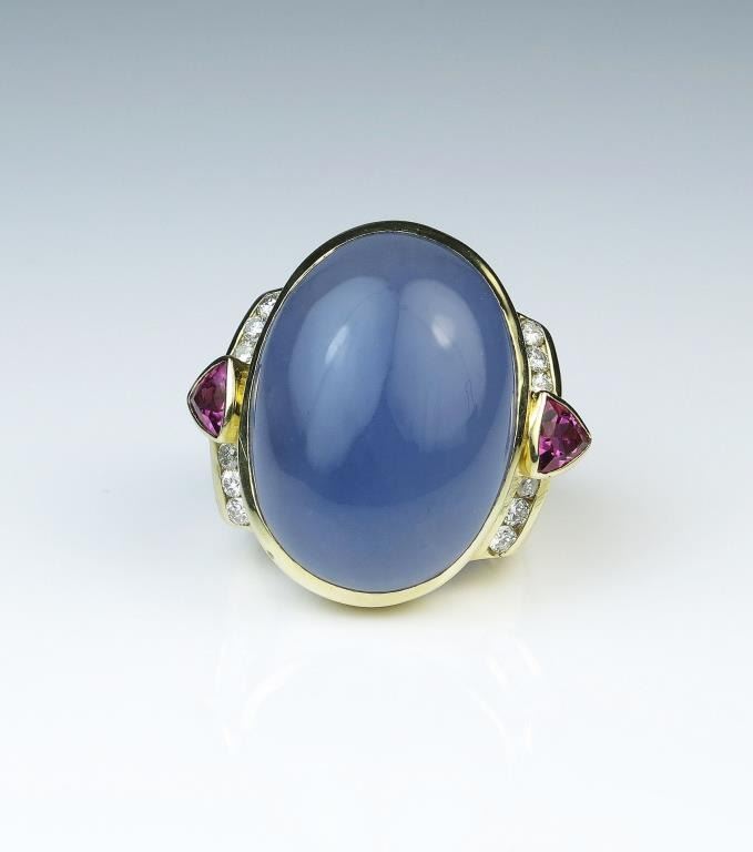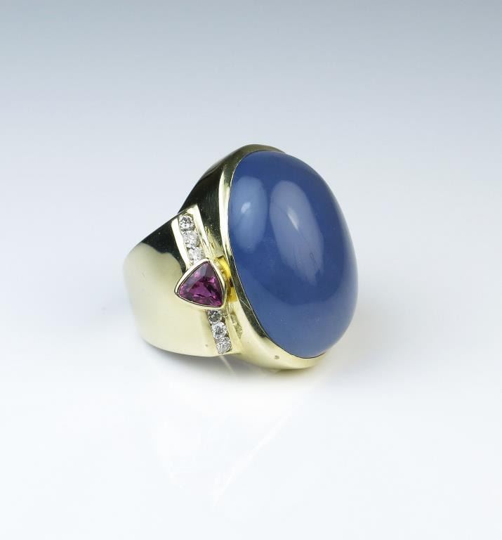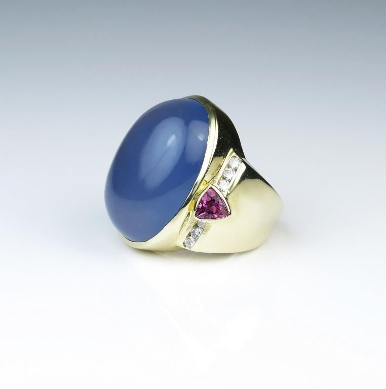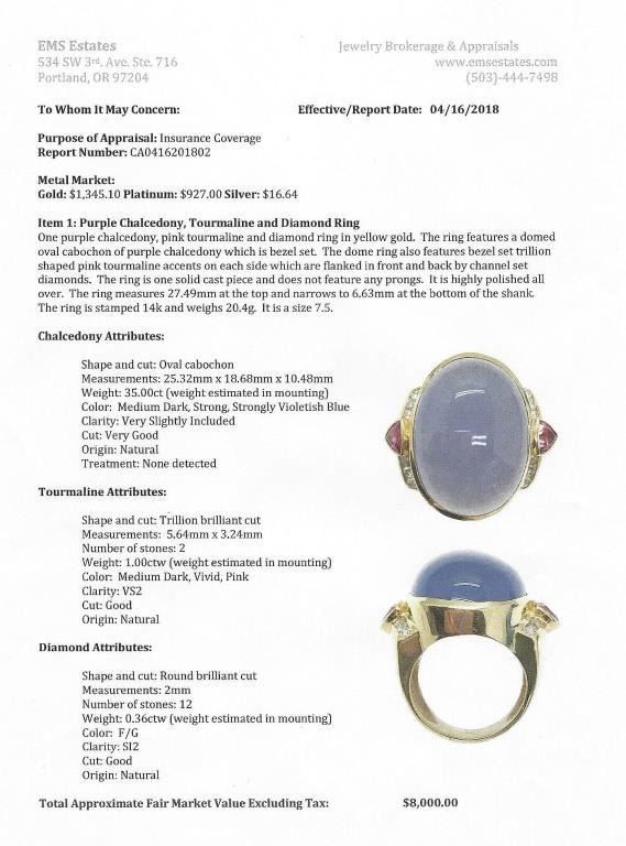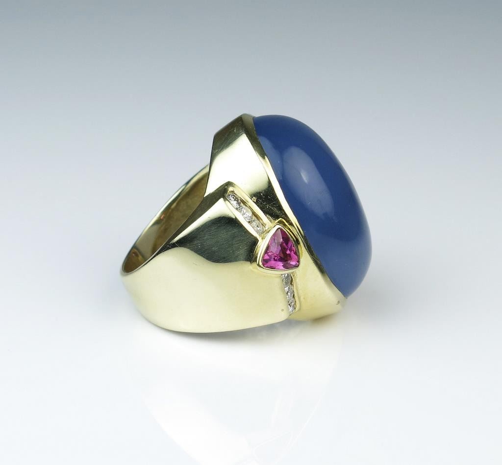 Unbelievable designer ring featuring a huge natural Chalcedony cabochon with lavender color weighing approx. 35.00 carats accented with 12 fine quality Diamonds and 2 trilliant cut pink Tourmalines in heavy 14 karat Lot Title yellow gold hallmarked stamped setting. Full Appraisal valued $8,000.00 Estimates $4,000-$6,000