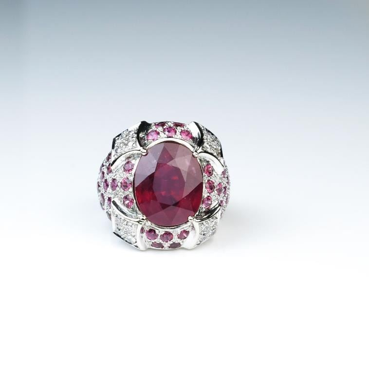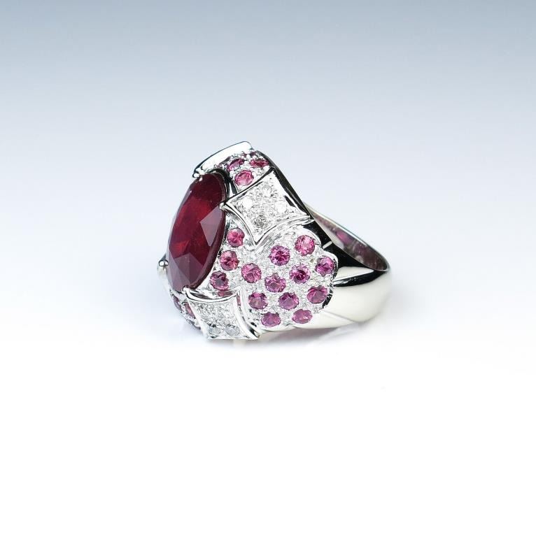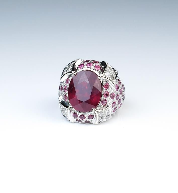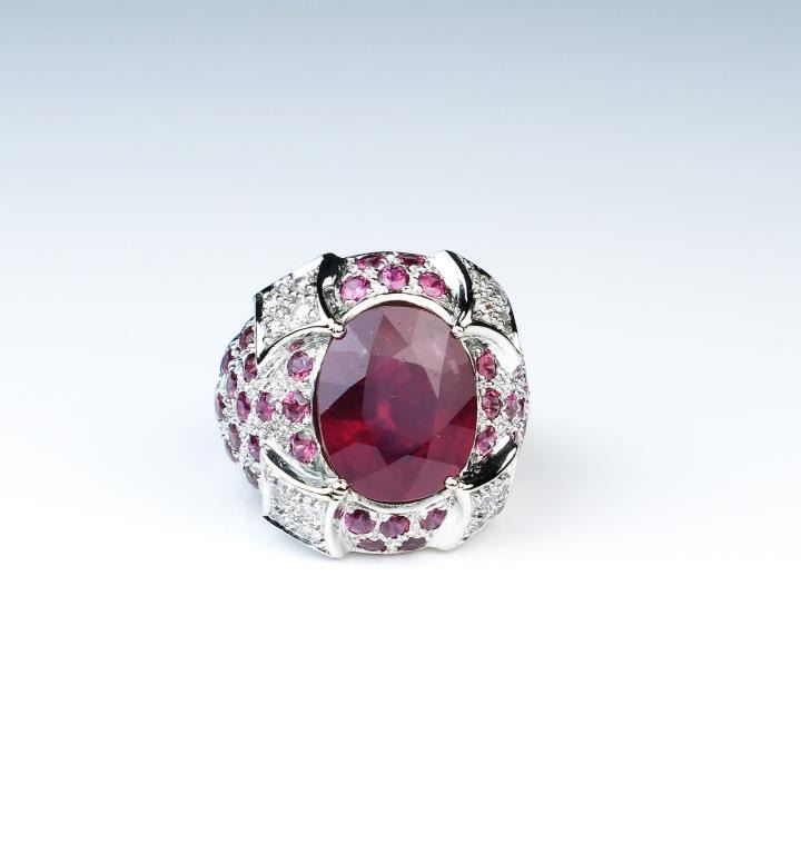 Extraordinary 9.07 carat Ruby and Diamond ring with dramatic designer styling setting with 38 fine Rubies weighing approx. 2.00 carats and 16 full cut Diamonds weighing approx. 0.80 carats with G-H colors and VS/SI Lot Title clarity custom crafted in 14 karat white gold. Retail $8,000-$12,000 Estimate $4,000-$6,000