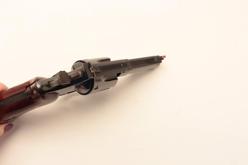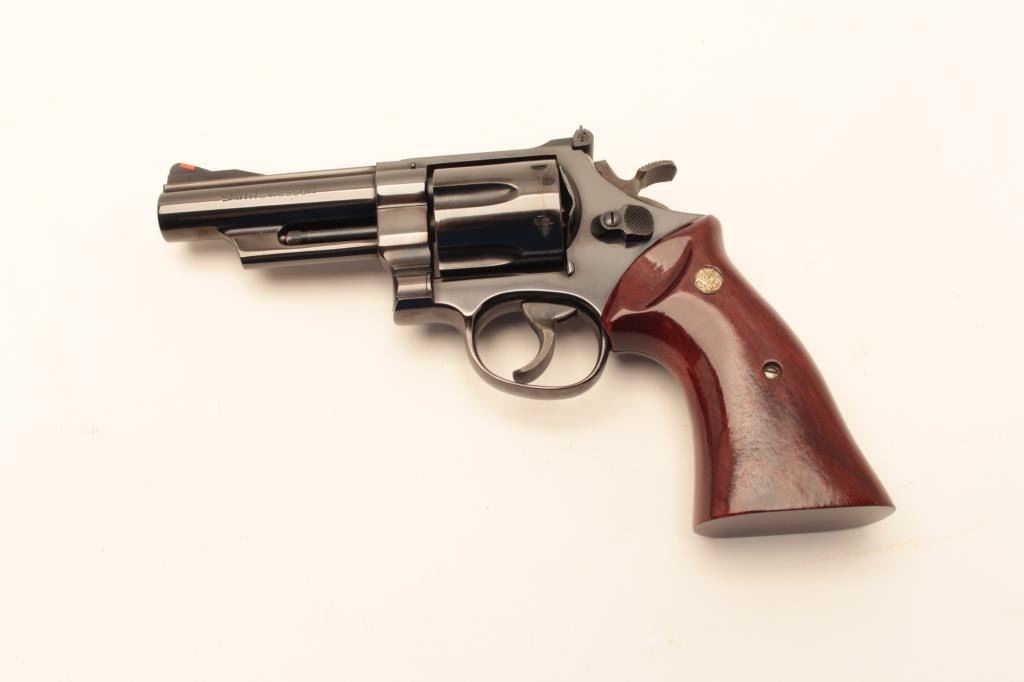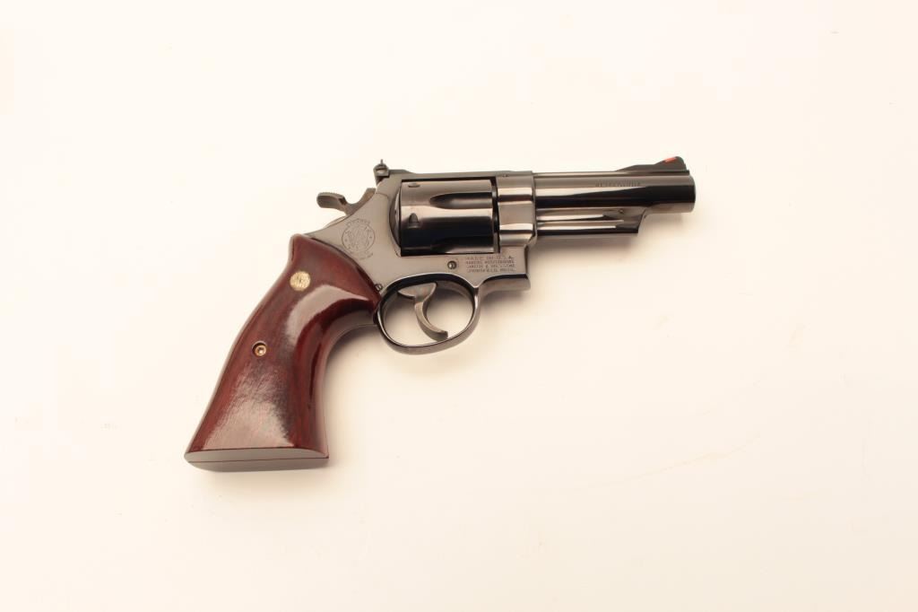 Smith & Wesson Model 57 Double Action revolver with a 4” barrel, target features, smooth wood medallion grips in presentation display case with tools. No dash and pinned barrel. 98%-99% plus showing minor use and Lot Title firing. (Modern/PPT) Est.: $750-$1500