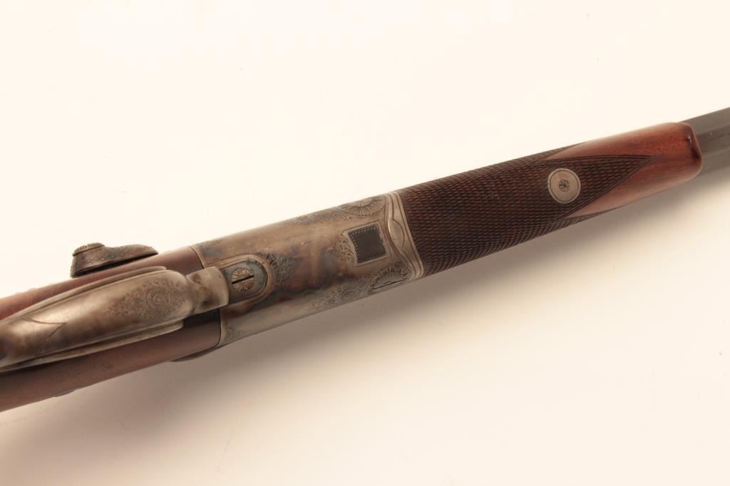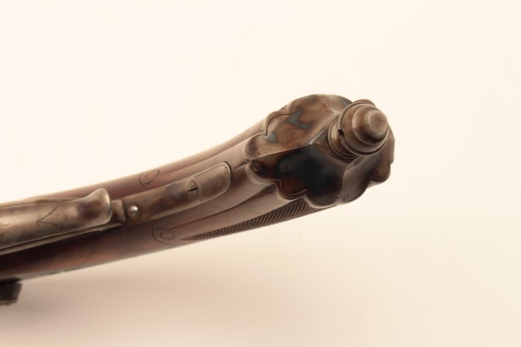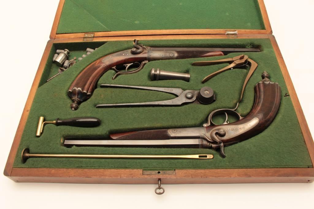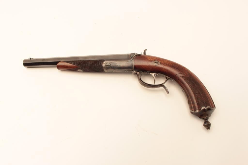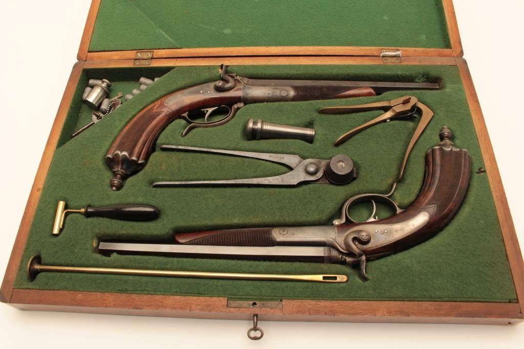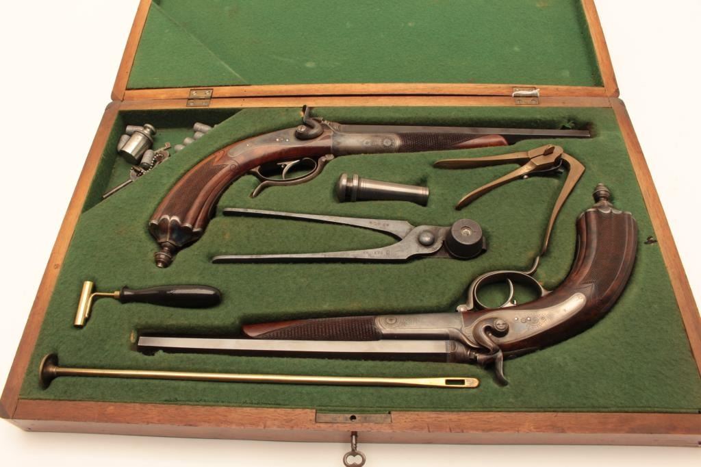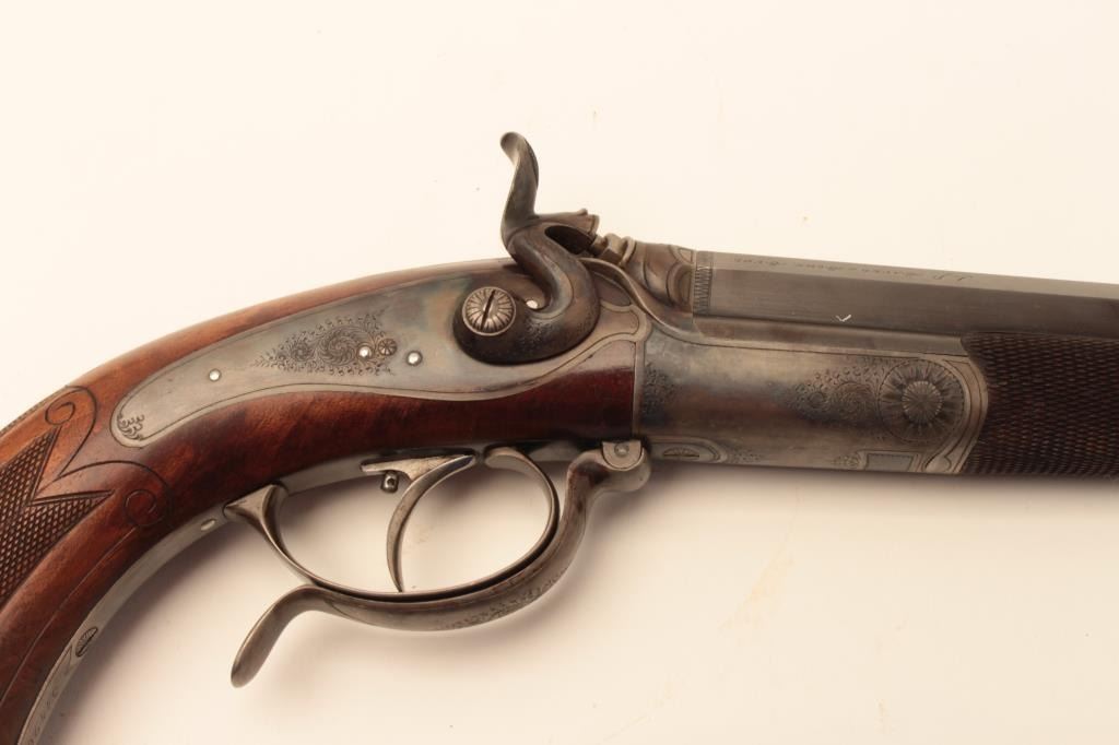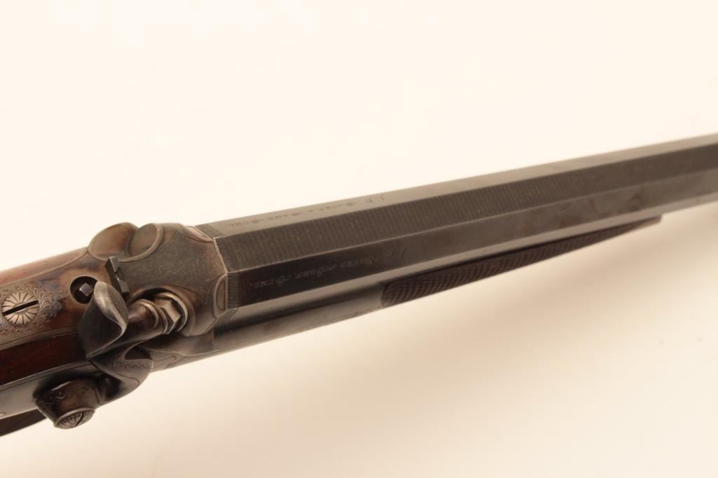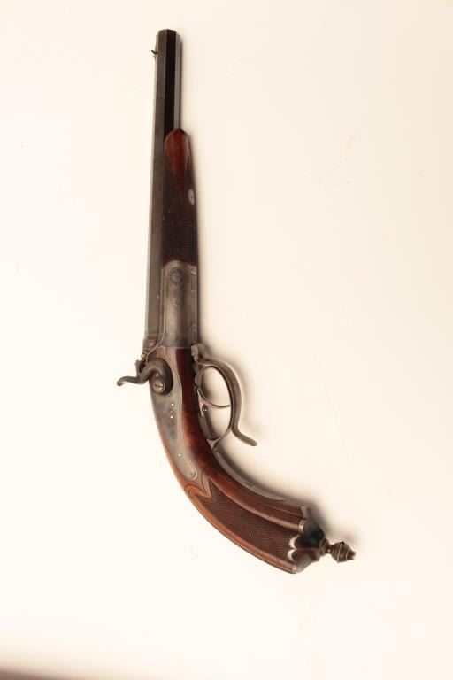 Pair of breach loading target pistols by J.P. Sauer and Sohn of Suhl, Germany in .44 Russian caliber cased with accessories. Note from Chuck Bradford (Pomona Gun Room) circa 1951 states purchased from Theodore Dexter in Lot Title 1932 for $72.50 and gives loading info. A check for $175 to Bradford dated Aug. 3, 1951 signed by Harold B. Polikinghorn, who was the Chief of Police in Riverside, California, purchasing just the pair. Polkinghorn was an Lot Title avid gun collector who sold the majority of his arms to the Wright family of Riverside who is our consignor. The pair measure 16” overall with a 9” medium weight octagon barrels and side locks. Fluted dueler style Lot Title butts, set triggers and release under trigger guard. Beautifully matted barrels with key adjustable sights. Checkered wood stocks. Fine to excellent condition with 95%-98% original finish and excellent close Lot Title checkering stocks. Cased in French style fitted case with green felt interior. A correct mold, rods, primer, sizing tool and sight adjustment key are included. The interior is very good plus to almost fine