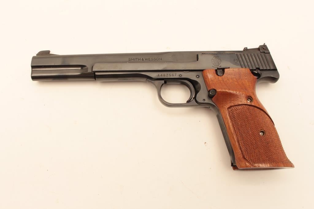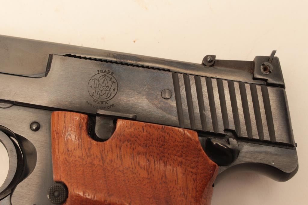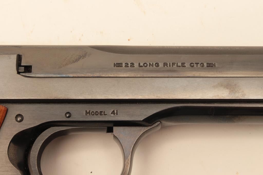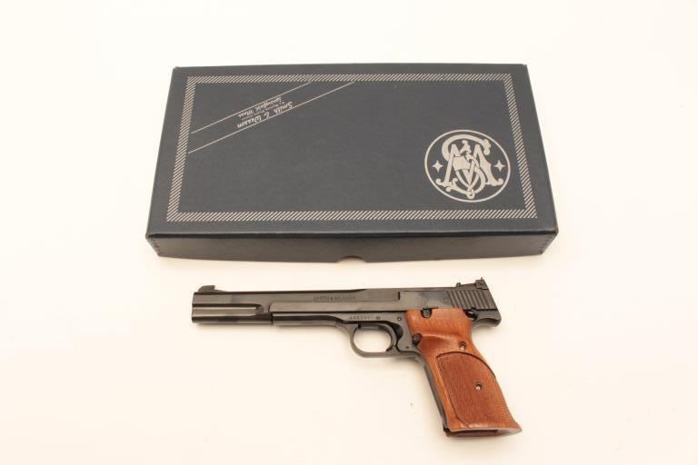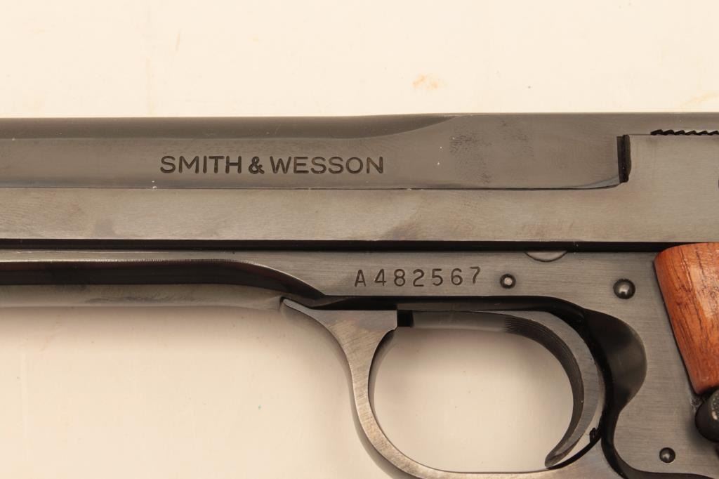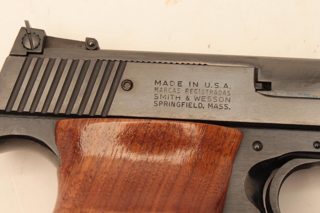 Smith & Wesson Model 41 .22 caliber Semi Auto Target Pistol, S/N A482567. Fine to excellent condition in original blue and silver box with extra mag. 98%-99% showing minor firing and slight use. (Modern/PPT) Lot Title Est.: $800-$1600