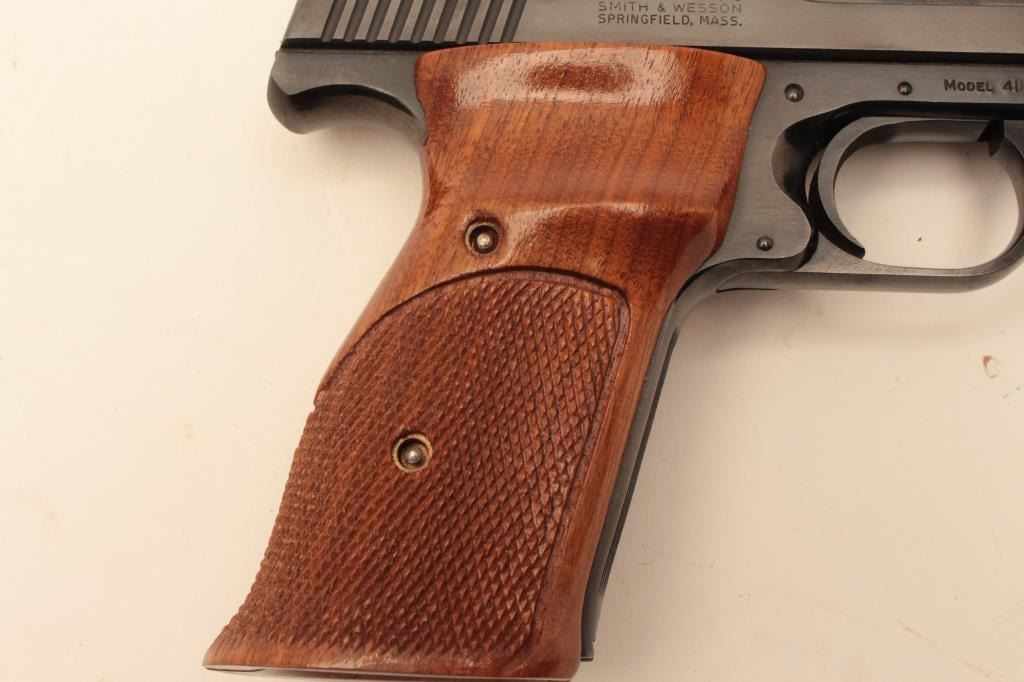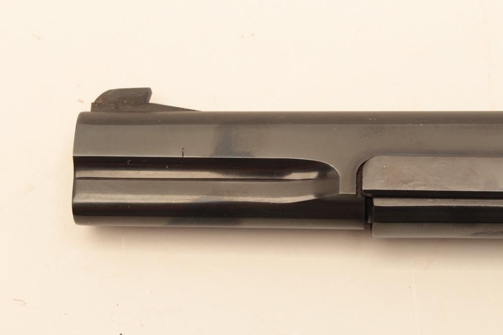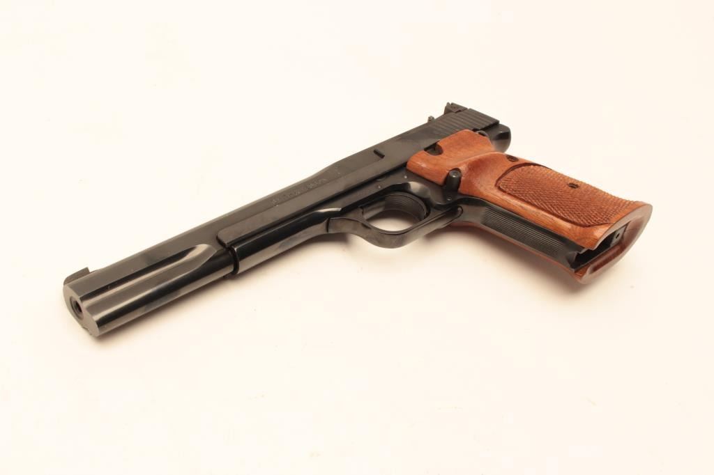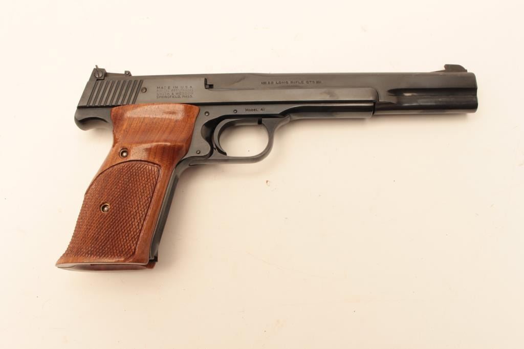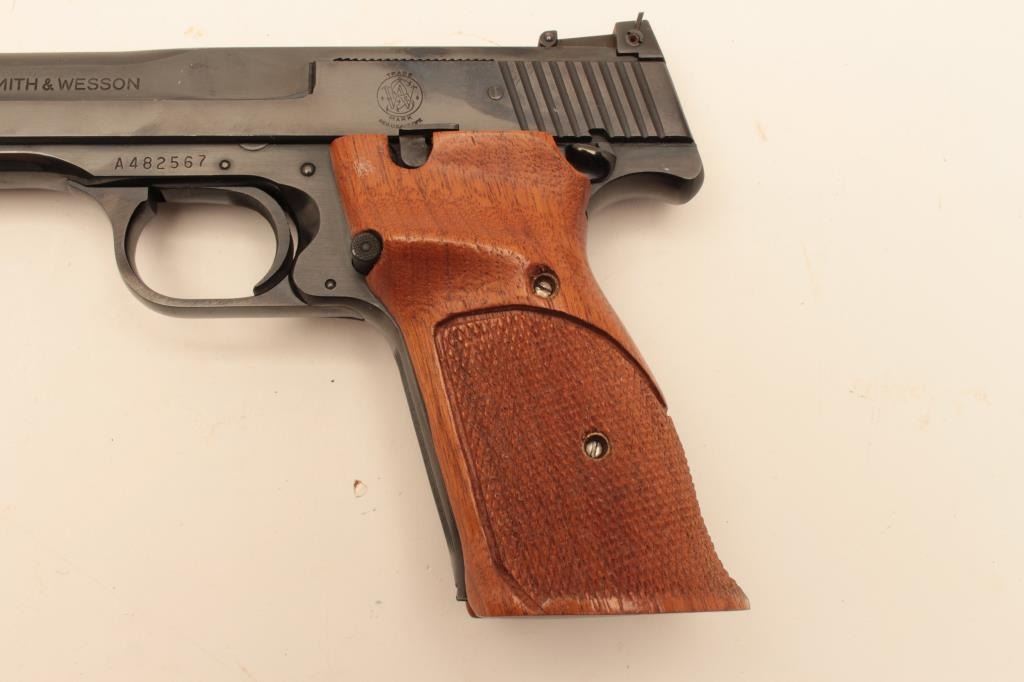 Smith & Wesson Model 41 .22 caliber Semi Auto Target Pistol, S/N A482567. Fine to excellent condition in original blue and silver box with extra mag. 98%-99% showing minor firing and slight use. (Modern/PPT) Lot Title Est.: $800-$1600