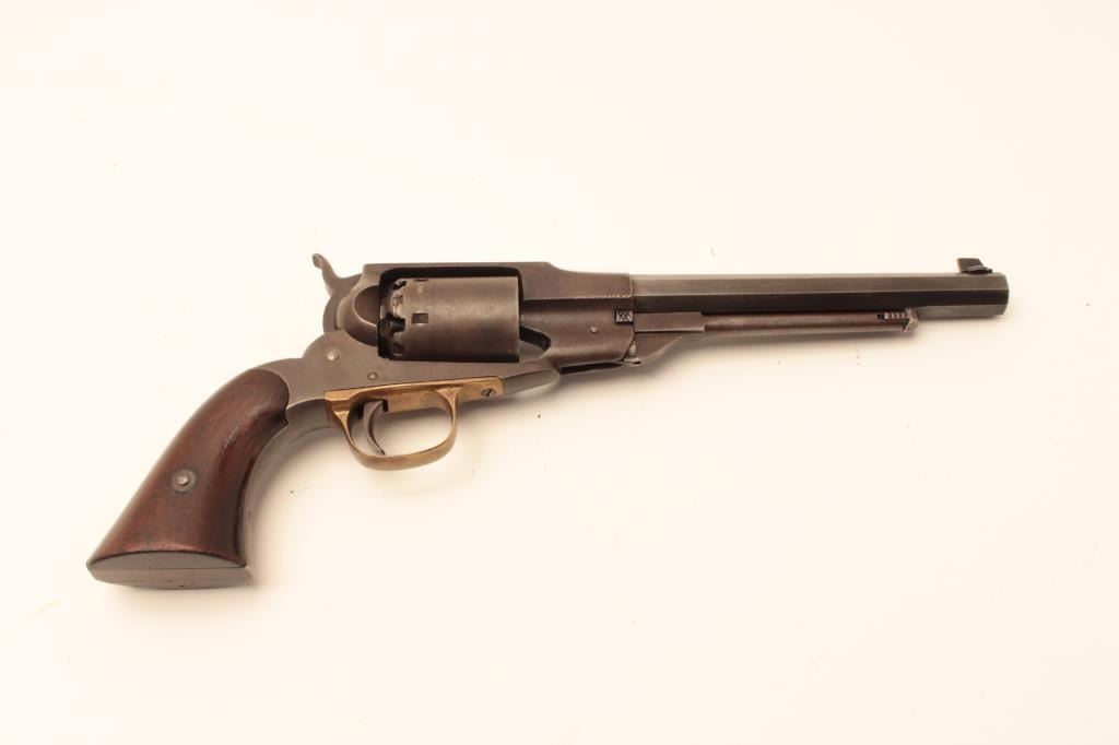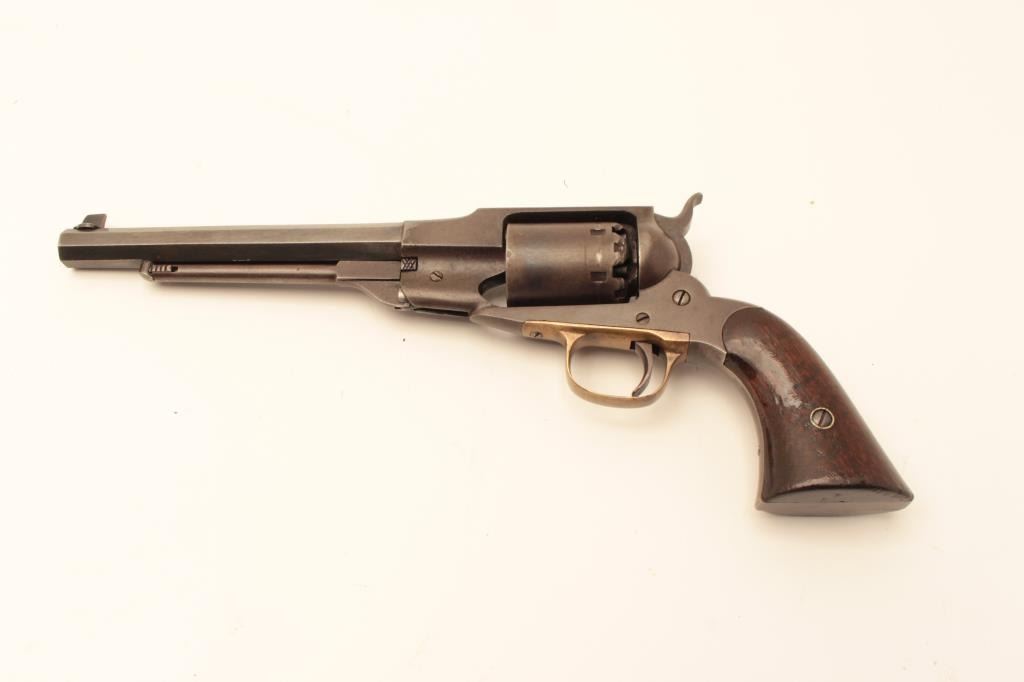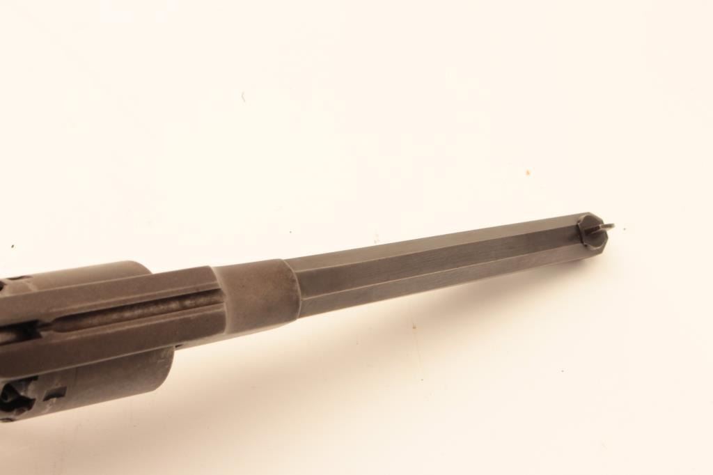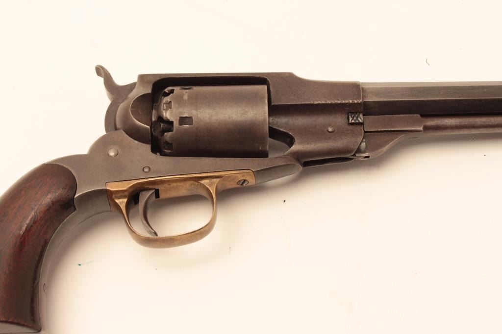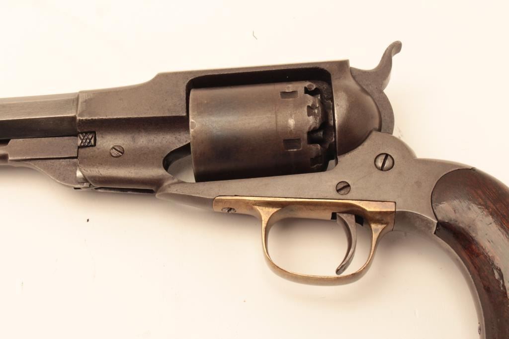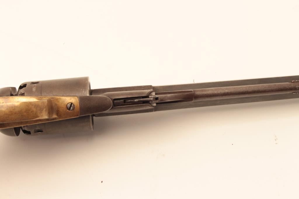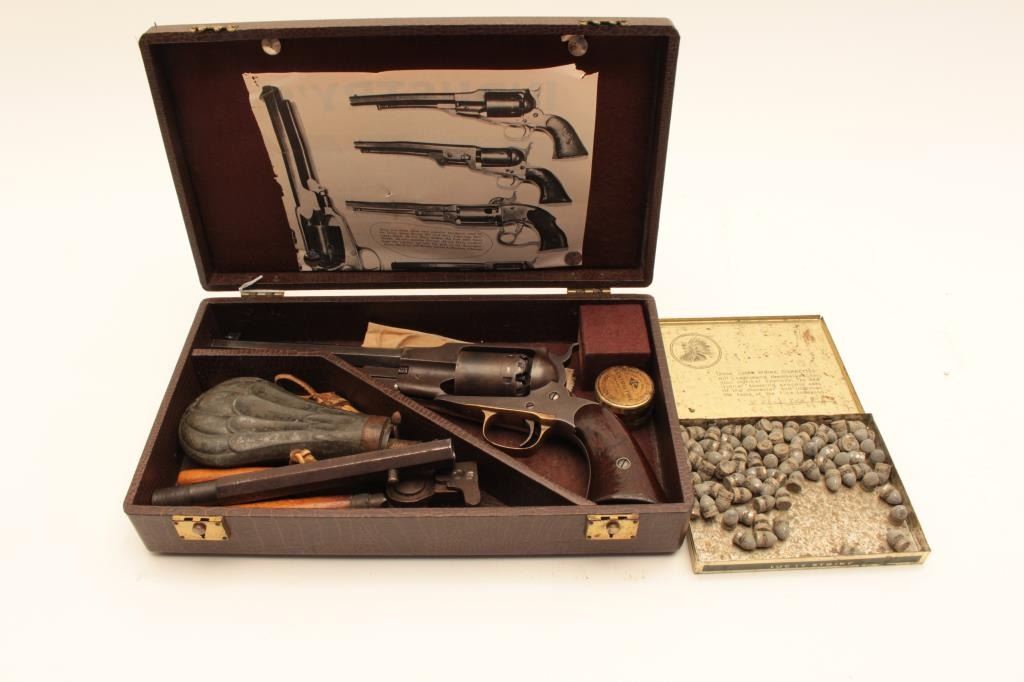 Remington Beals Navy in .36 caliber percussion, S/N 5894 fitted with extra replacement barrel for shooting. The bore of original barrel has been polished out to smoothbore. The original barrel shows good Lot Title address and brown patina overall. The grips are lightly refinished and good. In 1950s shooter case with flaks and mold. Good action. (Antique) Est.: $600-$1200