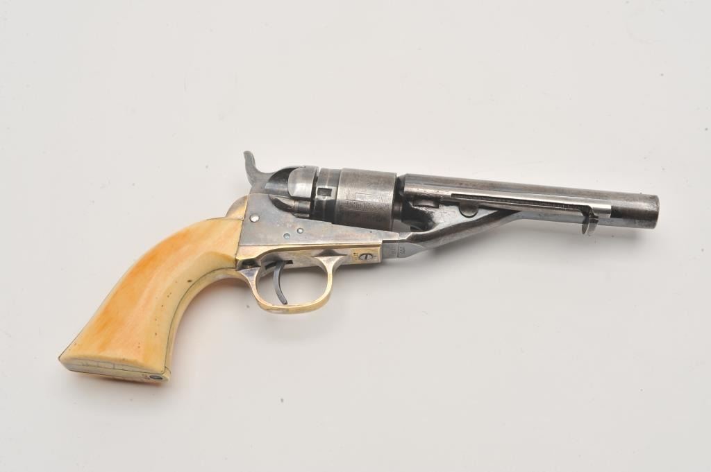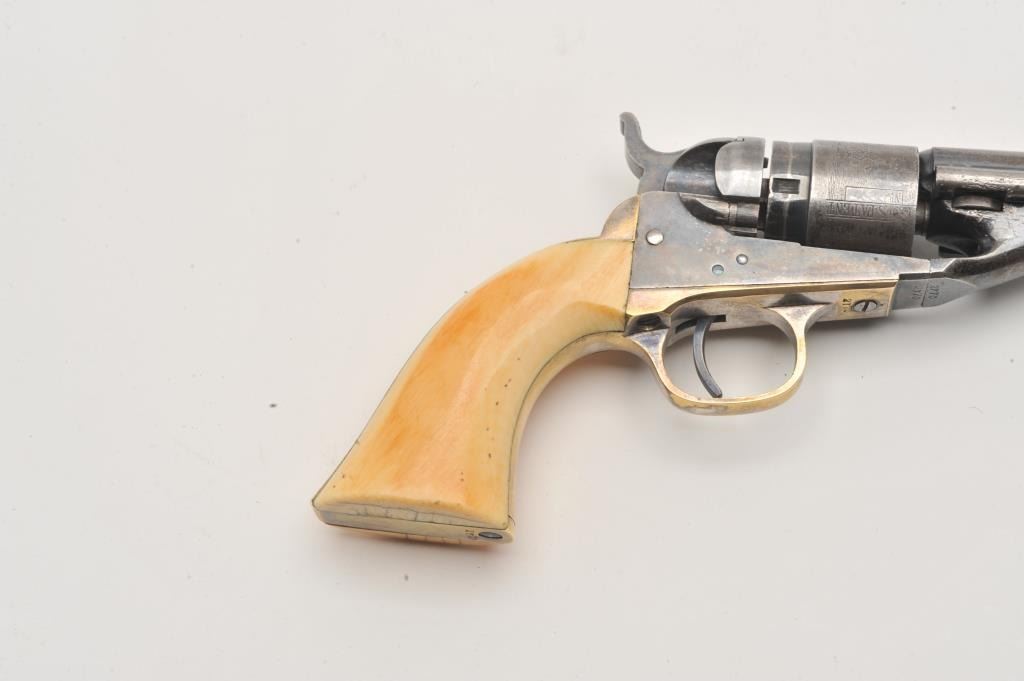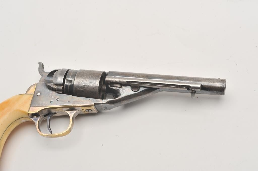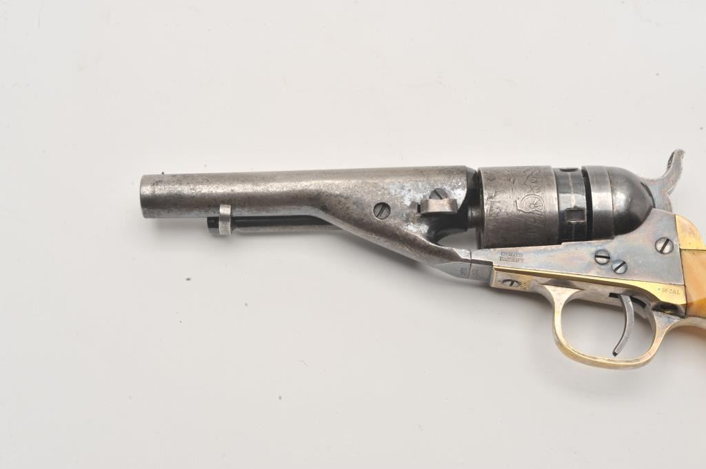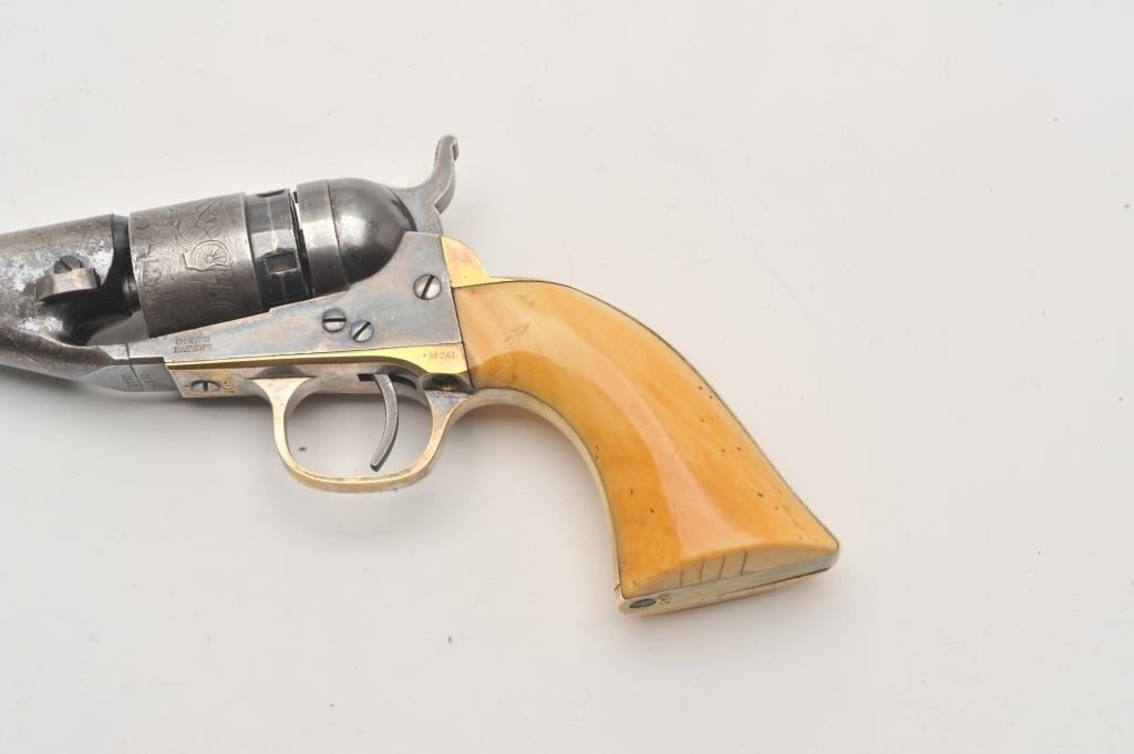 Colt 1862 Police Conversion to .38 rimfire with a 4 ½” “plugged” barrel, no patent dates, ejector rod and housing added, S/N 2770 serialized in its own range. This revolver retains considerable original blue Lot Title and case hardened finish with original ivory grips. The barrel and cylinder retains 30%-50% drifted blue going to patina with minor erosion where the finish has lifted. 75%-85% cylinder scene remains. 70%-80% Lot Title colorful case hardening remains on the frame and hammer. Traces of silver on the straps. The grips are very good plus with mellow natural age, minor age cracks and good fit. The action is good with bright bore. Lot Title (Antique) Est.: $800-$1600