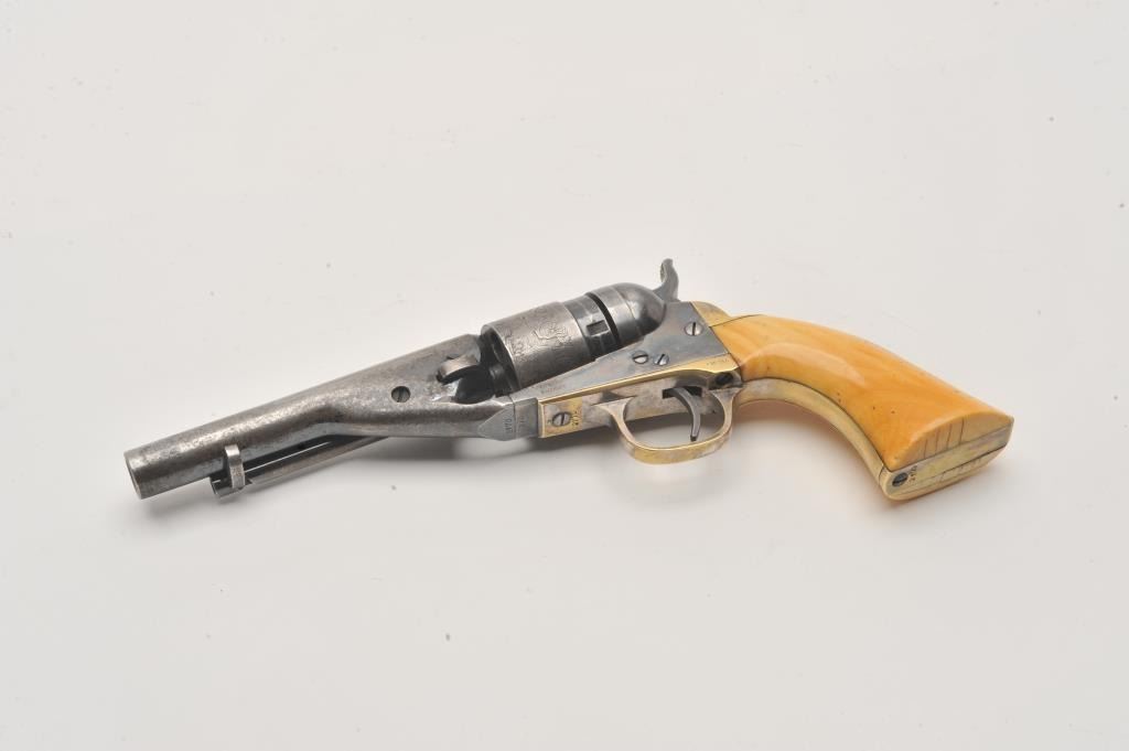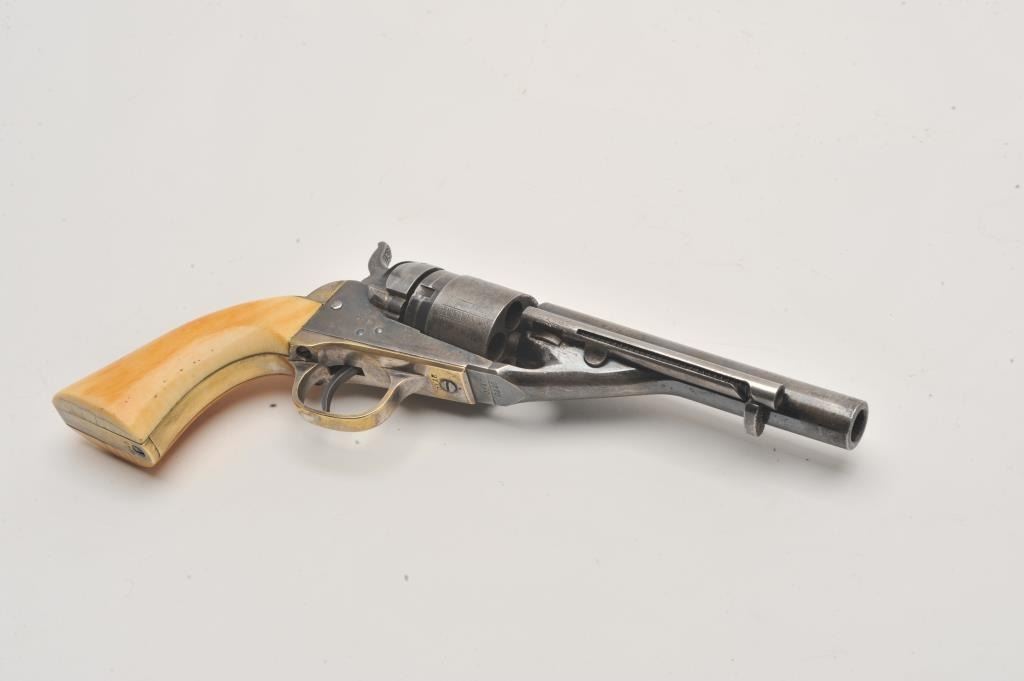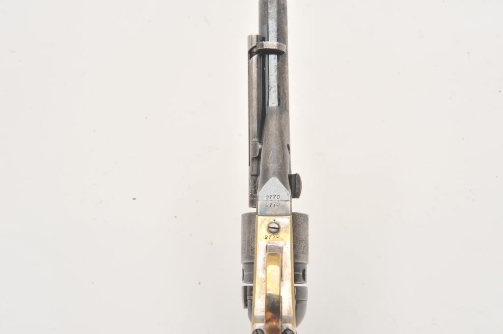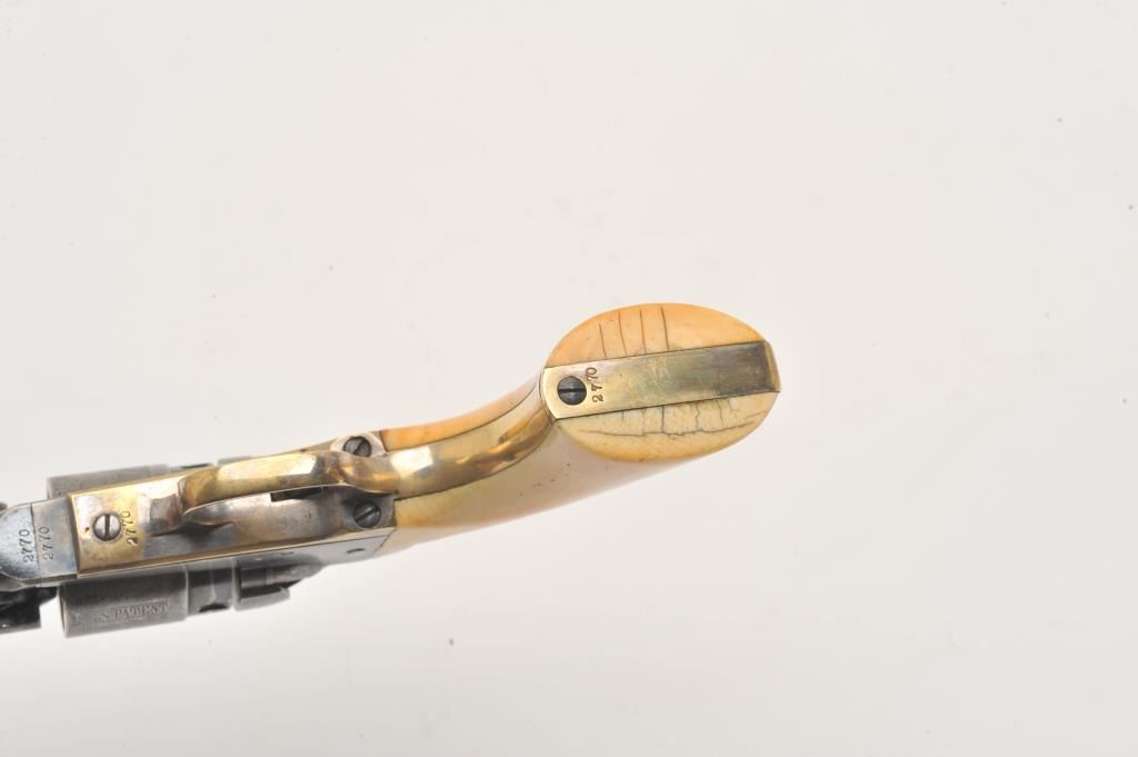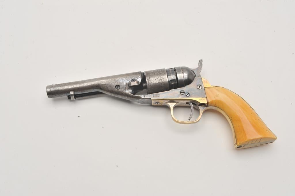 Colt 1862 Police Conversion to .38 rimfire with a 4 ½” “plugged” barrel, no patent dates, ejector rod and housing added, S/N 2770 serialized in its own range. This revolver retains considerable original blue Lot Title and case hardened finish with original ivory grips. The barrel and cylinder retains 30%-50% drifted blue going to patina with minor erosion where the finish has lifted. 75%-85% cylinder scene remains. 70%-80% Lot Title colorful case hardening remains on the frame and hammer. Traces of silver on the straps. The grips are very good plus with mellow natural age, minor age cracks and good fit. The action is good with bright bore. Lot Title (Antique) Est.: $800-$1600