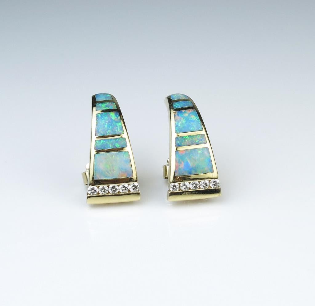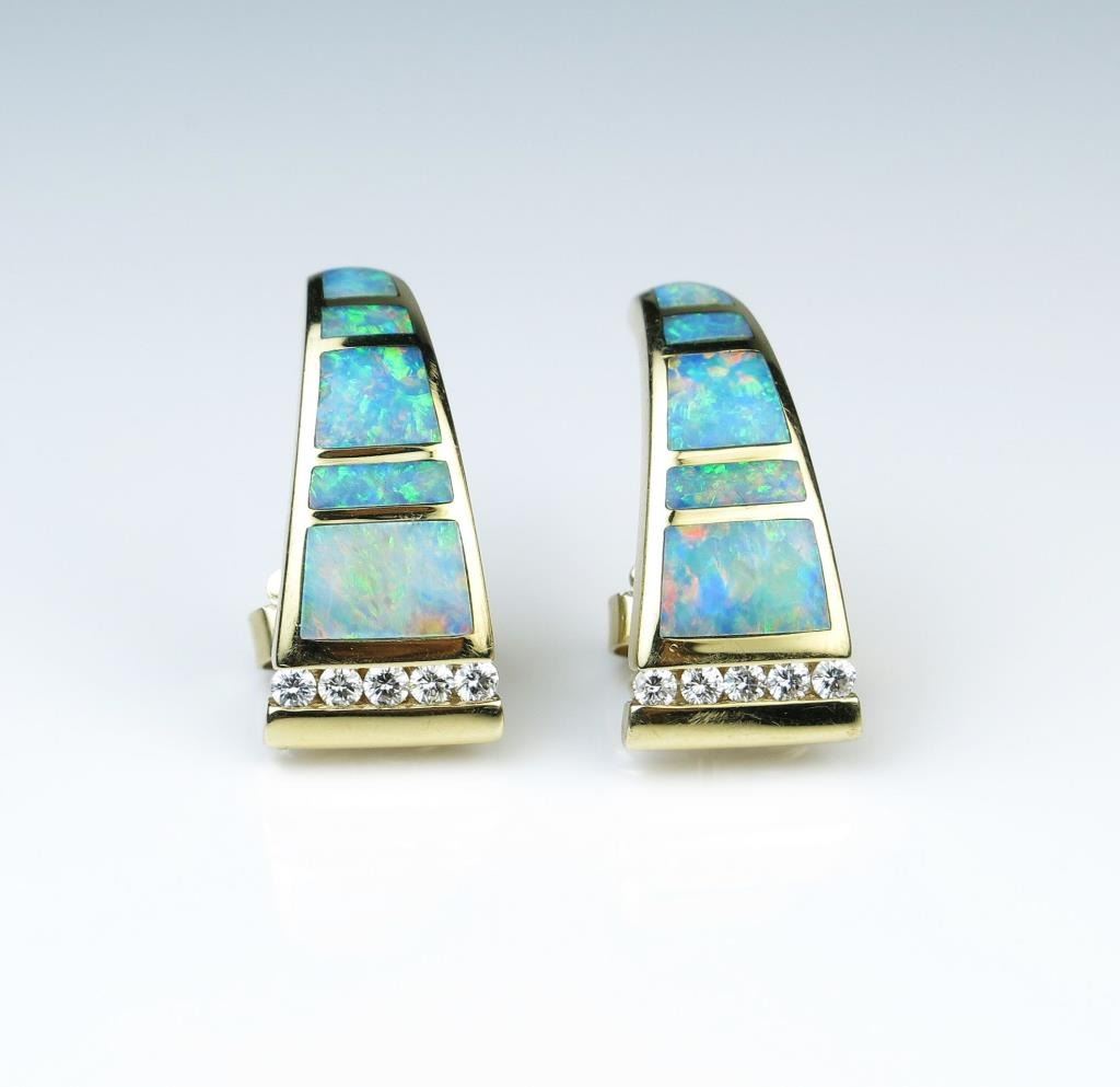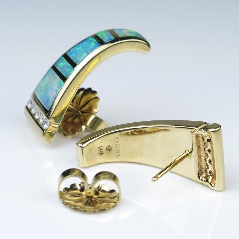 Gorgeous High Quality ‘KABANA’ earrings featuring 10 fine Black Opal inlay and 10 ‘IDEAL’ cut Diamonds of F-G colors and VS clarity set in custom made 14 karat yellow gold settings. Retail $4,000-$5,000 Lot Title Estimates $2,000-$3,000