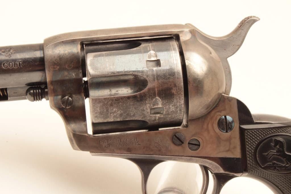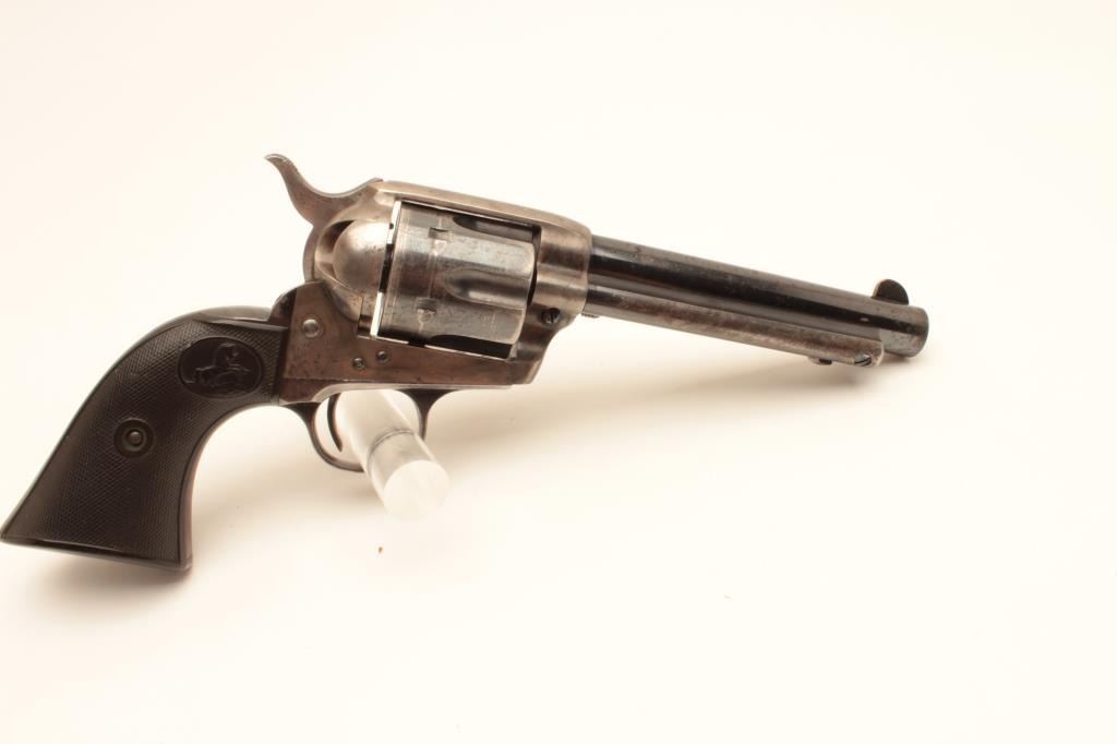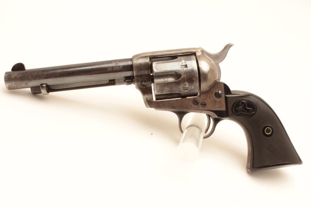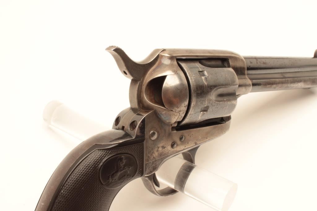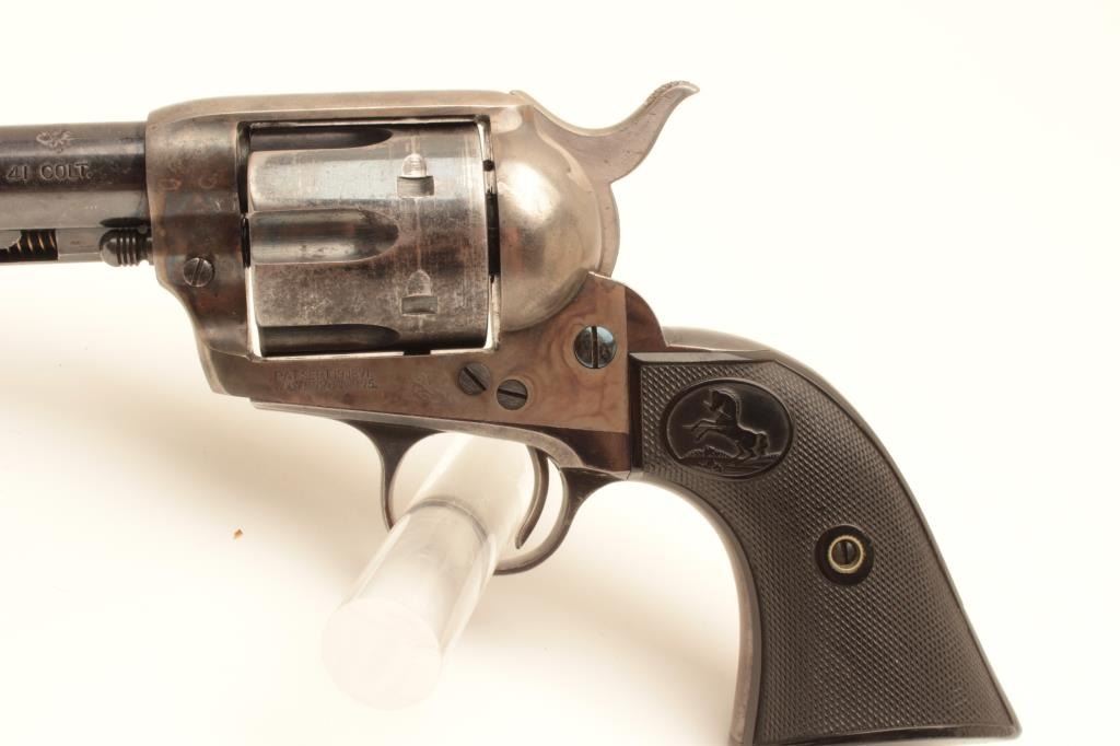 Colt Single Action Army Revolver in .41 L.C. Caliber with a 51/2” barrel, blue and case color finish, hard rubber grips, S/N 281437. 50%-70% blue and case colors with losses at the high points, edges and muzzle from Lot Title holstering and use. Good markings and sharp address. All matching. The grips are very good plus with fairly sharp checkering. The front sight is its full height. Some very bright areas of finish where protected. Some Lot Title pitting on the barrel probably from holster. Later replaced hammer with polished sides and excellent bore. The action is excellent as rebuilt. (C&R/PPT) Est.: $1400-$2800