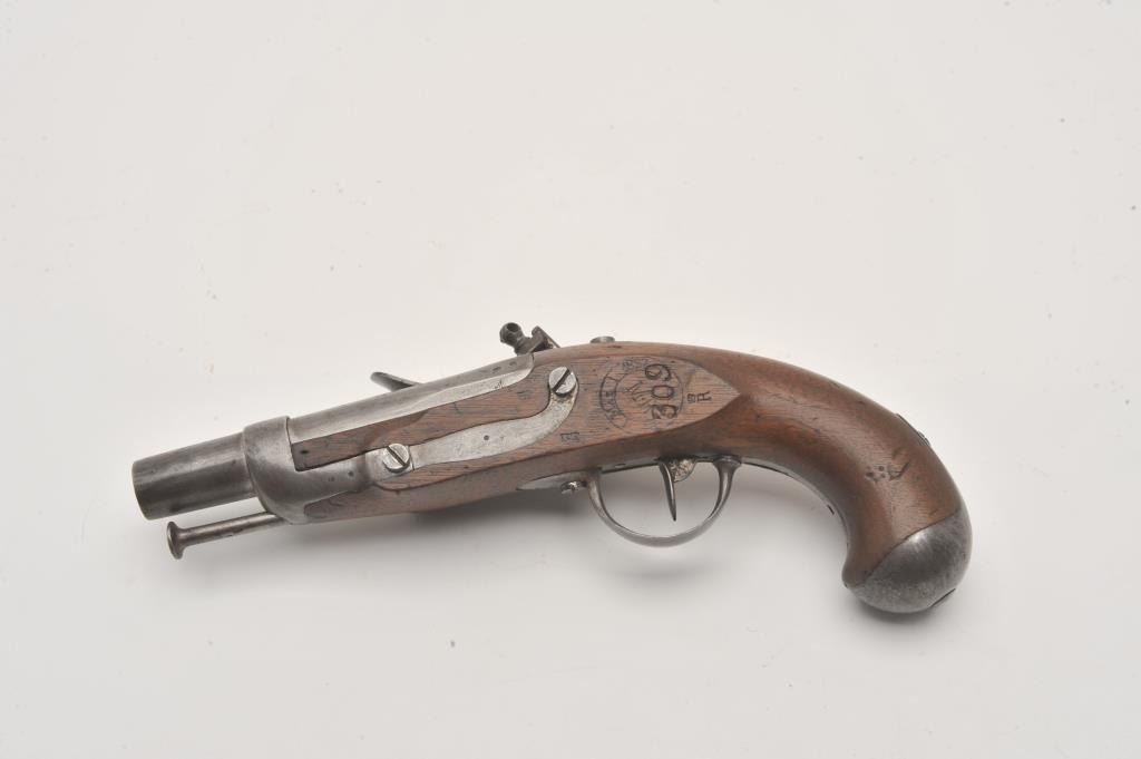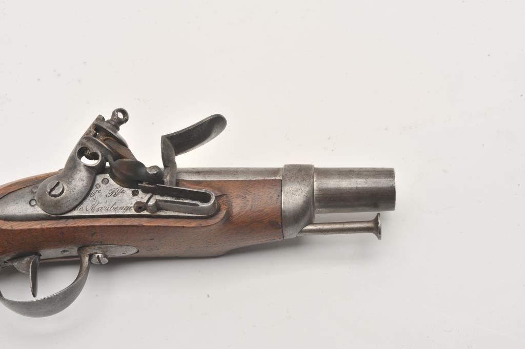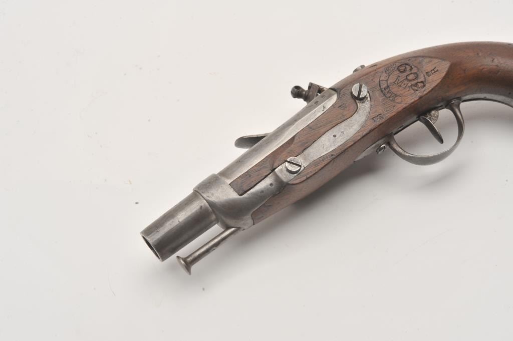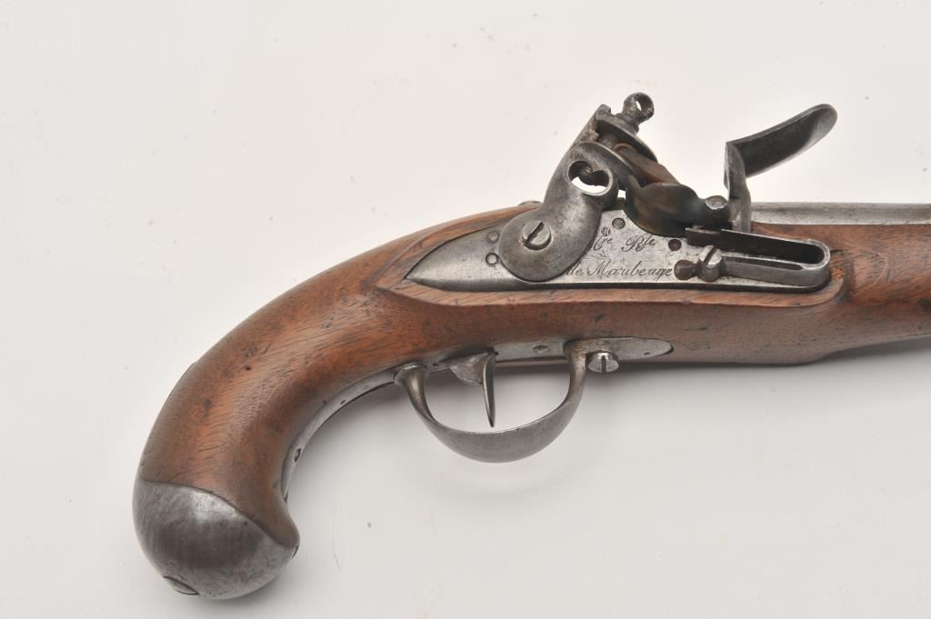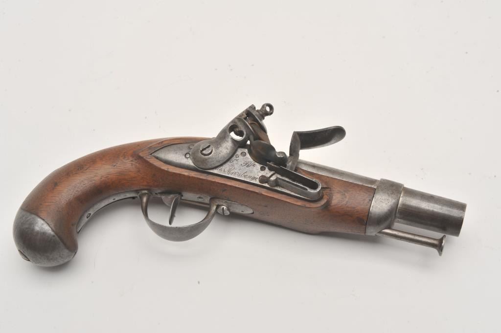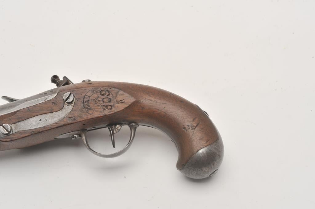 French Model 1822 Gerndarme flintlock pistol in near fine condition with manufacture Royale De Mauberge on the lock. The stock is dated 1827 in fine cartouche and shows side plate that attaches to the fore end cap. All Lot Title original small parts with slight erosion on near excellent metal. The stocks are almost fine with a couple small chips missing. .60 caliber smoothbore. Measures 9 7/8” overall. (Antique) Est.: $350-$700