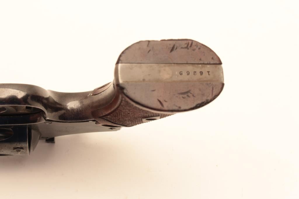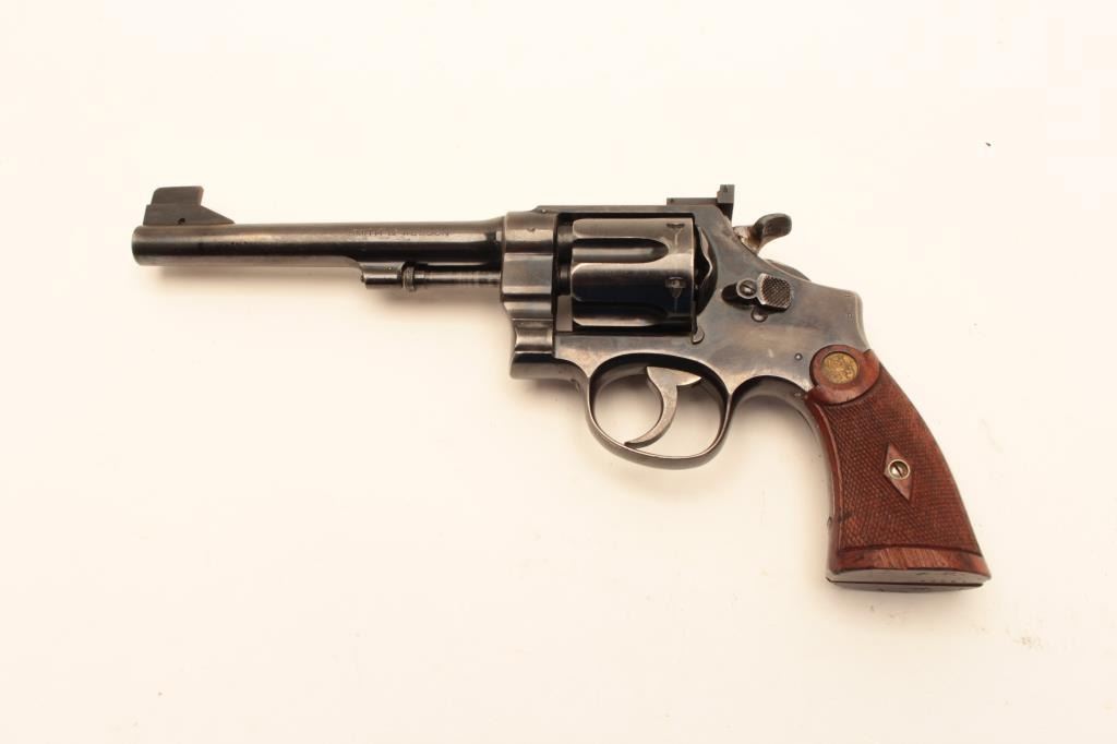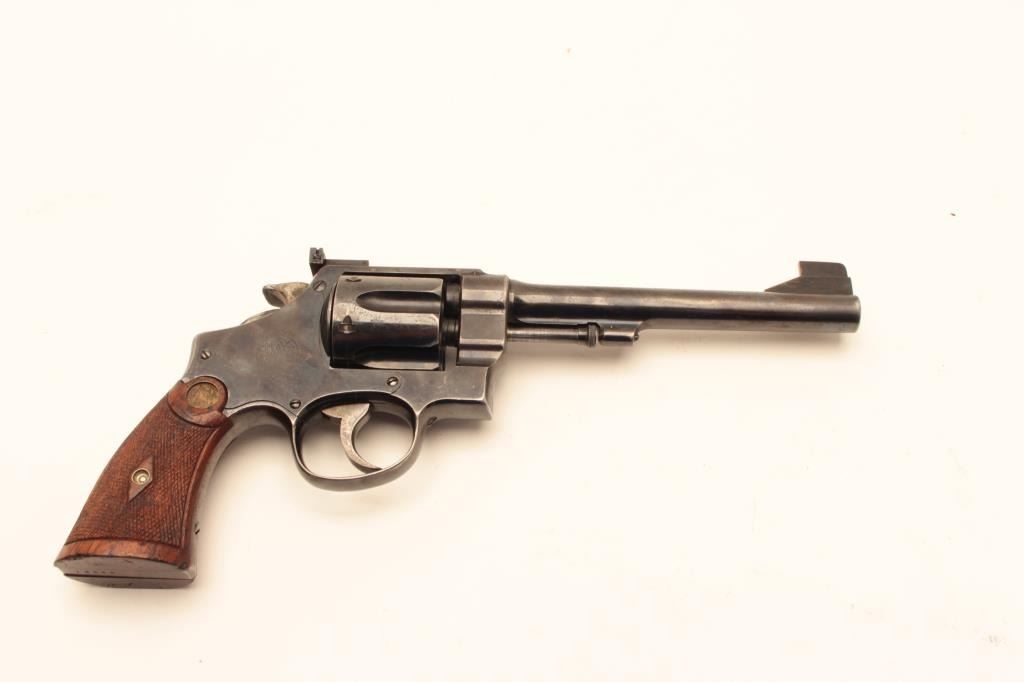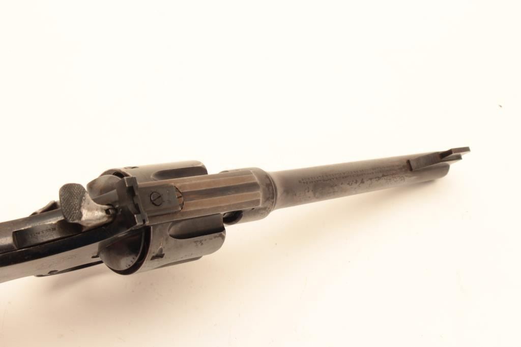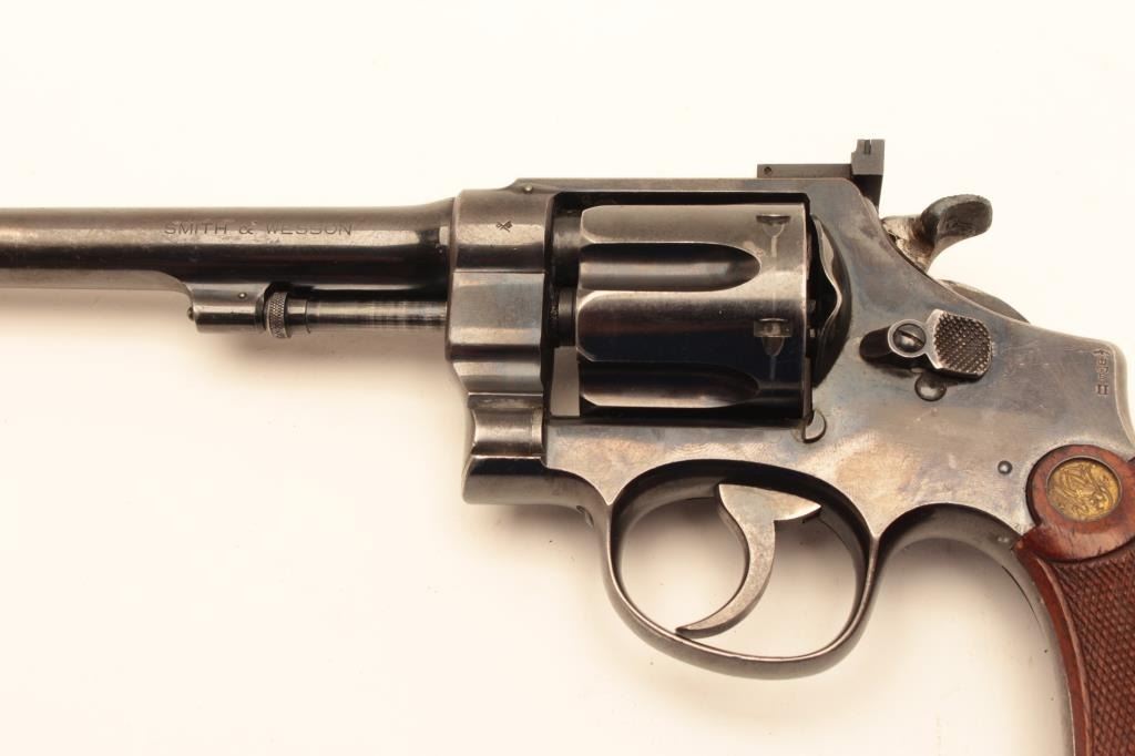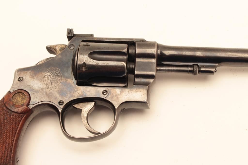 Smith & Wesson 2nd Model Hand Ejector with a 6 ½” barrel, Canadian proofs, blued finish, and checkered wood medallion grips, originally .455 but bored out to .45 L.C., S/N 16269. Shooter sights have been added and Lot Title the hammer crudely offset like king. Great action and locks up tight. Good to very good bore. Est.: $350-$700