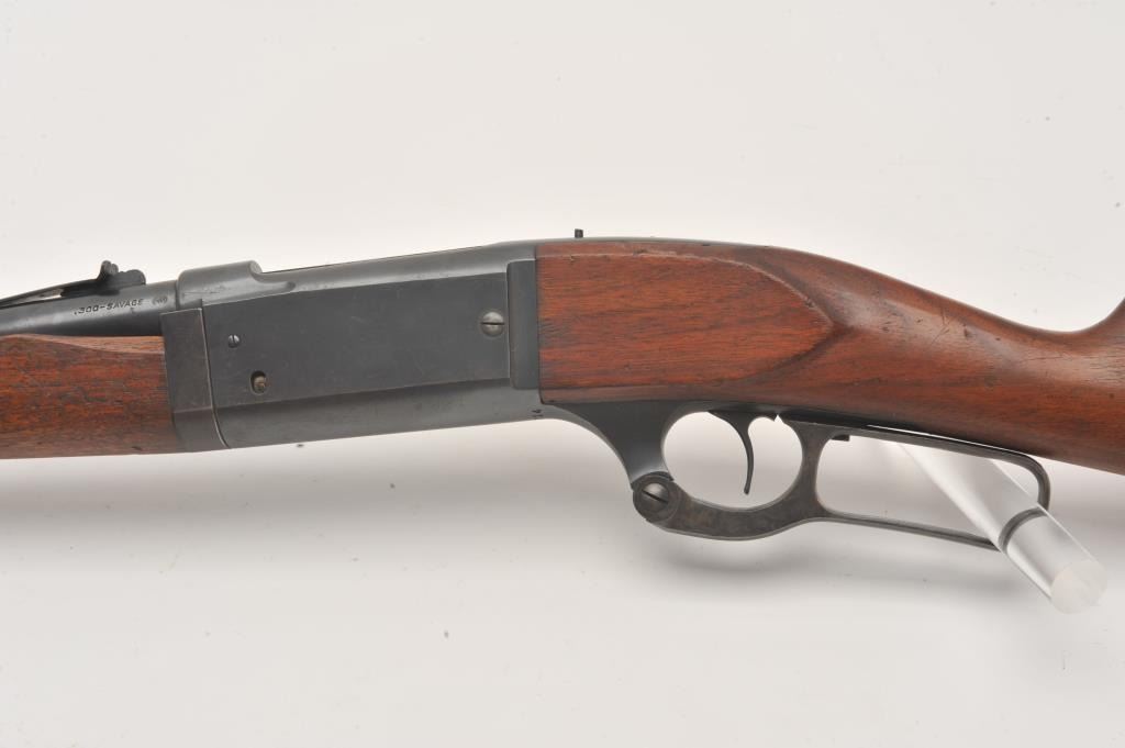 Savage Model 99 takedown in .300 savage caliber, S/N 291714. 50%-70% blue turning plum finish. The stocks are good and cleaned with steel wool so the finish is missing. Large chip to the left side on fore end from Lot Title takedown. The action is tight and the bore is bright. (C&R) Est.: $350-$700